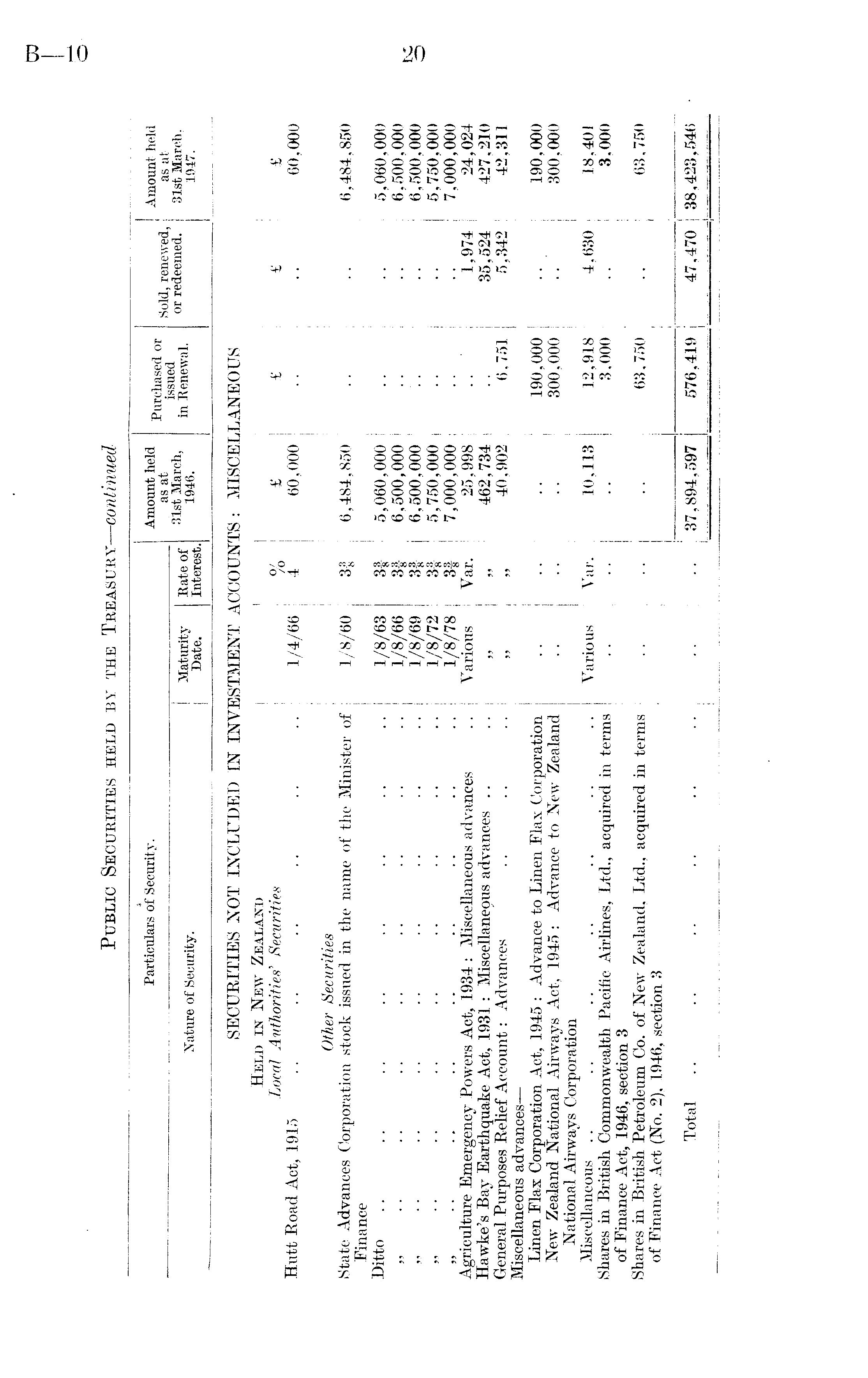 Particulars of Security. Amount held as at 31st March, 1946. Purchased or issued in Renewal. Sold, renewed, or redeemed. Amount held as at 31st March. 1947. Nature of Security. Maturity Date. Bate of Interest. SECURITIES NOT INCLUDED IN INV] Held in New Zealand Local Authorities'' Securities Hutt Road Act, 1915 Other Securities State Advances Corporation stock issued in the name of the Minister of Finance Ditto Agriculture Emergency Powers Act, 1934 : Miscellaneous advances Hawke's Bay Earthquake Act, 1931 : Miscellaneous advances General Purposes Relief Account: Advances Miscellaneous advances — Linen Flax Corporation Act, 1945 : Advance to Linen Flax Corporation New Zealand National Airways Act, 1945 : Advance to New Zealand National Airways Corporation Miscellaneous Shares in British Commonwealth Pacific Airlines, Ltd., acquired in terms of Finance Act, 1946, section 3 Shares in British Petroleum Co. of New Zealand, Ltd., acquired in terms of Finance Act (No. 2), 1946, section 3 Total SSTMENT A 1/4/66 1/8/60 1/8/63 1/8/66 1/8/69 1/8/72 1/8/78 Various Various CCOUN i % 4 3| 3f 3f 3f 3f 3f Var. Var. TS: MISCEL £ 60,000 6,484,850 5,060,000 6,500,000 6,500,000 5,750,000 7,000,000 25,998 462,734 40,902 10,113 LANEOUS £ 6,751 190,000 300,000 12,918 3,000 63,750 £ i ,974 35,524 5,342 4,630 £ 60,000 6,484,850 5,060,000 6,500,000 6,500,000 5,750,000 7,000,000 24,024 427,210 42,311 190,000 300,000 18,401 3,000 63,750 . 37,894,597 576,419 47,470 38,423,546
