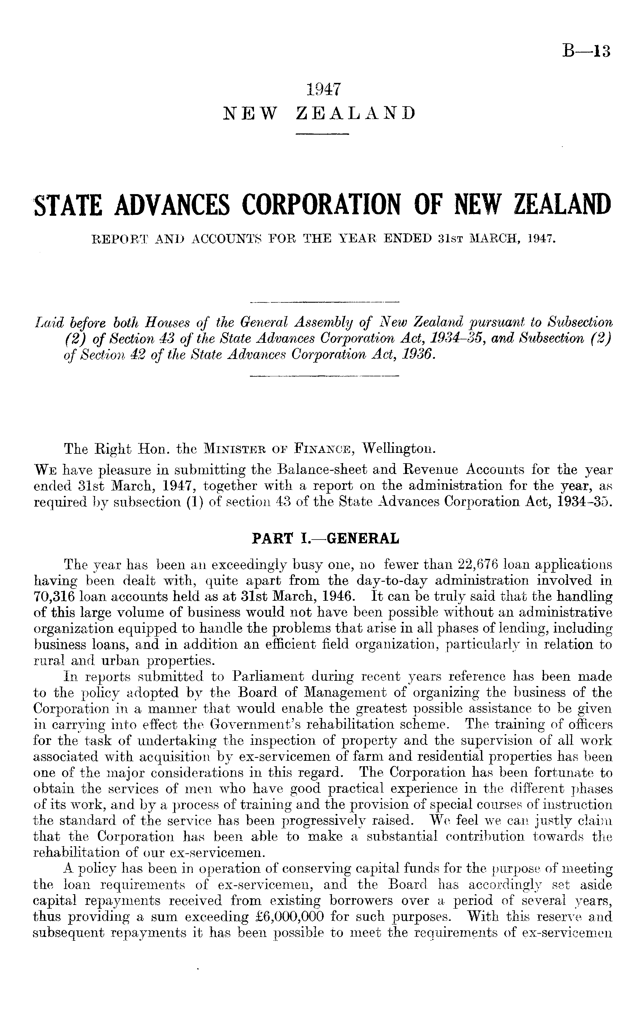The Right Hon. the Minister or Finance, Wellington. We have pleasure in submitting the Balance-sheet and Revenue Accounts for the year ended 31st March, 1947, together with a report on the administration for the year, as required by subsection (1) of section 43 of the State Advances Corporation Act, 1934-35. PART I.—GENERAL The year has been an exceedingly busy one, no fewer than 22,676 loan applications having been dealt with, quite apart from the day-to-day administration involved in 70,316 loan accounts held as at 31st March, 1946. It can be truly said that the handling of this large volume of business would not have been possible without an administrative organization equipped to handle the problems that arise in all phases of lending, including business loans, and in addition an efficient field organization, particularly in relation to rural and urban properties. In reports submitted to Parliament during recent years reference has been made to the policy adopted by the Board of Management of organizing the business of the Corporation in a manner that would enable the greatest possible assistance to be given in carrying into effect the Government's rehabilitation scheme. The training of officers for the task of undertaking the inspection of property and the supervision of all work associated with acquisition by ex-servicemen of farm and residential properties has been one of the major considerations in this regard. The Corporation has been fortunate to obtain the services of men who have good practical experience in the different phases of its work, and by a process of training and the provision of special courses of instruction the standard of the service has been progressively raised. We feel we can justly claim that the Corporation has been able to make a substantial contribution towards the rehabilitation of our ex-servicemen. A policy has been in operation of conserving capital funds for the purpose of meeting the loan requirements of ex-servicemen, and the Board has accordingly set aside capital repayments received from existing borrowers over a period of several years, thus providing a sum exceeding £6,000,000 for such purposes. With this reserve and subsequent repayments it has been possible to meet the requirements of ex-servicemen