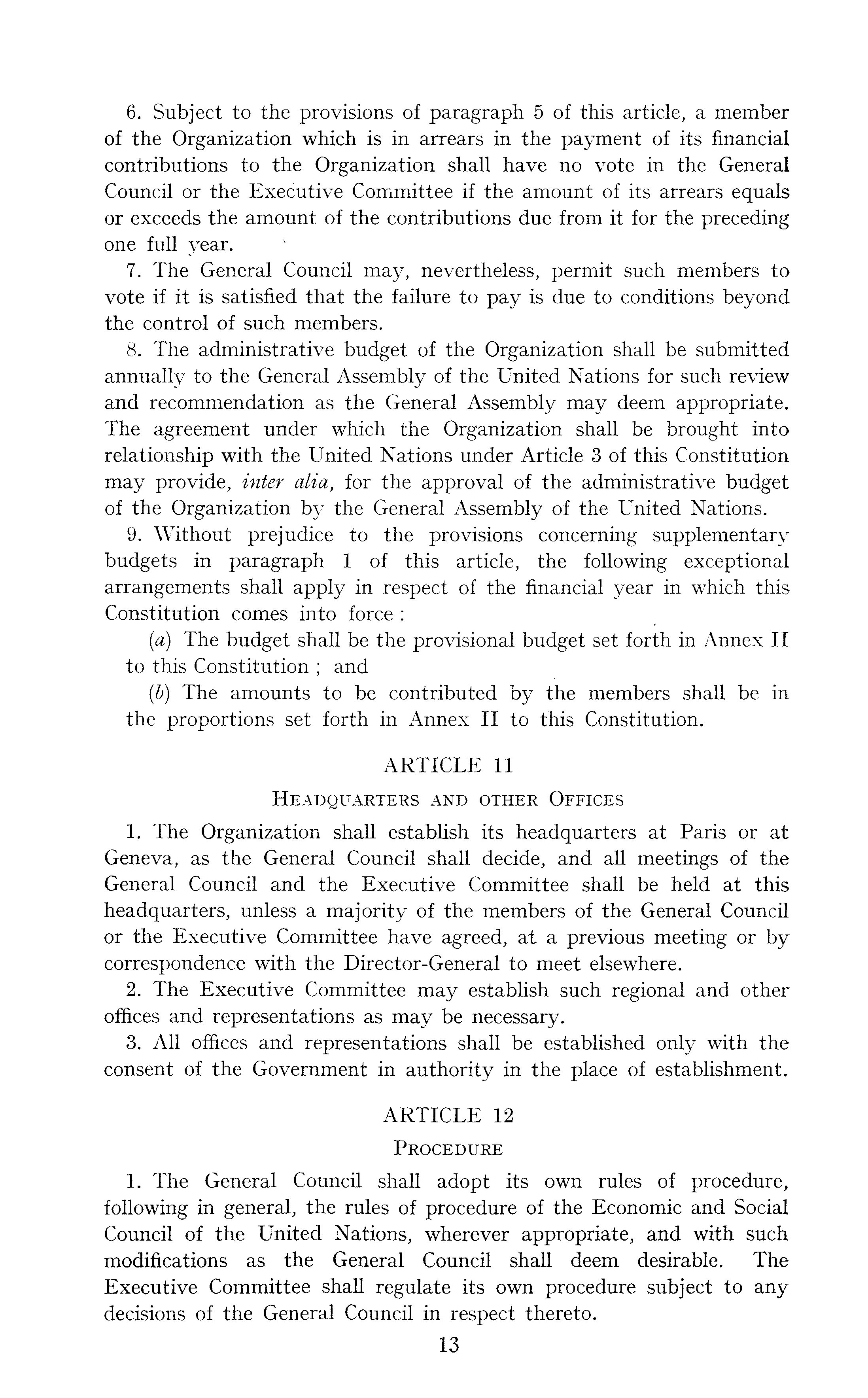 6. Subject to the provisions of paragraph 5 of this article, a member of the Organization which is in arrears in the payment of its financial contributions to the Organization shall have no vote in the General Council or the Executive Committee if the amount of its arrears equals or exceeds the amount of the contributions due from it for the preceding one full year. 7. The General Council may, nevertheless, permit such members to vote if it is satisfied that the failure to pay is due to conditions beyond the. control of such members. 8. The administrative budget of the Organization shall be submitted annually to the General Assembly of the United Nations for such review and recommendation as the General Assembly may deem appropriate. The agreement under which the Organization shall be brought into relationship with the United Nations under Article 3 of this Constitution may provide, inter alia, for the approval of the administrative budget of the Organization by the General Assembly of the United Nations. 9. Without prejudice to the provisions concerning supplementary budgets in paragraph 1 of this article, the following exceptional arrangements shall apply in respect of the financial year in which this Constitution comes into force : (a) The budget shall be the provisional budget set forth in Annex II to this Constitution ; and (5) The amounts to be contributed by the members shall be in the proportions set forth in Annex II to this Constitution. ARTICLE 11 Headquarters and other Offices 1. The Organization shall establish its headquarters at Paris or at Geneva, as the General Council shall decide, and all meetings of the General Council and the Executive Committee shall be held at this headquarters, unless a majority of the members of the General Council or the Executive Committee have agreed, at a previous meeting or by correspondence with the Director-General to meet elsewhere. 2. The Executive Committee may establish such regional and other offices and representations as may be necessary. 3. All offices and representations shall be established only with the consent of the Government in authority in the place of establishment. ARTICLE 12 Procedure 1. The General Council shall adopt its own rules of procedure, following in general, the rules of procedure of the Economic and Social Council of the United Nations, wherever appropriate, and with such modifications, as the General Council shall deem desirable. The Executive Committee shall regulate its own procedure subject to any decisions of the General Council in respect thereto.