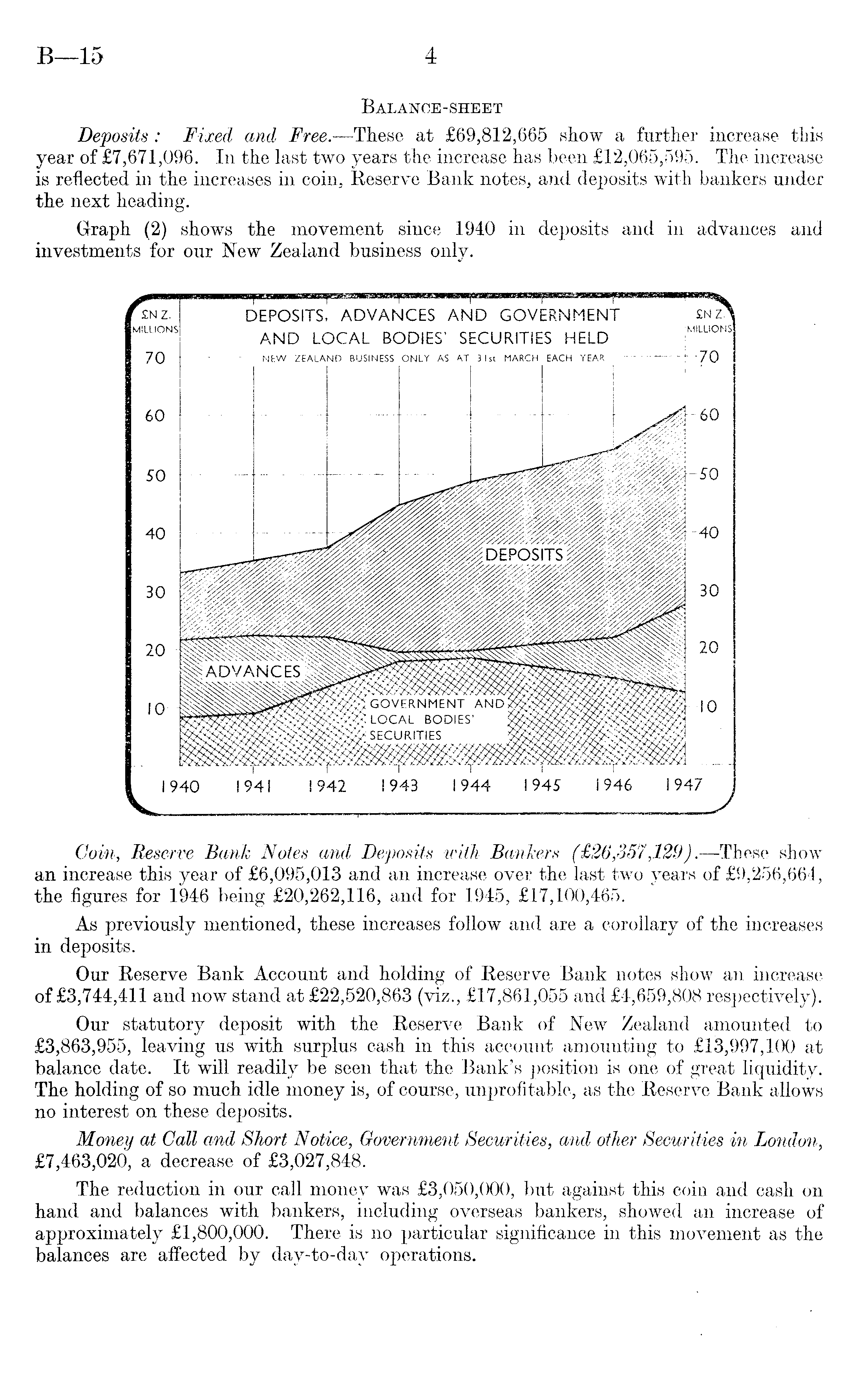 Balance-sheet Deposits : Fixed and Free. —These at £69,812,665 show a further increase this year of £7,671,096. In the last two years the increase has been £12,065,595. The increase is reflected in the increases in coin, Reserve Bank notes, and deposits with bankers under the next heading. Graph (2) shows the movement since 1940 in deposits and in advances and investments for our New Zealand business only.