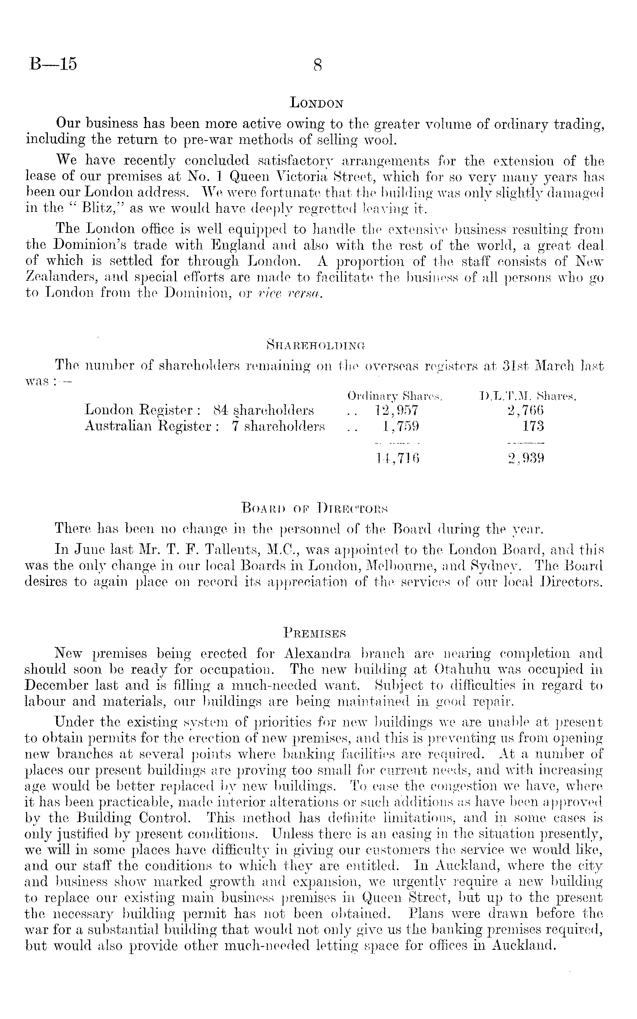 London Our business has been more active owing to the greater volume of ordinary trading, including the return to pre-war methods of selling wool. We have recently concluded satisfactory arrangements for the extension of the lease of our premises at No. 1 Queen Victoria Street, which for so very many years has been our London address. We were fortunate that the building was only slightly damaged in the " Blitz," as we would have deeply regretted leaving it. The London office is well equipped to handle the extensive business resulting from the Dominion's trade with England and also with the rest of the world, a great deal of which is settled for through London. A proportion of the staff consists of New Zealanders, and special efforts are made to facilitate the business of all persons who go to London from the Dominion, or vice versa. Shareholding The number of shareholders remaining on the overseas registers at 31st March last was : Ordinary Shares. D.L.T.M. Shares. London Register: 84 shareholders .. 12,957 2,766 Australian Register: 7 shareholders .. 1,759 173 14,716 2,939 Board of Directors There has been no change in the personnel of the Board during the year. In June last Mr. T. F. Tallents, M.C., was appointed to the London Board, and this was the only change in our local Boards in London, Melbourne, and Sydney. The Board desires to again place on record its appreciation of the services of our local Directors. Premises New premises being erected for Alexandra branch are nearing completion and should soon be ready for occupation. The new building at Otahuhu was occupied in December last and is filling a much-needed want. Subject to difficulties in regard to labour and materials, our buildings are being maintained in good repair. Under the existing system of priorities for new buildings we are unable at present to obtain permits for the erection of new premises, and this is preventing us from opening new branches at several points where banking facilities are required. At a number of places our present buildings are proving too small for current needs, and with increasing age would be better replaced by new buildings. To ease the congestion we have, where it has been practicable, made interior alterations or such additions as have been approved by the Building Control. This method has definite limitations, and in some cases is only justified by present conditions. Unless there is an easing in the situation presently, we will in some places have difficulty in giving our customers the service we would like, and our staff the conditions to which they are entitled. In Auckland, where the city and business show marked growth and expansion, we urgently require a new building to replace our existing main business premises in Queen Street, but up to the present the necessary building permit has not been obtained. Plans were drawn before the war for a substantial building that would not only give us the banking premises required, but would also provide other much-needed letting space for offices in Auckland.