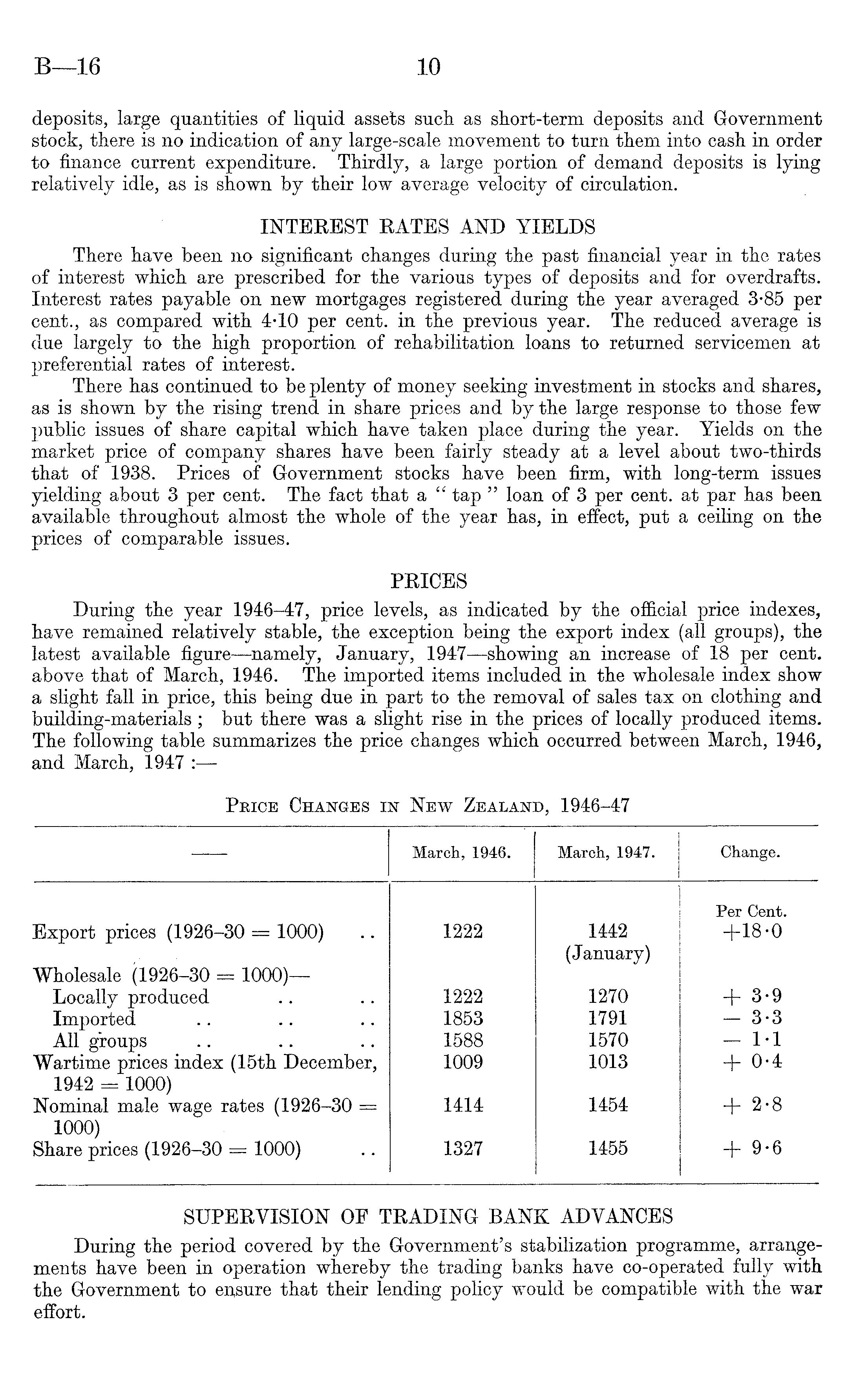 deposits, large quantities of liquid assets such as short-term deposits and Government stock, there is no indication of any large-scale movement to turn them into cash in order to finance current expenditure. Thirdly, a large portion of demand deposits is lying relatively idle, as is shown by their low average velocity of circulation. INTEREST RATES AND YIELDS There have been no significant changes during the past financial year in the rates of interest which are prescribed for the various types of deposits and for overdrafts. Interest rates payable on new mortgages registered during the year averaged 3-85 per cent., as compared with 4-10 per cent, in the previous year. The reduced average is due largely to the high proportion of rehabilitation loans to returned servicemen at preferential rates of interest. There has continued to be plenty of money seeking investment in stocks and shares, as is shown by the rising trend in share prices and by the large response to those few public issues of share capital which have taken place during the year. Yields on the market price of company shares have been fairly steady at a level about two-thirds that of 1938. Prices of Government stocks have been firm, with long-term issues yielding about 3 per cent. The fact that a " tap " loan of 3 per cent, at par has been available throughout almost the whole of the year has, in effect, put a ceiling on the prices of comparable issues. PRICES During the year 1946-47, price levels, as indicated by the official price indexes, have remained relatively stable, the exception being the export index (all groups), the latest available figure—namely, January, 1947—showing an increase of 18 per cent, above that of March, 1946. The imported items included in the wholesale index show a slight fall in price, this being due in part to the removal of sales tax on clothing and building-materials ; but there was a slight rise in the prices of locally produced items. The following table summarizes the price changes which occurred between March, 1946, and March, 1947 :