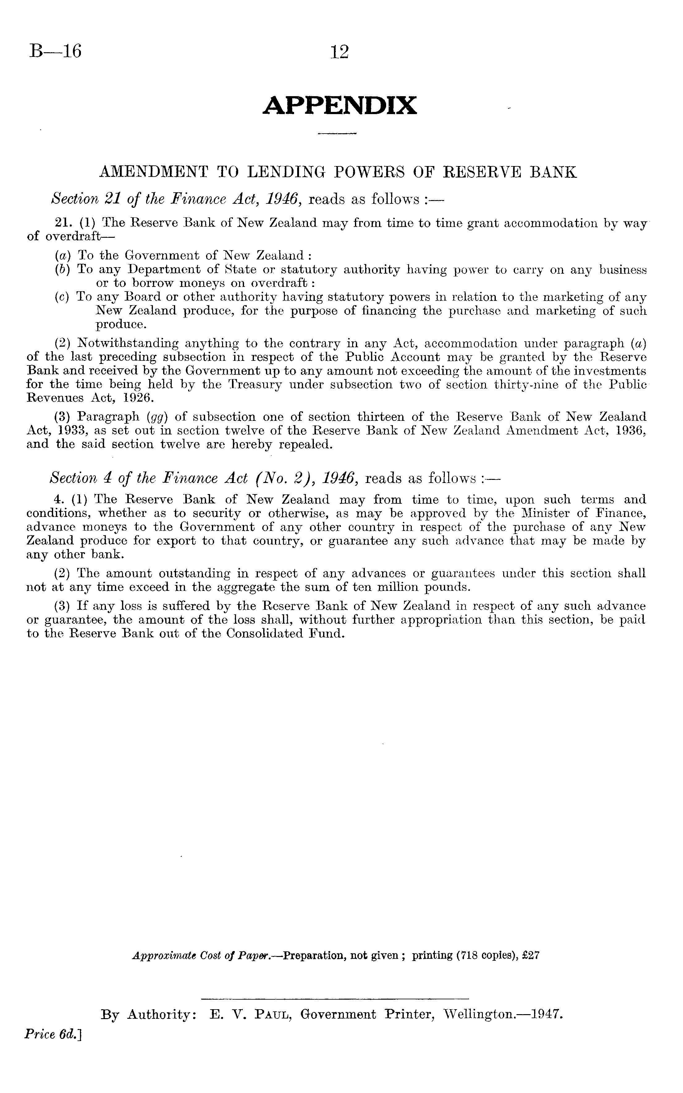 AMENDMENT TO LENDING POWERS OF RESERVE BANK Section 21 of the Finance Act, 1946, reads as follows : 21. (1) The Reserve Bank of New Zealand may from time to time grant accommodation by way of overdraft—(a) To the Government of New Zealand : (b) To any Department of State or statutory authority having power to carry on any business or to borrow moneys on overdraft: (c) To any Board or other authority having statutory powers in relation to the marketing of any New Zealand produce, for the purpose of financing the purchase and marketing of such produce. (2) Notwithstanding anything to the contrary in any Act, accommodation under paragraph (a) of the last preceding subsection in respect of the Public Account may be granted by the Reserve Bank and received by the Government up to any amount not exceeding the amount of the investments for the time being held by the Treasury under subsection two of section thirty-nine of the Public Revenues Act, 1926. (3) Paragraph (gg) of subsection one of section thirteen of the Reserve Bank of New Zealand Act, 1933, as set out in section twelve of the Reserve Bank of New Zealand Amendment Act, 1936, and the said section twelve are hereby repealed. Section 4 of the Finance Act (No. 2), 1946, reads as follows : 4. (1) The Reserve Bank of New Zealand may from time to time, upon such terms and conditions, whether as to security or otherwise, as may be approved by the Minister of Finance,, advance moneys to the Government of any other country in respect of the purchase of any New Zealand produce for export to that country, or guarantee any such advance that may be made by any other bank. (2) The amount outstanding in respect of any advances or guarantees under this section shall not at any time exceed in the aggregate the sum of ten million pounds. (3) If any loss is suffered by the Reserve Bank of New Zealand in respect of any such advance or guarantee, the amount of the loss shall, without further appropriation than this section, be paid to the Reserve Bank out of the Consolidated Fund.