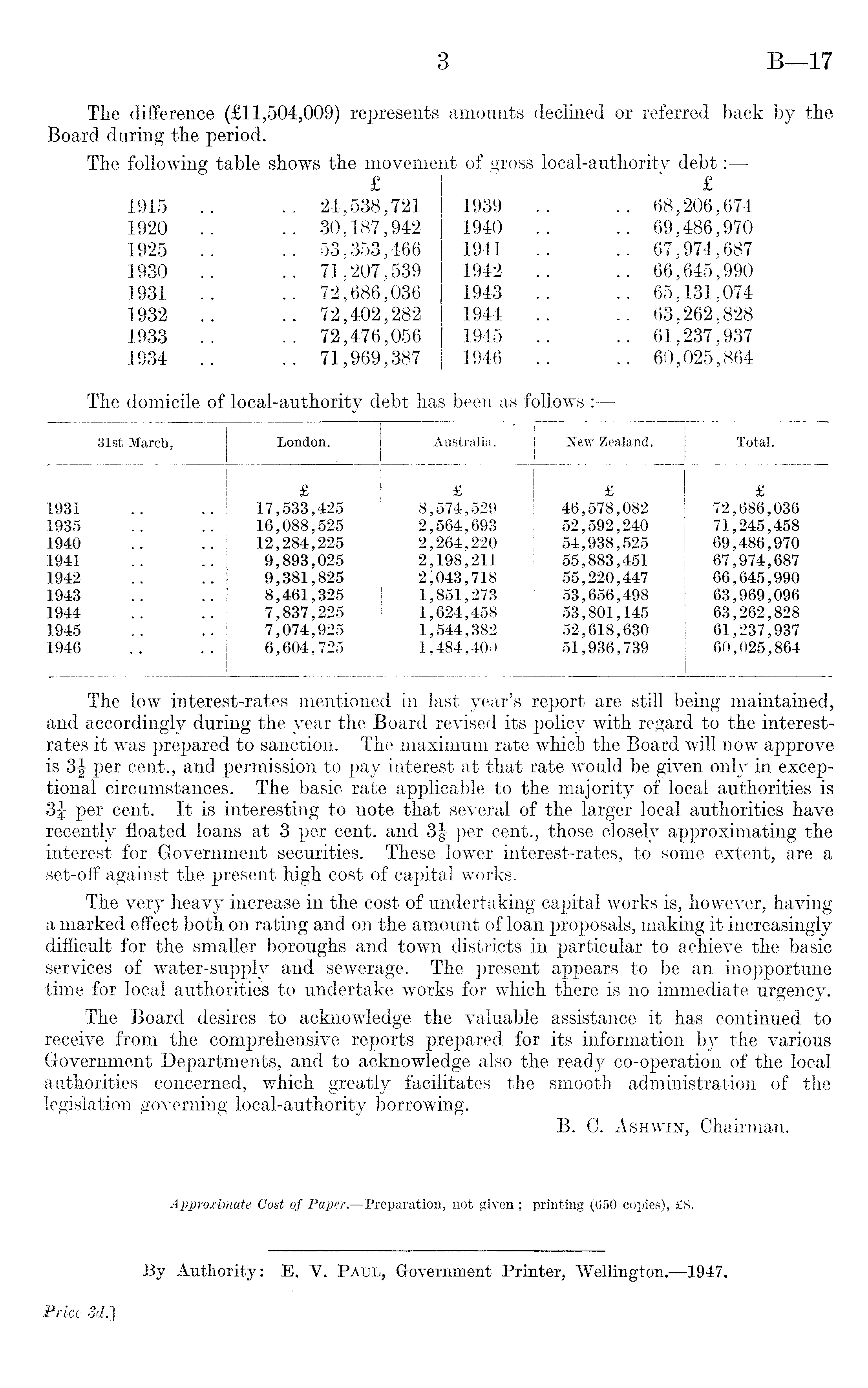 The low interest-rates mentioned in last year's report are still being maintained, and accordingly during the year the Board revised its policy with regard to the interestrates it was prepared to sanction. The maximum rate which the Board will now approve is per cent., and permission to pay interest at that rate would be given only in exceptional circumstances. The basic rate applicable to the majority of local authorities is 3f per cent. It is interesting to note that several of the larger local authorities have recently floated loans at 3 per cent, and 3| per cent., those closely approximating the interest for Government securities. These lower interest-rates, to some extent, are a set-off against the present high cost of capital works. The very heavy increase in the cost of undertaking capital works is, however, having a marked effect both on rating and on the amount of loan proposals, making it increasingly difficult for the smaller boroughs and town districts in particular to achieve the basic services of water-supply and sewerage. The present appears to be an inopportune time for local authorities to undertake works for which there is no immediate urgency. The Board desires to acknowledge the valuable assistance it has continued to receive from the comprehensive reports prepared for its information by the various Government Departments, and to acknowledge also the ready co-operation of the local authorities concerned, which greatly facilitates the smooth administration of the legislation governing local-authority borrowing. B. C. Ashwin, Chairman.