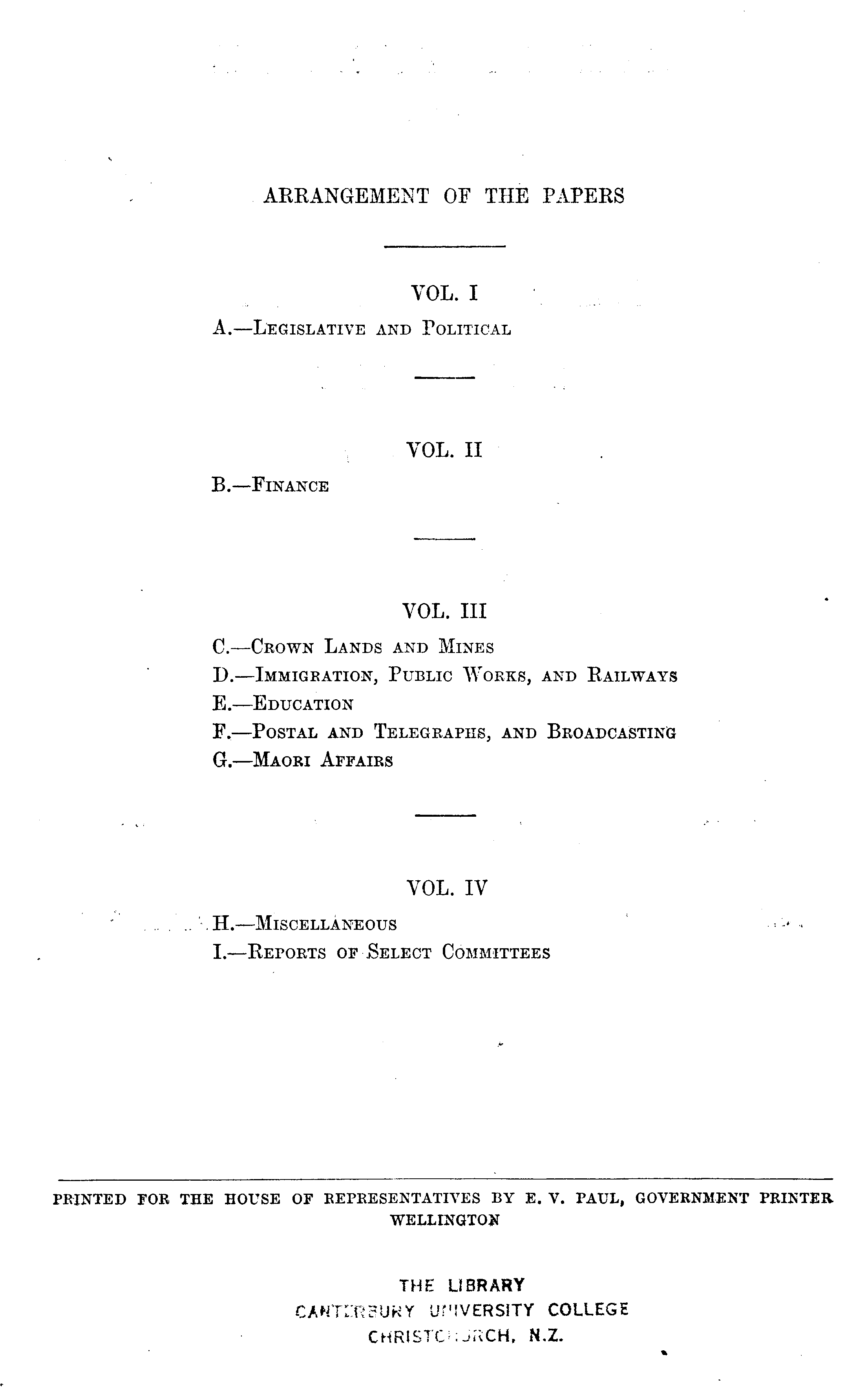 ARRANGEMENT OF THE PAPERS VOL. I H A.—Legislative and Political VOL. II B.—Finance VOL. 11l C.—Crown Lands and Mines I). —Immigration, Public Works, and Railways E.—Education F.. —Postal and Telegraphs, and Broadcasting G.—Maori Affairs VOL. IV H. —Miscellaneous I.—Reports of Select Committees printed for the house of representatives by E. V. PAUL, government printer WELLINGTON
