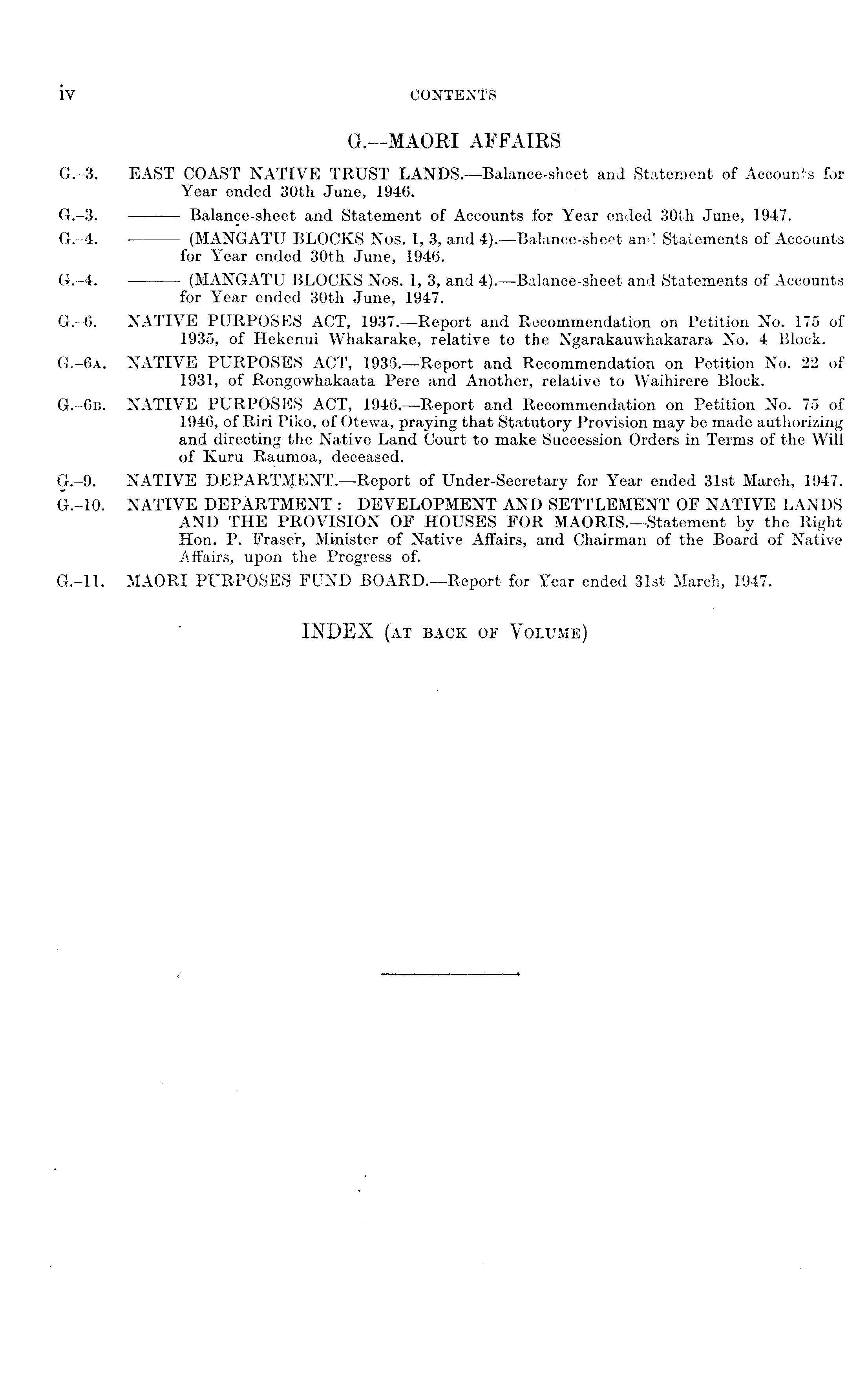 IV CONTENTS G.— MAORI AFFAIRS G.-3. EAST COAST NATIVE TRUST LANDS.—Balance-sheet and Statement of Accounts for Year ended 30th June, 1946. G.-3. Balance-sheet and Statement of Accounts for Year ended 30th June, 1947. G.-4. (MANGATU BLOCKS Nos. 1, 3, and 4).—Balance-sheet and Statements of Accounts for Year ended 30th June, 1946. G.-4. (MANGATU BLOCKS Nos. 1, 3, and 4). —Balance-sheet and Statements of Accounts for Year ended 30th June, 1947. G.-6. NATIVE PURPOSES ACT, 1937.—Report and Recommendation on Petition No. 175 of 1935, of Hekenui Whakarake, relative to the Ngarakauwhakarara No. 4 Block. G.-6A, NATIVE PURPOSES ACT, 1936.—Report and Recommendation on Petition No. 22 of 1931, of Rongowhakaata Pere and Another, relative to Waihirere Block. G.-Gb. NATIVE PURPOSES ACT, 1946.—Report and Recommendation on Petition No. 75 of ¥946, of Riri Piko, of Otewa, praying that Statutory Provision may be made authorizing and directing the Native Land Court to make Succession Orders in Terms of the Will of Kuru Raumoa, deceased. G.-9. NATIVE DEPARTMENT.—Report of Under-Secretary for Year ended 31st March, 1947. G.-10. NATIVE DEPARTMENT : DEVELOPMENT AND SETTLEMENT OF NATIVE LANDS AND THE PROVISION OF HOUSES FOR MAORlS.—Statement by the Right Hon. P. Eraser, Minister of Native Affairs, and Chairman of the Board of Native Affairs, upon the Progress of. G.-11. MAORI PURPOSES FUND BOARD.—Report for Year ended 31st March, 1947. INDEX (at back of Volume)