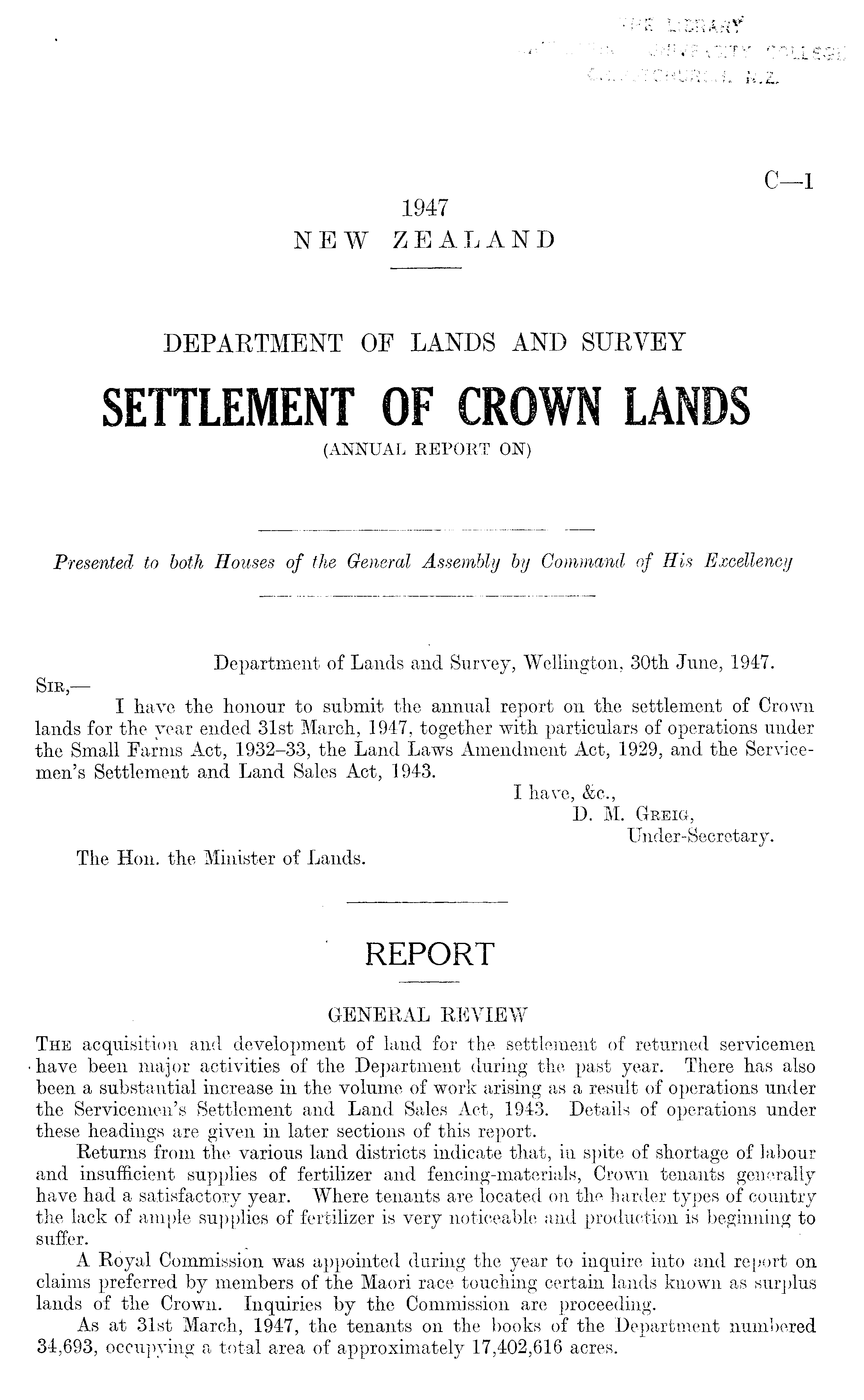Department of Lands and Survey, Wellington, 30th June, 1947. Sir, — I have the honour to submit the annual report on the settlement of Crown lands for the year ended 31st March, 1947, together with particulars of operations under the Small Farms Act, 1932-33, the Land Laws Amendment Act, 1929, and the Servicemen's Settlement and Land Sales Act, 1943. I have, &c., D. M. Greig, Under-Secretary. The Hon. the Minister of Lands.