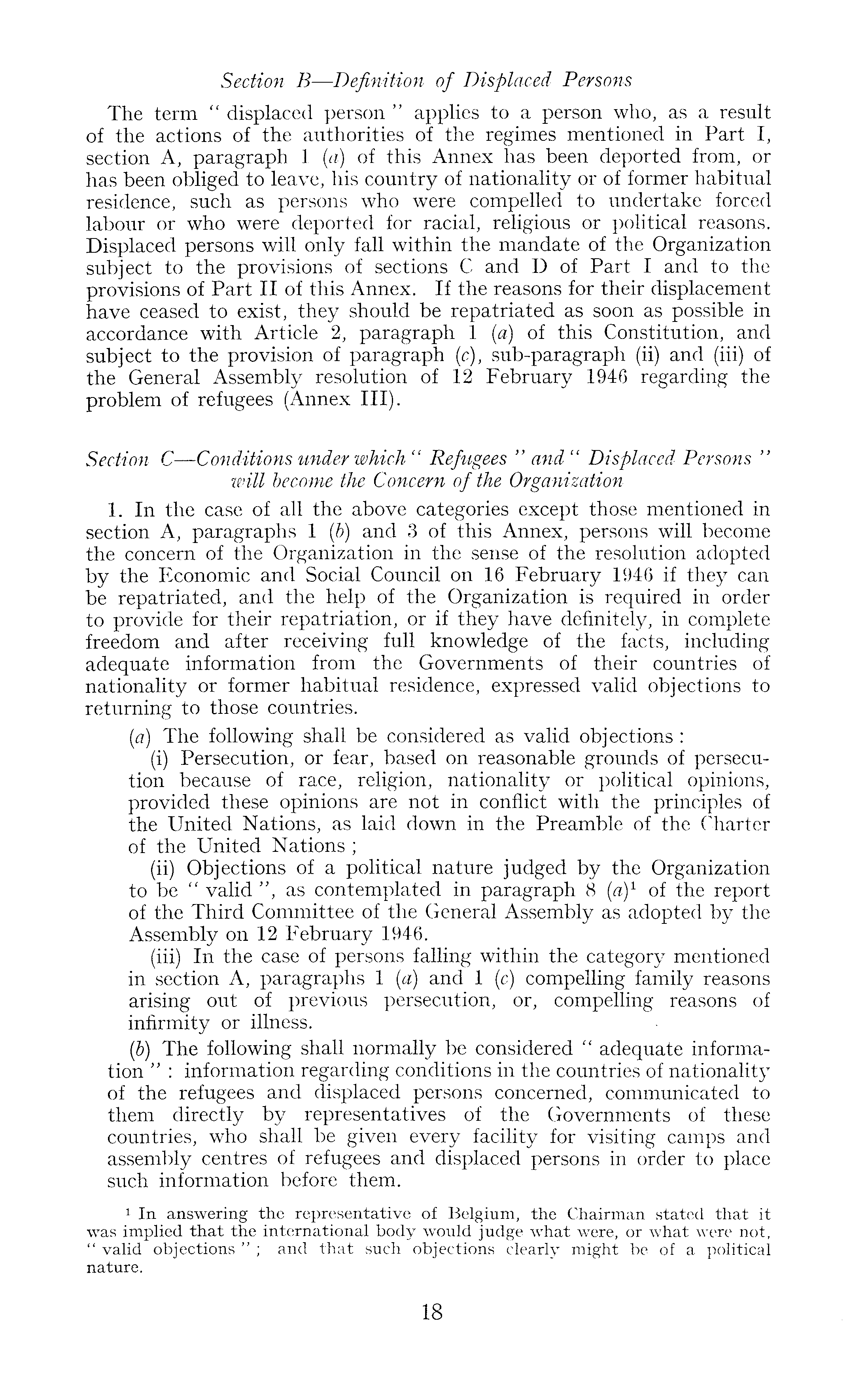 Section B—Definition of Displaced Persons The term " displaced person " applies to a person who, as a result of the actions of the authorities of the regimes mentioned in Part I, section A, paragraph 1 (a) of this Annex has been deported from, or has been obliged to leave, his country of nationality or of former habitual residence, such as persons who were compelled to undertake forced labour or who were deported for racial, religious or political reasons. Displaced persons will only fall within the mandate of the Organization subject to the provisions of sections C and D of Part I and to the provisions of Part II of this Annex. If the reasons for their displacement have ceased to exist, they should be repatriated as soon as possible in accordance with Article 2, paragraph 1 (a) of this Constitution, and subject to the provision of paragraph (c), sub-paragraph (ii) and (iii) of the General Assembly resolution of 12 February 1946 regarding the problem of refugees (Annex III). Section C —Conditions under which " Refugees " and " Displaced Persons " will become the Concern of the Organization 1. In the case of all the above categories except those mentioned in section A, paragraphs 1 (b) and 3of this Annex, persons will become the concern of the Organization in the sense of the resolution adopted by the Economic and Social Council on 16 February 1946 if they can be repatriated, and the help of the Organization is required in order to provide for their repatriation, or if they have definitely, in complete freedom and after receiving full knowledge of the facts, including adequate information from the Governments of their countries of nationality or former habitual residence, expressed valid objections to returning to those countries. (a) The following shall be considered as valid objections : (i) Persecution, or fear, based on reasonable grounds of persecution because of race, religion, nationality or political opinions, provided these opinions are not in conflict with the principles of the United Nations, as laid down in the Preamble of the Charter of the United Nations ; (ii) Objections of a political nature judged by the Organization to be " valid ", as contemplated in paragraph 8 (a) 1 of the report of the Third Committee of the General Assembly as adopted by the Assembly on 12 February 1946. (iii) In the case of persons falling within the category mentioned in section A, paragraphs 1 (a) and 1 (c) compelling family reasons arising out of previous persecution, or, compelling reasons of infirmity or illness. (b) The following shall normally be considered " adequate information " : information regarding conditions in the countries of nationality of the refugees and displaced persons concerned, communicated to them directly by representatives of the Governments of these countries, who shall be given every facility for visiting camps and assembly centres of refugees and displaced persons in order to place such information before them. 1 In answering the representative of Belgium, the Chairman stated that it was implied that the international body would judge what were, or what were not, " valid objections " ; and that such objections clearly might be of a political nature.
