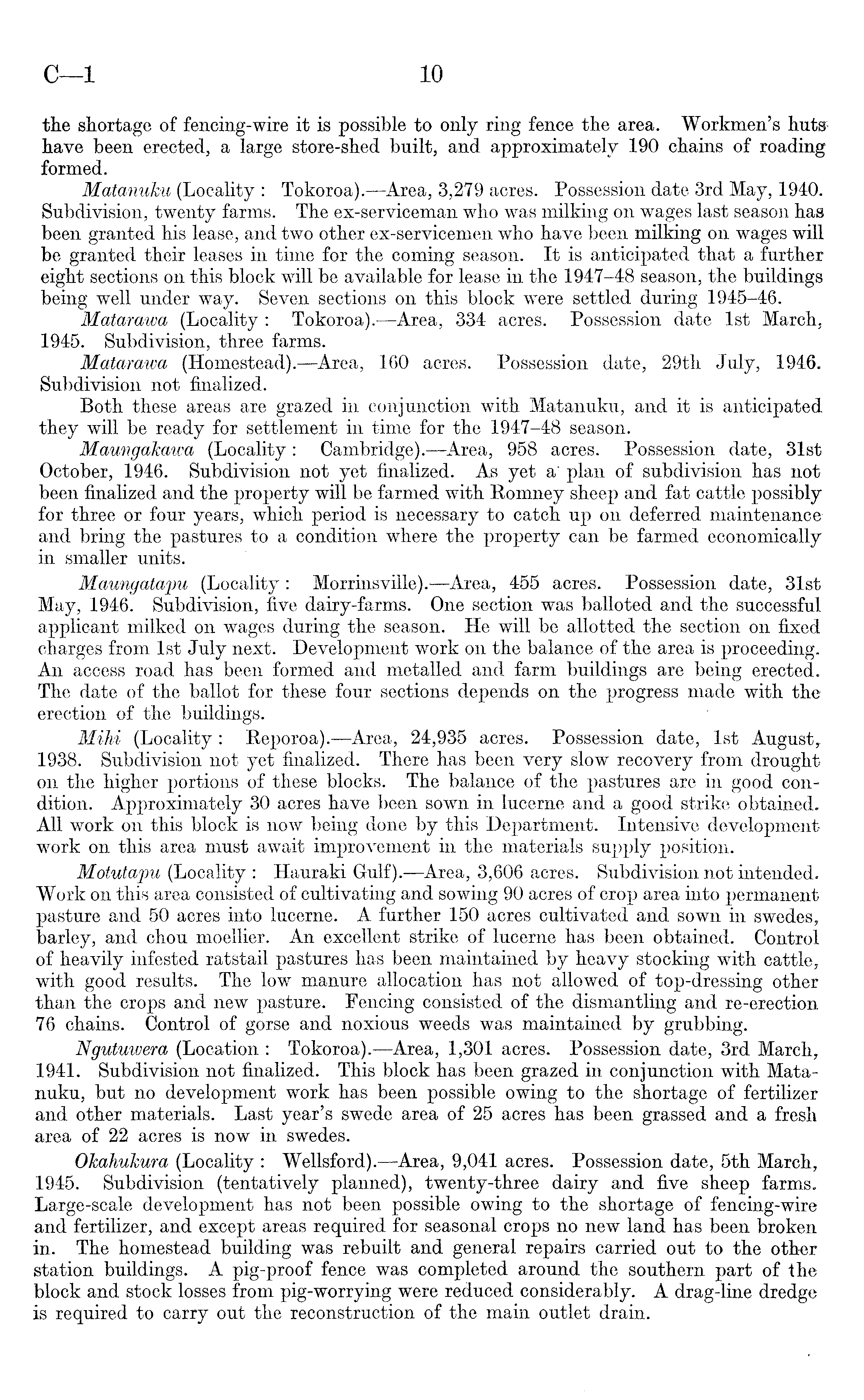 the shortage of fencing-wire it is possible to only ring fence the area. Workmen's huts have been erected, a large store-shed built, and approximately 190 chains of roading formed. Matanuku (Locality : Tokoroa). —Area, 3,279 acres. Possession date 3rd May, 1940. Subdivision, twenty farms. The ex-serviceman who was milking on wages last season has been granted his lease, and two other ex-servicemen who have been milking on wages will be granted their leases in time for the coming season. It is anticipated that a further eight sections on this block will be available for lease in the 1947-48 season, the buildings being well under way. Seven sections on this block were settled during 1945-46. Matarawa (Locality : Tokoroa). —Area, 334 acres. Possession date Ist March,, 1945. Subdivision, three farms. Matarawa (Homestead). —Area, 160 acres. Possession date, 29th July, 1946. Subdivision not finalized. Both these areas are grazed in conjunction with Matanuku, and it is anticipated they will be ready for settlement in time for the 1947-48 season. Maungakawa (Locality: Cambridge). —Area, 958 acres. Possession date, 31st October, 1946. Subdivision not yet finalized. As yet a' plan of subdivision has not been finalized and the property will be farmed with Romney sheep and fat cattle possibly for three or four years, which period is necessary to catch up on deferred maintenance and bring the pastures to a condition where the property can be farmed economically in smaller units. Maungatapu (Locality : Morrinsville). —Area, 455 acres. Possession date, 31st May, 1946. Subdivision, five dairy-farms. One section was balloted and the successful applicant milked on wages during the season. He will be allotted the section on fixed charges from Ist July next. Development work on the balance of the area is proceeding. An access road has been formed and metalled and farm buildings are being erected. The date of the ballot for these four sections depends on the progress made with the erection of the buildings. Mihi (Locality: Reporoa). —Area, 24,935 acres. Possession date, Ist August, 1938. Subdivision not yet finalized. There has been very slow recovery from drought on the higher portions of these blocks. The balance of the pastures are in good condition. Approximately 30 acres have been sown in lucerne and a good strike obtained. All work on this block is now being done by this Department. Intensive development work on this area must await improvement in the materials supply position. Motutapu (Locality : Hauraki Gulf). —Area, 3,606 acres. Subdivision not intended. Work on this area consisted of cultivating and sowing 90 acres of crop area into permanent pasture and 50 acres into lucerne. A further 150 acres cultivated and sown in swedes, barley, and chou moellier. An excellent strike of lucerne has- been obtained. Control of heavily infested ratstail pastures has been maintained by heavy stocking with cattle, with good results. The low manure allocation has not allowed of top-dressing other than the crops and new pasture. Fencing consisted of the dismantling and re-erection 76 chains. Control of gorse and noxious weeds was maintained by grubbing. Ngwtuwera (Location : Tokoroa). —Area, 1,301 acres. Possession date, 3rd March, 1941. Subdivision not finalized. This block has been grazed in conjunction with Matanuku, but no development work has been possible owing to the shortage of fertilizer and other materials. Last year's swede area of 25 acres has been grassed and a fresh area of 22 acres is now in swedes. Okahukura (Locality : Wellsford). —Area, 9,041 acres. Possession date, sth March, 1945. Subdivision (tentatively planned), twenty-three dairy and five sheep farms. Large-scale development has not been possible owing to the shortage of fencing-wire and fertilizer, and except areas required for seasonal crops no new land has been broken in. The homestead building was rebuilt and general repairs carried out to the other station buildings. A pig-proof fence was completed around the southern part of the block and stock losses from pig-worrying were reduced considerably. A drag-line dredge is required to carry out the reconstruction of the main outlet drain.