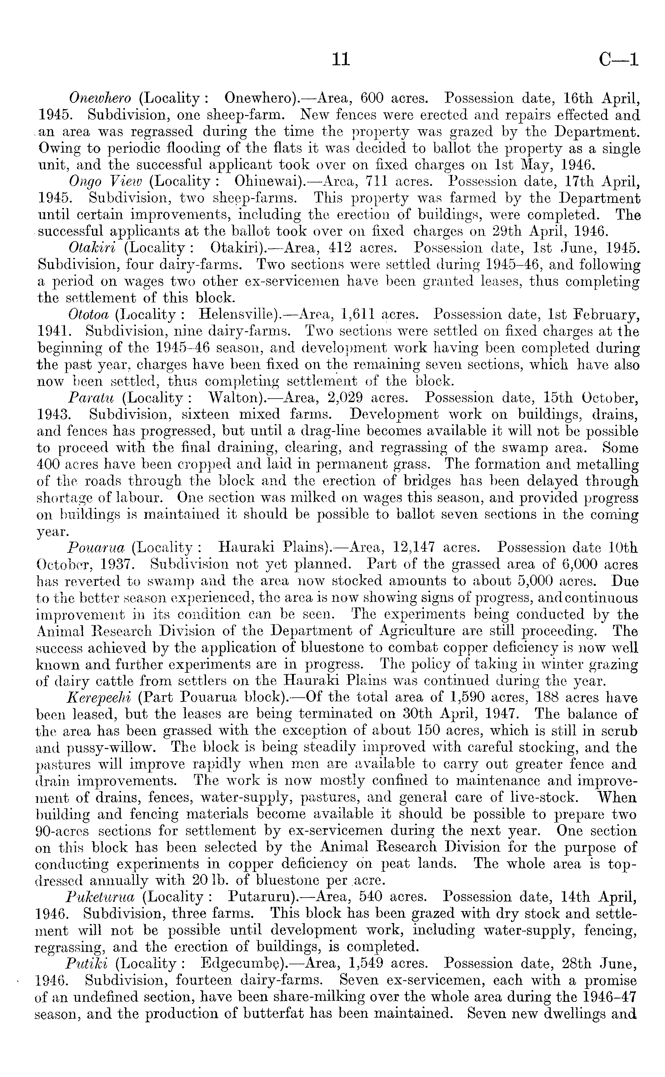 Onewhero (Locality : Onewhero). —Area, 600 acres. Possession, date, 16th April, 1945. Subdivision, one sheep-farm. New fences were erected and repairs effected and an area was regrassed during the time the property was grazed by the Department. Owing to periodic flooding of the flats it was decided to ballot the property as a single unit, and the successful applicant took over on fixed charges on Ist May, 1946. Ongo View (Locality : Ohinewai). —Area, 711 acres. Possession date, 17th April, 1945. Subdivision, two sheep-farms. This property was farmed by the Department until certain improvements, including the erection of buildings, were completed. The successful applicants at the ballot took over on fixed charges on 29th April, 1946. OtaTciri (Locality : Otakiri).—Area, 412 acres. Possession date, Ist June, 1945. Subdivision, four dairy-farms. Two sections were settled during 1945-46, and following a period on wages two other ex-servicemen have been granted leases, thus completing the settlement of this block. Ototoa (Locality : Helensville). —Area, 1,611 acres. Possession date, Ist February, 1941. Subdivision, nine dairy-farms. Two sections were settled on fixed charges at the beginning of the 1945-46 season, and development work having been completed during the past year, charges have been fixed on the remaining seven sections, which have also now been settled, thus completing settlement of the block. Paratu (Locality: Walton). —Area, 2,029 acres. Possession date, 15th October, 1943. Subdivision, sixteen mixed farms. Development work on buildings, drains, and fences has progressed, but until a drag-line becomes available it will not be possible to proceed with the final draining, clearing, and regrassing of the swamp area. Some 400 acres have been cropped and laid in permanent grass. The formation and metalling of the roads through the block and the erection of bridges has been delayed through shortage of labour. One section was milked on wages this season, and provided progress on buildings is maintained it should be possible to ballot seven sections in the coming year. Pouarua (Locality: Hauraki Plains). —Area, 12,147 acres. Possession date 10th October, 1937. Subdivision not yet planned. Part of the grassed area of 6,000 acres has reverted to swamp and the area now stocked amounts to about 5,000 acres. Due to the better season experienced, the area is now showing signs of progress, and continuous improvement in its condition can be seen. The experiments being conducted by the Animal Research Division of the Department of Agriculture are still proceeding. The success achieved by the application of bluestone to combat copper deficiency is now well known and further experiments are in progress. The policy of taking in winter grazing of dairy cattle from settlers on the Hauraki Plains was continued during the year. Kerepeehi (Part Pouarua block). —Of the total area of 1,590 acres, 188 acres have been leased, but the leases are being terminated on 30th April, 1947. The balance of the area has been grassed with the exception of about 150 acres, which is still in scrub and pussy-willow. The block is being steadily improved with careful stocking, and the pastures will improve rapidly when men are available to carry out greater fence and drain improvements. The work is now mostly confined to maintenance and improvement of drains, fences, water-supply, pastures, and general care of live-stock. When building and fencing materials become available it should be possible to prepare two 90-acres sections for settlement by ex-servicemen during the next year. One section on this block has been selected by the Animal Research Division for the purpose of conducting experiments in copper deficiency on peat lands. The whole area is topdressed annually with 20 lb. of bluestone per .acre. Puketurua (Locality : Putaruru). —Area, 540 acres. Possession date, 14th April, 1946. Subdivision, three farms. This block has been grazed with dry stock and settlement will not be possible until development work, including water-supply, fencing, regrassing, and the erection of buildings, is completed. Putiki (Locality : Edgeeumbe). —Area, 1,549 acres. Possession date, 28th June, 1946. Subdivision, fourteen dairy-farms. Seven ex-servicemen, each with a promise of an undefined section, have been share-milking over the whole area during the 1946-47 .season, and the production of butterfat has been maintained. Seven new dwellings and