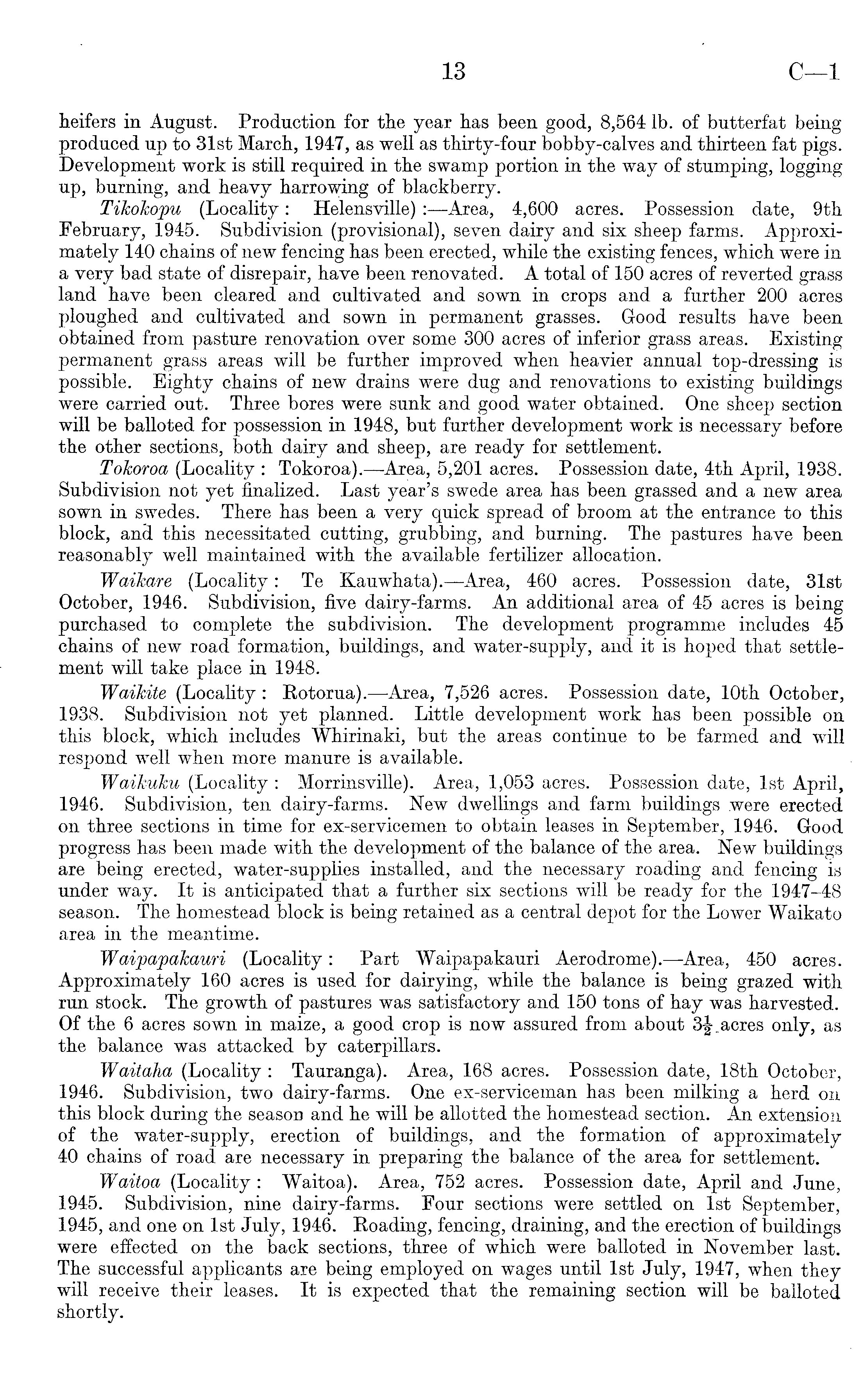 heifers in August. Production for the year has been good, 8,564 lb. of butterfat being produced up to 31st March, 1947, as well as thirty-four bobby-calves and thirteen fat pigs. Development work is still required in the swamp portion in the way of stumping, logging up, burning, and heavy harrowing of blackberry. TiJcoJcopu (Locality: Helensville): —Area, 4,600 acres. Possession date, 9th February, 1945. Subdivision (provisional), seven dairy and six sheep farms. Approximately 140 chains of new fencing has been erected, while the existing fences, which were in a very bad state of disrepair, have been renovated. A total of 150 acres of reverted grass land have been cleared and cultivated and sown in crops and a further 200 acres ploughed and cultivated and sown in permanent grasses. Good results have been obtained from pasture renovation over some 300 acres of inferior grass areas. Existing permanent grass areas will be further improved when heavier annual top-dressing is possible. Eighty chains of new drains were dug and renovations to existing buildings were carried out. Three bores were sunk and good water obtained. One sheep section will be balloted for possession in 1948, but further development work is necessary before the other sections, both dairy and sheep, are ready for settlement. Tokoroa (Locality : Tokoroa). —Area, 5,201 acres. Possession date, 4th April, 1938. Subdivision not yet finalized. Last year's swede area has been grassed and a new area sown in swedes. There has been a very quick spread of broom at the entrance to this block, and this necessitated cutting, grubbing, and burning. The pastures have been reasonably well maintained with the available fertilizer allocation. WaiJcare (Locality: Te Kauwhata). —Area, 460 acres. Possession date, 31st October, 1946. Subdivision, five dairy-farms. An additional area of 45 acres is being purchased to complete the subdivision. The development programme includes 45 chains of new road formation, buildings, and water-supply, and it is hoped that settlement will take place in 1948. Waihite (Locality: Rotorua). —Area, 7,526 acres. Possession date, 10th October, 1938. Subdivision not yet planned. Little development work has been possible on this block, which includes Whirinaki, but the areas continue to be farmed and will respond well when more manure is available. Waikuku (Locality: Morrinsville). Area, 1,053 acres. Possession date, Ist April, 1946. Subdivision, ten dairy-farms. New dwellings and farm buildings were erected on three sections in time for ex-servicemen to obtain leases in September, 1946. Good progress has been made with the development of the balance of the area. New buildings are being erected, water-supplies installed, and the necessary roading and fencing is under way. It is anticipated that a further six sections will be ready for the 1947-48 season. The homestead block is being retained as a central depot for the Lower Waikato area in the meantime. WaipapaJcauri (Locality: Part Waipapakauri Aerodrome). —Area, 450 acres. Approximately 160 acres is used for dairying, while the balance is being grazed with run stock. The growth of pastures was satisfactory and 150 tons of hay was harvested. Of the 6 acres sown in maize, a good crop is now assured from about 3£.acres only, as the balance was attacked by caterpillars. Waitaha (Locality : Tauranga). Area, 168 acres. Possession date, 18th October, 1946. Subdivision, two dairy-farms. One ex-serviceman has been milking a herd on this block during the season and he will be allotted the homestead section. An extension of the water-supply, erection of buildings, and the formation of approximately 40 chains of road are necessary in preparing the balance of the area for settlement. Waitoa (Locality : Waitoa). Area, 752 acres. Possession date, April and June, 1945. Subdivision, nine dairy-farms. Four sections were settled on Ist September, 1945, and one on Ist July, 1946. Roading, fencing, draining, and the erection of buildings were effected on the back sections, three of which were balloted in November last. The successful applicants are being employed on wages until Ist July, 1947, when they will receive their leases. It is expected that the remaining section will be balloted shortly.