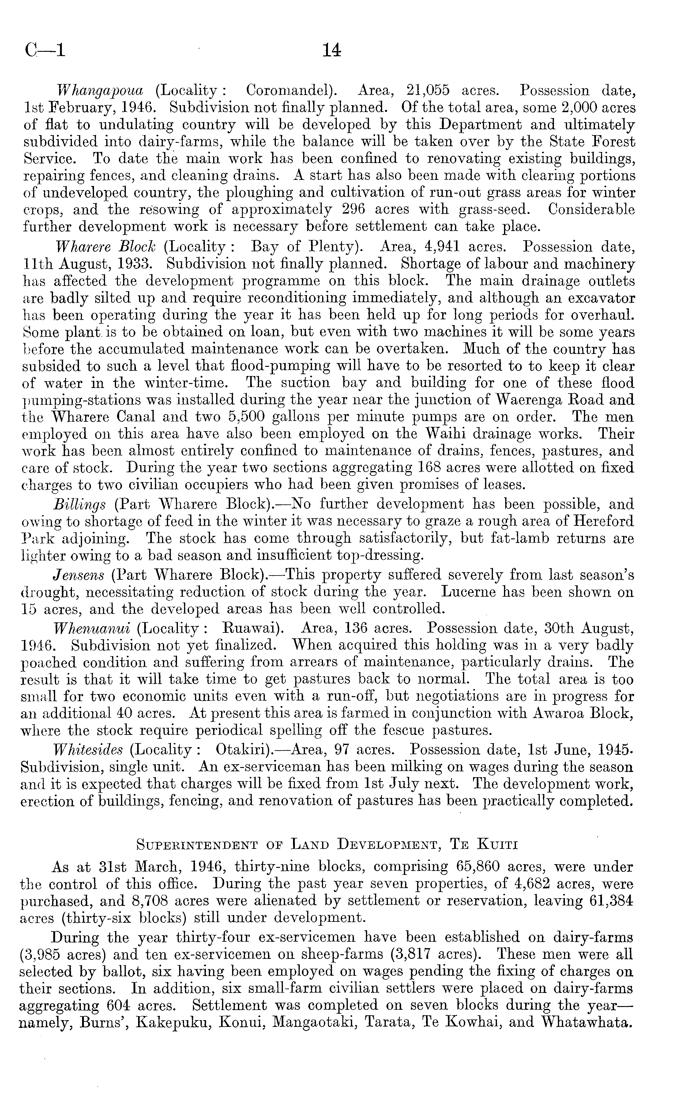Whangapoua (Locality: Coromandel). Area, 21,055 acres. Possession date, Ist February, 1946. Subdivision not finally planned. Of the total area, some 2,000 acres of flat to undulating country will be developed by this Department and ultimately subdivided into dairy-farms, while the balance will be taken over by the State Forest Service. To date the main work has been confined to renovating existing buildings, repairing fences, and cleaning drains. A start has also been made with clearing portions of undeveloped country, the ploughing and cultivation of run-out grass areas for winter crops, and the re'sowing of approximately 296 acres with grass-seed. Considerable further development work is necessary before settlement can take place. Wharere Block (Locality : Bay of Plenty). Area, 4,941 acres. Possession date, 11th August, 1933. Subdivision not finally planned. Shortage of labour and machinery has affected the development programme on this block. The main drainage outlets are badly silted up and require reconditioning immediately, and although an excavator has been operating during the year it has been held up for long periods for overhaul. Some plant, is to be obtained on loan, but even with two machines it will be some years before the accumulated maintenance work can be overtaken. Much of the country has subsided to such a level that flood-pumping will have to be resorted to to keep it clear of water in the winter-time. The suction bay and building for one of these flood pumping-stations was installed dtiring the year near the junction of Waerenga Road and the Wharere Canal and two 5,500 gallons per minute pumps are on order. The men employed on this area have also been employed on the Waihi drainage works. Their work has been almost entirely confined to maintenance of drains, fences, pastures, and care of stock. During the year two sections aggregating 168 acres were allotted on fixed charges to two civilian occupiers who had been given promises of leases. Billings (Part Wharere Block). —No further development has been possible, and owing to shortage of feed in the winter it was necessary to graze a rough area of Hereford Park adjoining. The stock has come through satisfactorily, but fat-lamb returns are lighter owing to a bad season and insufficient top-dressing. Jensens (Part Wharere Block). —This property suffered severely from last season's drought, necessitating reduction of stock during the year. Lucerne has been shown on 15 acres, and the developed areas has been well controlled. Whenuanui (Locality : Ruawai). Area, 136 acres. Possession date, 30th August, 1946. Subdivision not yet finalized. When acquired this holding was in a very badly poached condition and suffering from arrears of maintenance, particularly drains. The result is that it will take time to get pastures back to normal. The total area is too small for two economic units even with a run-off, but negotiations are in progress for an additional 40 acres. At present this area is farmed in conjunction with Awaroa Block, where the stock require periodical spelling off the fescue pastures. Whitesides (Locality : Otakiri). —Area, 97 acres. Possession date, Ist June, 1945Subdivision, single unit. An ex-serviceman has been milking on wages during the season and it is expected that charges will be fixed from Ist July next. The development work, erection of buildings, fencing, and renovation of pastures has been practically completed. Superintendent of Land Development, Te Kuiti As at 31st March, 1946, thirty-nine blocks, comprising 65,860 acres, were under the control of this office. During the past year seven properties, of 4,682 acres, were purchased, and 8,708 acres were alienated by settlement or reservation, leaving 61,384 acres (thirty-six blocks) still under development. During the year thirty-four ex-servicemen have been established on dairy-farms (3,985 acres) and ten ex-servicemen on sheep-farms (3,817 acres). These men were all selected by ballot, six having been employed on wages pending the fixing of charges on their sections. In addition, six small-farm civilian settlers were placed on dairy-farms aggregating 604 acres. Settlement was completed on seven blocks during the year—namely, Burns', Kakepuku, Konui, Mangaotaki, Tarata, Te Kowhai, and Whatawhata.