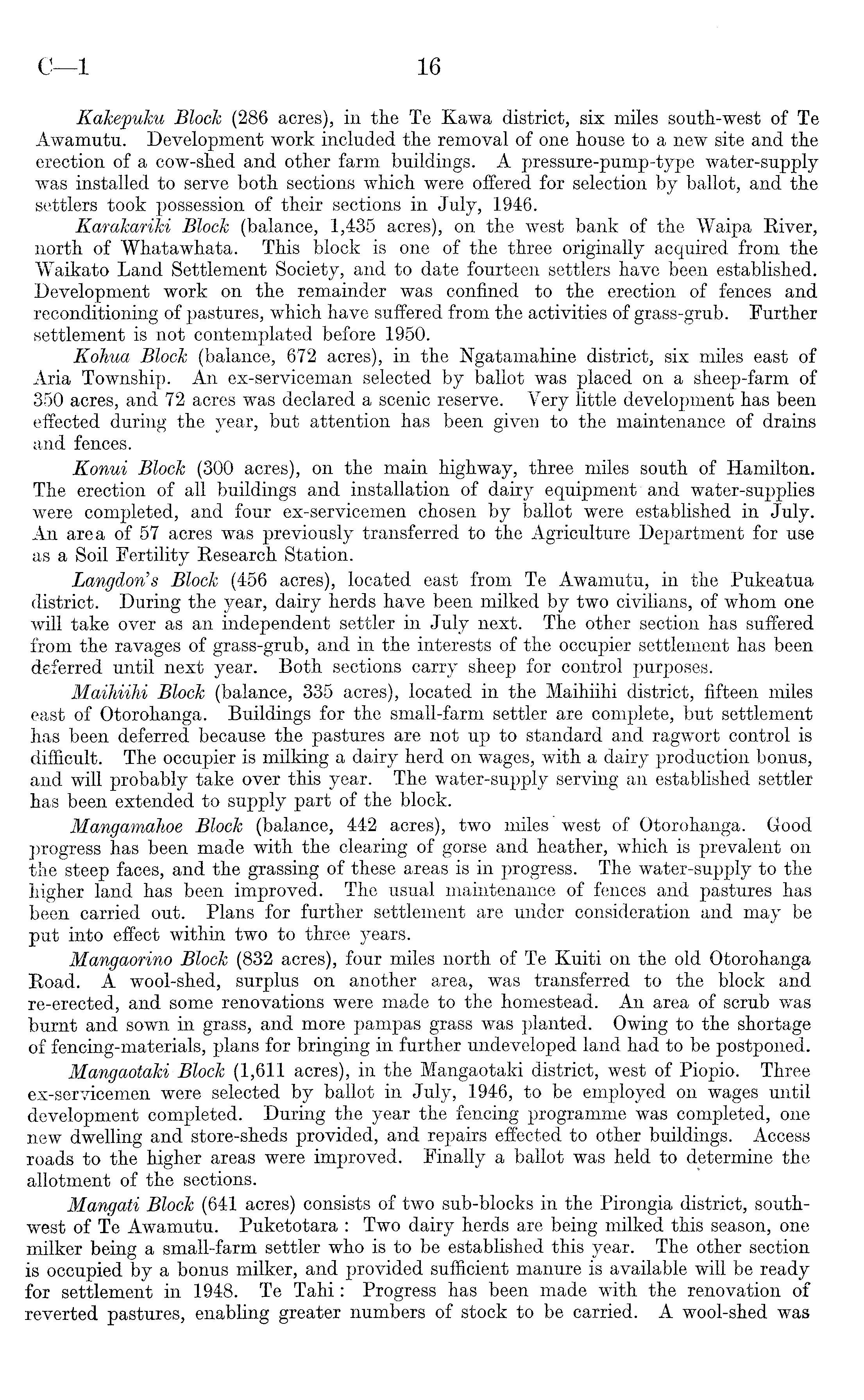 Kakejpuku Block (286 acres), in the Te Kawa district, six miles south-west of Te Awamutu. Development work included the removal of one house to a new site and the erection of a cow-shed and other farm buildings. A pressure-pump-type water-supply was installed to serve both sections which were offered for selection by ballot, and the settlers took possession of their sections in July, 1946. ■ Karakariki Block (balance, 1,435 acres), on the west bank of the Waipa River, north of Whatawhata. This block is one of the three originally acquired from the Waikato Land Settlement Society, and to date fourteen settlers have been established. Development work on the remainder was confined to the erection of fences and reconditioning of pastures, which have suffered from the activities of grass-grub. Further settlement is not contemplated before 1950. Kohua Block (balance, 672 acres), in the Ngatamahine district, six miles east of Aria Township. An ex-serviceman selected by ballot was placed on a sheep-farm of 350 acres, and 72 acres was declared a scenic reserve. Yery little development has been effected during the year, but attention has been given to the maintenance of drains and fences. Konui Block (300 acres), on the main highway, three miles south of Hamilton. The erection of all buildings and installation of dairy equipment and water-supplies were completed, and four ex-servicemen chosen by ballot were established in July. An area of 57 acres was previously transferred to the Agriculture Department for use as a Soil Fertility Research Station. Langdon's Block (456 acres), located east from Te Awamutu, in the Pukeatua district. During the year, dairy herds have been milked by two civilians, of whom one will take over as an independent, settler in July next. The other section has suffered from the ravages of grass-grub, and in the interests of the occupier settlement has been deferred until next year. Both sections carry sheep for control purposes. Maihiihi Block (balance, 335 acres), located in the Maihiihi district, fifteen miles east of Otorohanga. Buildings for the small-farm settler are complete, but settlement has been deferred because the pastures are not up to standard and ragwort control is difficult. The occupier is milking a dairy herd on wages, with a dairy production bonus, and will probably take over this year. The water-supply serving an established settler has been extended to supply part of the block. Mangamahoe Block (balance, 442 acres), two miles west of Otorohanga. Good progress has been made with the clearing of gorse and heather, which is prevalent on the steep faces, and the grassing of these areas is in progress. The water-supply to the higher land has been improved. The usual maintenance of fences and pastures has been carried out. Plans for further settlement are under consideration and may be put into effect within two to three years. Mangaorino Block (832 acres), four miles north of Te Kuiti on the old Otorohanga Road. A wool-shed, surplus on another area, was transferred to the block and re-erected, and some renovations were made to the homestead. An area of scrub was burnt and sown in grass, and more pampas grass was planted. Owing to the shortage of fencing-materials, plans for bringing in further undeveloped land had to be postponed. Mangaotaki Block (1,611 acres), in the Mangaotaki district, west of Piopio. Three ex-servicemen were selected by ballot in July, 1946, to be employed on wages until development completed. During the year the fencing programme was completed, one new dwelling and store-sheds provided, and repairs effected to other buildings. Access roads to the higher areas were improved. Finally a ballot was held to determine the allotment of the sections. Mangati Block (641 acres) consists of two sub-blocks in the Pirongia district, southwest of Te Awamutu. Puketotara : Two dairy herds are being milked this season, one milker being a small-farm settler who is to be established this year. The other section is occupied by a bonus milker, and provided sufficient manure is available will be ready for settlement in 1948. Te Tahi: Progress has been made with the renovation of reverted pastures, enabling greater numbers of stock to be carried. A wool-shed was
