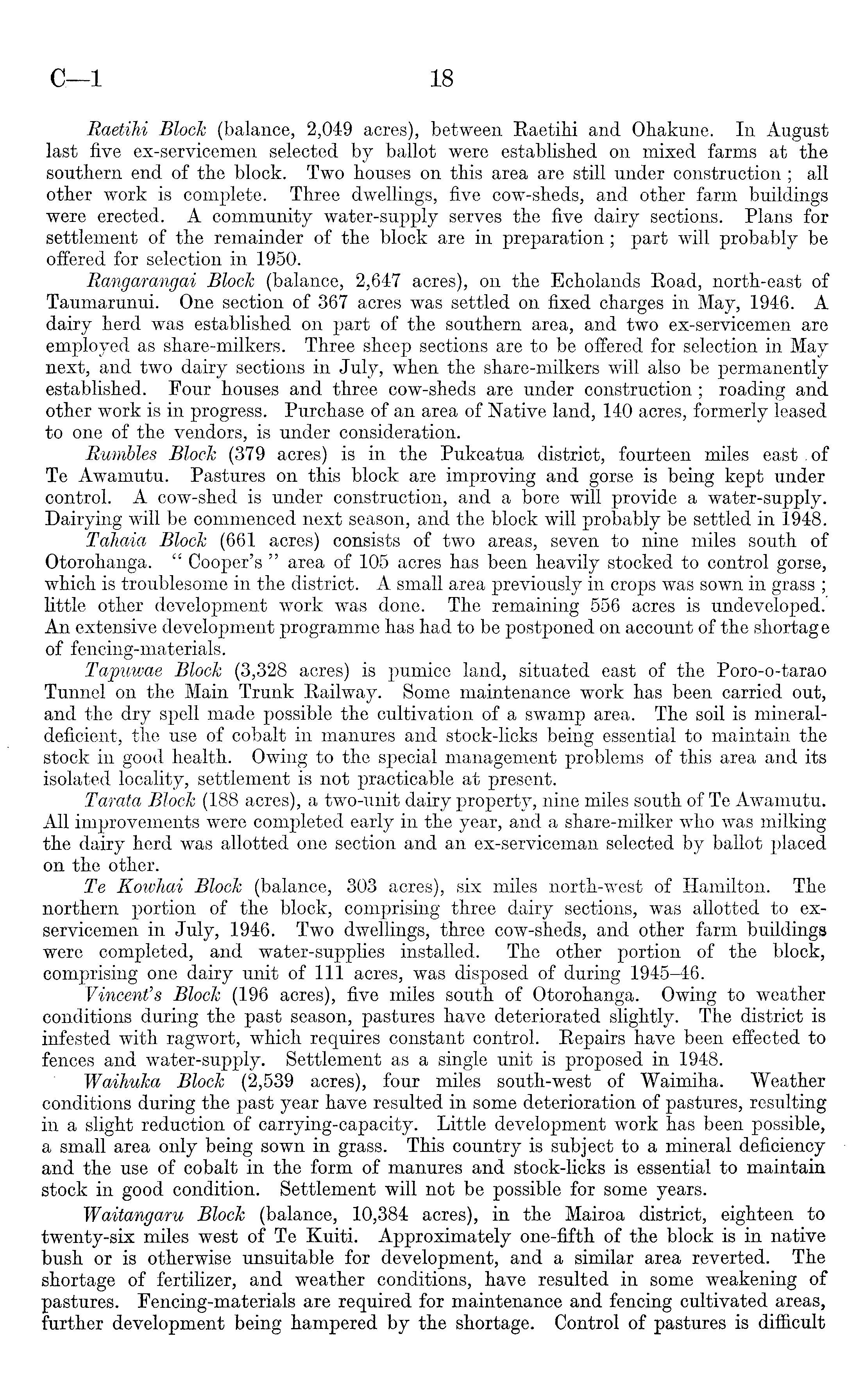 Raetihi BlocJc (balance, 2,049 acres), between Raetihi and Ohakune. In August last five ex-servicemen selected by ballot were established on mixed farms at the southern end of the block. Two houses on this area are still under construction; all other work is complete. Three dwellings, five cow-sheds, and other farm buildings were erected. A community water-supply serves the five dairy sections. Plans for settlement of the remainder of the block are in preparation; part will probably be offered for selection in 1950. Rangarangai Block (balance, 2,647 acres), on the Echolands Road, north-east of Taumarunui. One section of 367 acres was settled on fixed charges in May, 1946. A dairy herd was established on part of the southern area, and two ex-servicemen are employed as share-milkers. Three sheep sections are to be offered for selection in May next, and two dairy sections in July, when the share-milkers will also be permanently established. Four houses and three cow-sheds are under construction; roading and other work is in progress. Purchase of an area of Native land, 140 acres, formerly leased to one of the vendors, is under consideration. Rumbles Block (379 acres) is in the Pukeatua district, fourteen miles east.of Te Awamutu. Pastures on this block are improving and gorse is being kept under control. A cow-shed is under construction, and a bore will provide a water-supply. Dairying will be commenced next season, and the block will probably be settled in 1948. Tahaia Block (661 acres) consists of two areas, seven to nine miles south of Otorohanga. " Cooper's " area of 105 acres has been heavily stocked to control gorse, which is troublesome in the district. A small area previously in crops was sown in grass ; little other development work was done. The remaining 556 acres is undeveloped. An extensive development programme has had to be postponed on account of the shortage of fencing-materials. Tapuwae Block (3,328 acres) is pumice land, situated east of the Poro-o-tarao Tunnel on the Main Trunk Railway. Some maintenance work has been carried out, and the dry spell made possible the cultivation of a swamp area. The soil is mineraldeficient, the use of cobalt in manures and stock-licks being essential to maintain the stock in good health. Owing to the special management problems of this area and its isolated locality, settlement is not practicable at present. Tarata Block (188 acres), a two-unit dairy property, nine miles south of Te Awamutu. All improvements were completed early in the year, and a share-milker who was milking the dairy herd was allotted one section and an ex-serviceman selected by ballot placed on the other. Te Kowhai Block (balance, 303 acres), six miles north-west of Hamilton. The northern portion of the block, comprising three dairy sections, was allotted to exservicemen in July, 1946. Two dwellings, three cow-sheds, and other farm buildings were completed, and water-supplies installed. The other portion of the block, comprising one dairy unit of 111 acres, was disposed of during 1945-46. Vincent's Block (196 acres), five miles south of Otorohanga. Owing to weather conditions during the past season, pastures have deteriorated slightly. The district is infested with ragwort, which requires constant control. Repairs have been effected to fences and water-supply. Settlement as a single unit is proposed in 1948. Waihuka Block (2,539 acres), four miles south-west of Waimiha. Weather conditions during the past year have resulted in some deterioration of pastures, resulting in a slight reduction of carrying-capacity. Little development work has been possible, a small area only being sown in grass. This country is subject to a mineral deficiency and the use of cobalt in the form of manures and stock-licks is essential to maintain stock in good condition. Settlement will not be possible for some years. Waitangaru Block (balance, 10,384 acres), in the Mairoa district, eighteen to twenty-six miles west of Te Kuiti. Approximately one-fifth of the block is in native bush or is otherwise unsuitable for development, and a similar area reverted. The shortage of fertilizer, and weather conditions, have resulted in some weakening of pastures. Fencing-materials are required for maintenance and fencing cultivated areas, further development being hampered by the shortage. Control of pastures is difficult