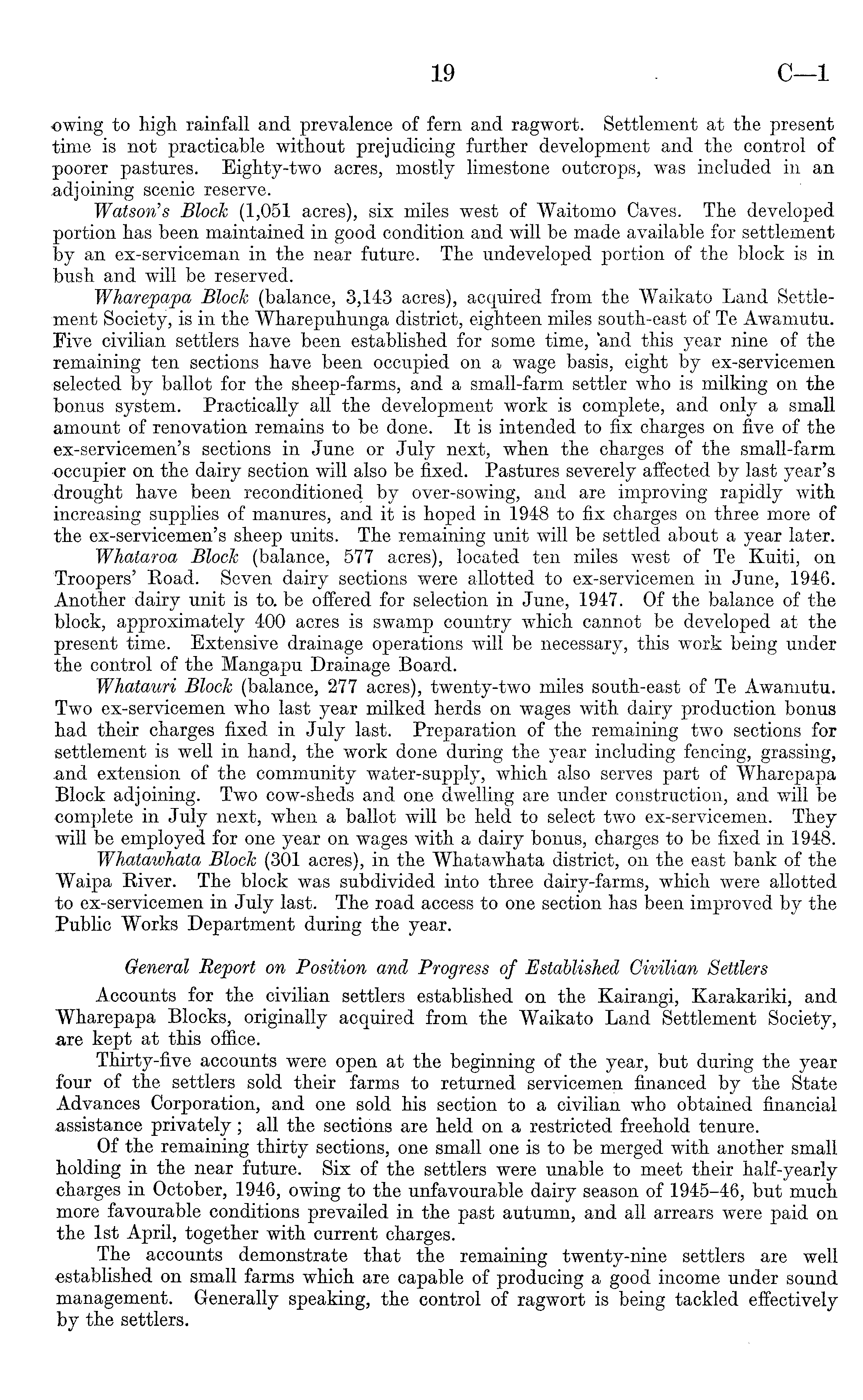owing to high, rainfall and prevalence of fern and ragwort. Settlement at tlie present time is not practicable without prejudicing further development and the control of poorer pastures. Eighty-two acres, mostly limestone outcrops, was included in an .adjoining scenic reserve. Watson's Block (1,051 acres), six miles west of Waitomo Caves. The developed portion has been maintained in good condition and will be made available for settlement by an ex-serviceman in the near future. The undeveloped portion of the block is in bush and will be reserved. Wharepapa Block (balance, 3,143 acres), acquired from the Waikato Land Settlement Society, is in the Wharepuhunga district, eighteen miles south-east of Te Awamutu. [Five civilian settlers have been established for some time, and this year nine of the remaining ten sections have been occupied on a wage basis, eight by ex-servicemen selected by ballot for the sheep-farms, and a small-farm settler who is milking on the bonus system. Practically all the development work is complete, and only a small amount of renovation remains to be done. It is intended to fix charges on five of the ex-servicemen's sections in June or July next, when the charges of the small-farm occupier on the dairy section will also be fixed. Pastures severely affected by last year's ■drought have been reconditioned by over-sowing, and are improving rapidly with increasing supplies of manures, and it is hoped in 1948 to fix charges on three more of the ex-servicemen's sheep units. The remaining unit will be settled about a year later. Whataroa BlocJc (balance, 577 acres), located ten miles west of Te Kuiti, on Troopers' Road. Seven dairy sections were allotted to ex-servicemen in June, 1946. Another -dairy unit is to. be offered for selection in June, 1947. Of the balance of the block, approximately 400 acres is swamp country which cannot be developed at the present time. Extensive drainage operations will be necessary, this work being under the control of the Mangapu Drainage Board. Whatauri Block (balance, 277 acres), twenty-two miles south-east of Te Awamutu. Two ex-servicemen who last year milked herds on wages with dairy production bonus had their charges fixed in July last. Preparation of the remaining two sections for settlement is well in hand, the work done during the year including fencing, grassing, and extension of the community water-supply, which also serves part of Wharepapa Block adjoining. Two cow-sheds and one dwelling are under construction, and will be complete in July next, when a ballot will be held to select two ex-servicemen. They will be employed for one year on wages with a dairy bonus, charges to be fixed in 1948. Whatawhata Block (301 acres), in the Whatawhata district, on the east bank of the Waipa River. The block was subdivided into three dairy-farms, which were allotted to ex-servicemen in July last. The road access to one section has been improved by the Public Works Department during the year. General Report on Position and Progress of Established Civilian Settlers Accounts for the civilian settlers established on the Kairangi, Karakariki, and Wharepapa Blocks, originally acquired from the Waikato Land Settlement Society, are kept at this office. Thirty-five accounts were open at the beginning of the year, but during the year four of the settlers sold their farms to returned servicemen financed by the State Advances Corporation, and one sold his section to a civilian who obtained financial assistance privately; all the sections are held on a restricted freehold tenure. Of the remaining thirty sections, one small one is to be merged with another small holding in the near future. Six of the settlers were unable to meet their half-yearly charges in October, 1946, owing to the unfavourable dairy season of 1945-46, but much more favourable conditions prevailed in the past autumn, and all arrears were paid on the Ist April, together with current charges. The accounts demonstrate that the remaining twenty-nine settlers are well established on small farms which are capable of producing a good income under sound management. Generally speaking, the control of ragwort is being tackled effectively by the settlers.
