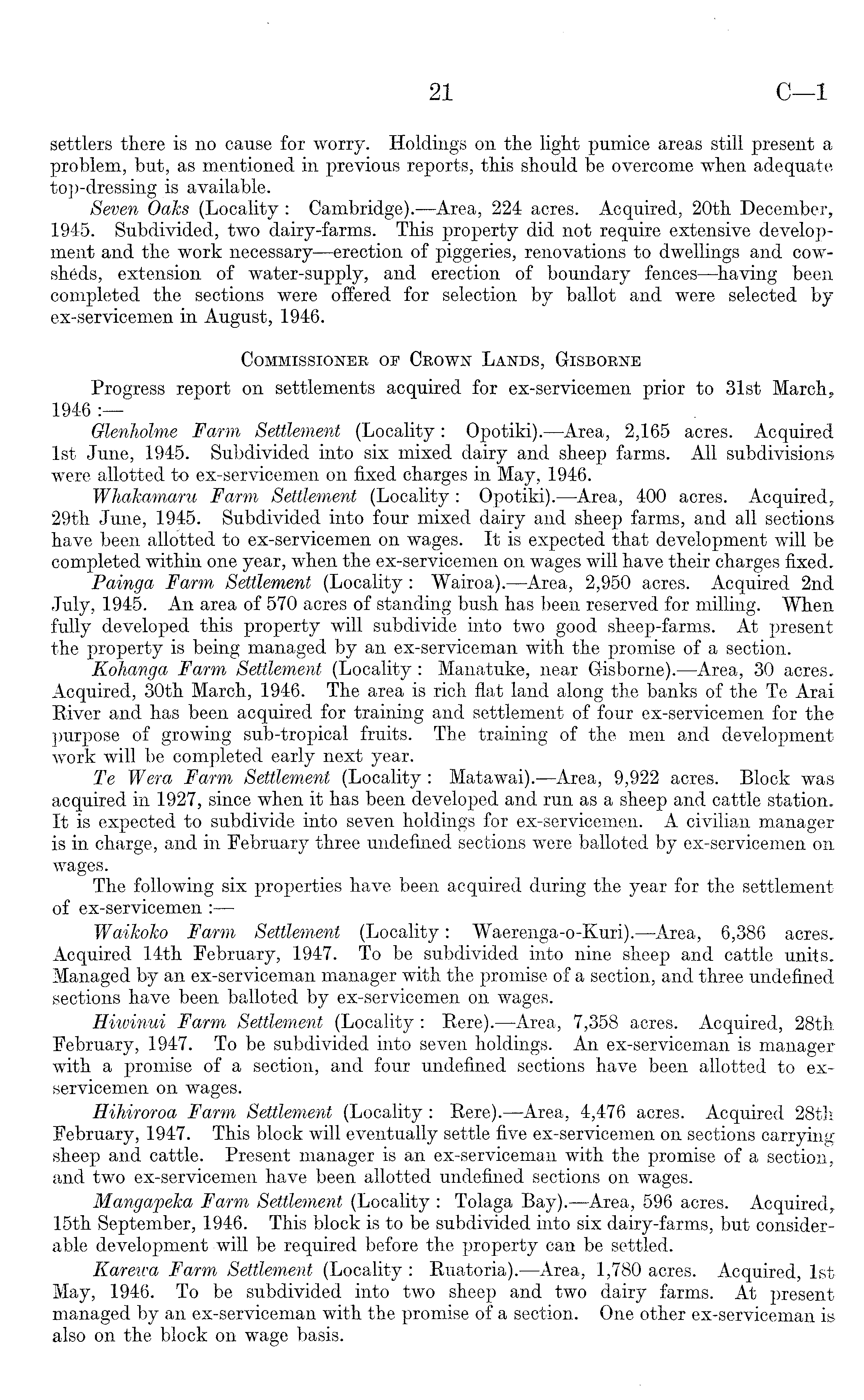 settlers there is no cause for worry. Holdings on the light pumice areas still present a problem, but, as mentioned in previous reports, this should be overcome when adequate top-dressing is available. Seven Oaks (Locality : Cambridge). —Area, 224 acres. Acquired, 20th December, 1945. Subdivided, two dairy-farms. This property did not require extensive development and the work necessary—erection of piggeries, renovations to dwellings and cowsheds, extension of water-supply, and erection of boundary fences —having been completed the sections were offered for selection by ballot and were selected by ex-servicemen in August, 1946. Commissioner of Crown Lands, Gtisborne Progress report on settlements acquired for ex-servicemen prior to 31st March, 1946 : Glenholme Farm Settlement (Locality: Opotiki).—Area, 2,165 acres. Acquired Ist June, 1945. Subdivided into six mixed dairy and sheep farms. All subdivisions were allotted to ex-servicemen on fixed charges in May, 1946. Whakamaru Farm Settlement (Locality : Opotiki).—Area, 400 acres. Acquired, 29th June, 1945. Subdivided into four mixed dairy and sheep farms, and all sections have been allotted to ex-servicemen on wages. It is expected that development will be completed within one year, when the ex-servicemen on wages will have their charges fixed. Painga Farm Settlement (Locality : Wairoa). —Area, 2,950 acres. Acquired 2nd July, 1945. An area of 570 acres of standing bush has been reserved for milling. When fully developed this property will subdivide into two good sheep-farms. At present the property is being managed by an ex-serviceman with the promise of a section. Kohanga Farm Settlement (Locality: Manatuke, near Gisborne). —Area, 30 acres. Acquired, 30th March, 1946. The area is rich flat land along the banks of the Te Arai River and has been acquired for training and settlement of four ex-servicemen for the purpose of growing sub-tropical fruits. The training of the men and development work will be completed early next year. Te Wera Farm Settlement (Locality: Matawai). —Area, 9,922 acres. Block was acquired in 1927, since when it has been developed and run as a sheep and cattle station. It is expected to subdivide into seven holdings for ex-servicemen. A civilian manager is in charge, and in February three undefined sections were balloted by ex-servicemen on wages. The following six properties have been acquired during the year for the settlement of ex-servicemen : Waikoko Farm Settlement (Locality: Waerenga-o-Kuri).—Area, 6,386 acres. Acquired 14th February, 1947. To be subdivided into nine sheep and cattle units. Managed by an ex-serviceman manager with the promise of a section, and three undefined sections have been balloted by ex-servicemen on wages. Hiwinui Farm Settlement (Locality : Here). —Area, 7,358 acres. Acquired, 28th February, 1947. To be subdivided into seven holdings. An ex-serviceman is manager with a promise of a section, and four undefined sections have been allotted to exservicemen on wages. Hihiroroa Farm Settlement (Locality : Here). —Area, 4,476 acres. Acquired 28th February, 1947. This block will eventually settle five ex-servicemen on sections carryingsheep and cattle. Present manager is an ex-serviceman with the promise of a section, and two ex-servicemen have been allotted undefined sections on wages. Mangapeka Farm Settlement (Locality : Tolaga Bay). —Area, 596 acres. Acquired, 15th September, 1946. This block is to be subdivided into six dairy-farms, but considerable development will be required before the property can be settled. Karewa Farm Settlement (Locality : Ruatoria). —Area, 1,780 acres. Acquired, Ist May, 1946. To be subdivided into two sheep and two dairy farms. At present managed by an ex-serviceman with the promise of a section. One other ex-serviceman is also on the block on wage basis.