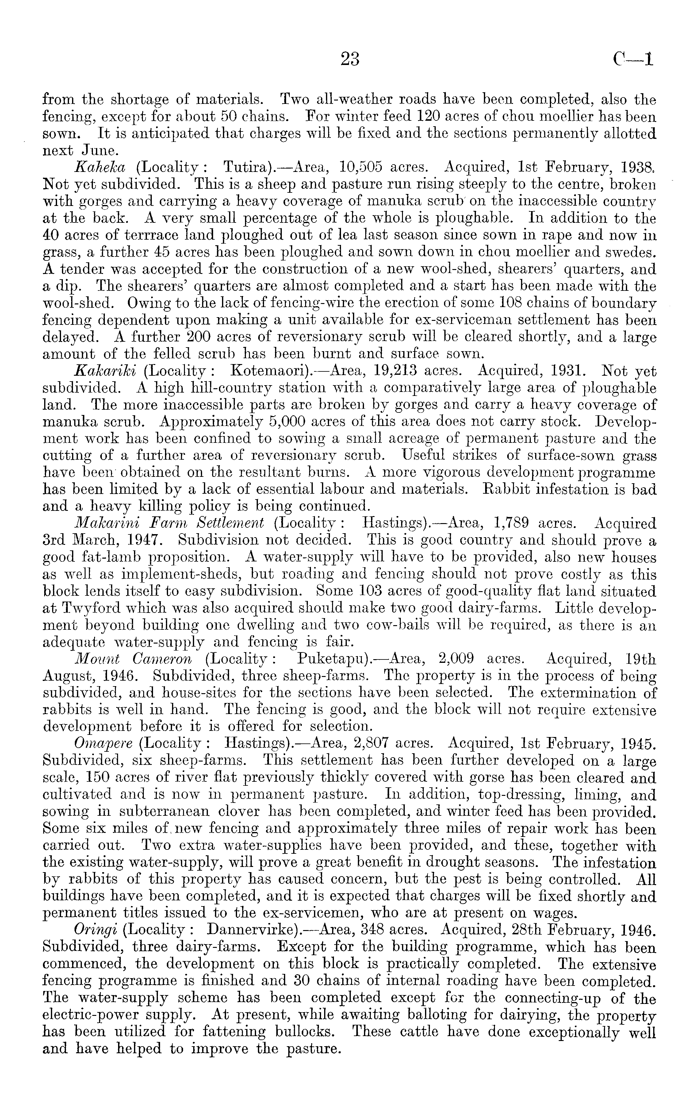 from the shortage of materials. Two all-weather roads have been completed, also the fencing, except for abont 50 chains. For winter feed 120 acres of chou moellier has been sown. It is anticipated that charges will be fixed and the sections permanently allotted next June. Kaheka (Locality: Tutira). —Area, 10,505 acres. Acquired, Ist February, 1938. Not yet subdivided. This is a sheep and pasture run rising steeply to the centre, broken with gorges and carrying a heavy coverage of manuka scrub* on the inaccessible country at the back. A very small percentage of the whole is ploughable. In addition to the 40 acres of terrrace land ploughed out of lea last season since sown in rape and now in grass, a further 45 acres has been ploughed and sown down in chou moellier and swedes. A tender was accepted for the construction of a new wool-shed, shearers' quarters, and a dip. The shearers' quarters are almost completed and a start has been made with the wool-shed. Owing to the lack of fencing-wire the erection of some 108 chains of boundary fencing dependent upon making a unit available for ex-serviceman settlement has been delayed. A further 200 acres of reversionary scrub will be cleared shortly, and a large amount of the felled scrub has been burnt and surface sown. Kakariki (Locality : Kotemaori). —Area, 19,213 acres. Acquired, 1931. Not yet subdivided. A high hill-country station with a comparatively large area of ploughable land. The more inaccessible parts are broken by gorges and carry a heavy coverage of manuka scrub. Approximately 5,000 acres of this area does not carry stock. Development work has been confined to sowing a small acreage of permanent pasture and the cutting of a further area of reversionary scrub. Useful strikes of surface-sown grass have been obtained on the resultant burns. A more vigorous development programme has been limited by a lack of essential labour and materials. Kabbit infestation is bad and a heavy killing policy is being continued. Malcarini Farm Settlement (Locality: Hastings). —Area, 1,789 acres. Acquired 3rd March, 1947. Subdivision not decided. This is good country and should prove a good fat-lamb proposition. A water-supply will have to be provided, also new houses as well as implement-sheds, but roading and fencing should not prove costly as this block lends itself to easy subdivision. Some 103 acres of good-quality flat land situated at Twyford which was also acquired should make two good dairy-farms. Little development beyond building one dwelling and two cow-bails will be required, as there is an adequate water-supply and fencing is fair. Mount Cameron (Locality: Puketapu). —Area, 2,009 acres. Acquired, 19th August, 1946. Subdivided, three sheep-farms. The property is in the process of being subdivided, and house-sites for the sections have been selected. The extermination of rabbits is well in hand. The fencing is good, and the block will not require extensive development before it is offered for selection. Omajpere (Locality: Hastings).—Area, 2,807 acres. Acquired, Ist February, 1945. Subdivided, six sheep-farms. This settlement has been further developed on a large scale, 150 acres of river flat previously thickly covered with gorse has been cleared and cultivated and is now in permanent pasture. In addition, top-dressing, liming, and sowing in subterranean clover has been completed, and winter feed has been provided. Some six miles of. new fencing and approximately three miles of repair work has been carried out. Two extra water-supplies have been provided, and these, together with the existing water-supply, will prove a great benefit in drought seasons. The infestation by rabbits of this property has caused concern, but the pest is being controlled. All buildings have been completed, and it is expected that charges will be fixed shortly and permanent titles issued to the ex-servicemen, who are at present on wages. Oringi (Locality : Dannervirke). —Area, 348 acres. Acquired, 28th February, 1946. Subdivided, three dairy-farms. Except for the building programme, which has been commenced, the development on this block is practically completed. The extensive fencing programme is finished and 30 chains of internal roading have been completed. The water-supply scheme has been completed except for the connecting-up of the electric-power supply. At present, while awaiting balloting for dairying, the property has been utilized for fattening bullocks. These cattle have done exceptionally well and have helped to improve the pasture.