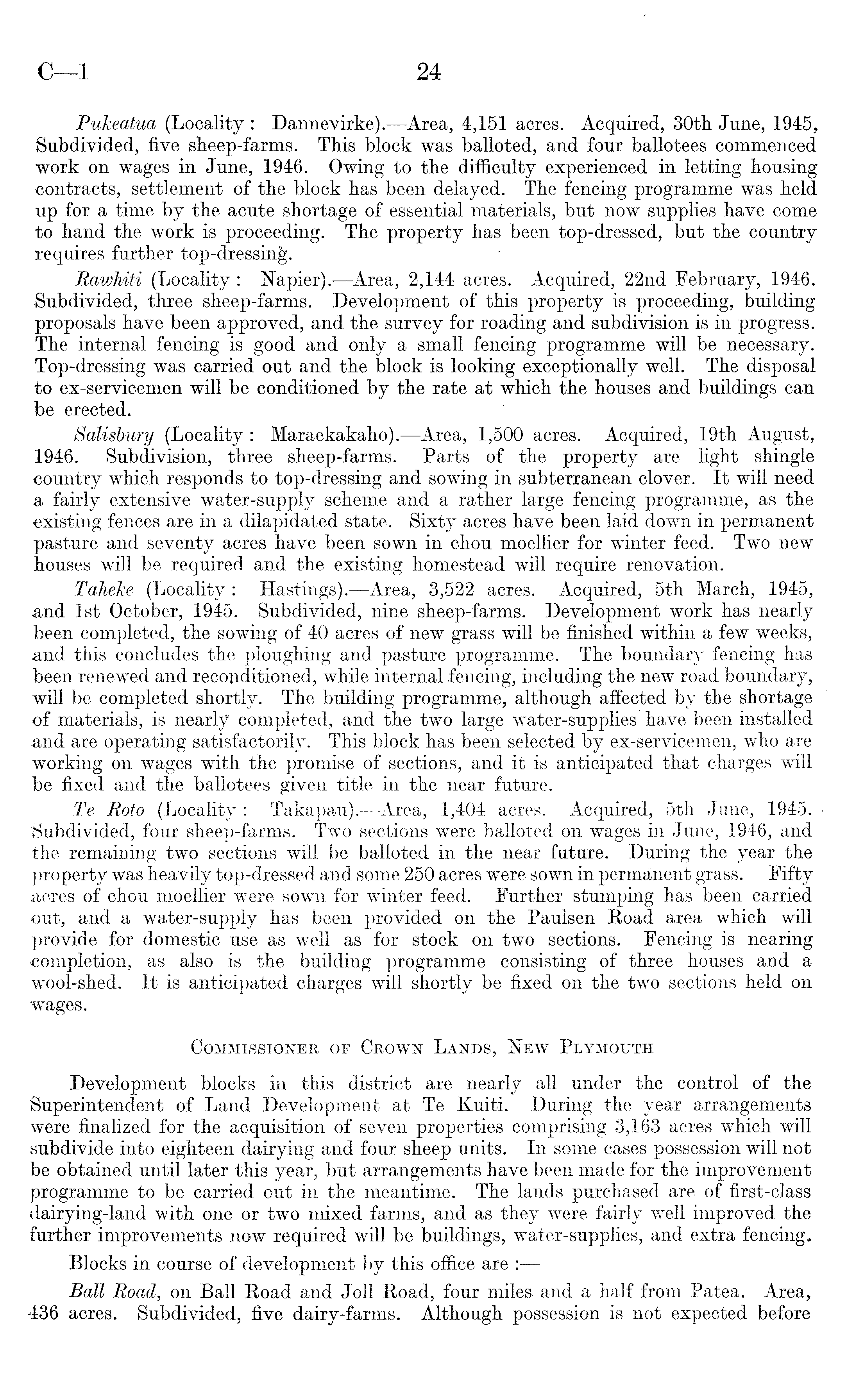PuJceatua (Locality : Dannevirke). —Area, 4,151 acres. Acquired, 30th June, 1945, Subdivided, five sheep-farms. This block was balloted, and four ballotees commenced work on wages in June, 1946. Owing to the difficulty experienced in letting housing contracts, settlement of the block has been delayed. The fencing programme was held up for a time by the acute shortage of essential materials, but now supplies have come to hand the work is proceeding. The property has been top-dressed, but the country requires further top-dressing. Rawhiti (Locality: Napier).—Area, 2,144 acres. Acquired, 22nd February, 1946. Subdivided, three sheep-farms. Development of this property is proceeding, building proposals have been approved, and the survey for roading and subdivision is in progress. The internal fencing is good and only a small fencing programme will be necessary. Top-dressing was carried out and the block is looking exceptionally well. The disposal to ex-servicemen will be conditioned by the rate at which the houses and buildings can be erected. Salisbury (Locality: Maraekakaho). —Area, 1,500 acres. Acquired, 19th August, 1946. Subdivision, three sheep-farms. Parts of the property are light shingle country which responds to top-dressing and sowing in subterranean clover. It will need a fairly extensive water-supply scheme and a rather large fencing programme, as the existing fences are in a dilapidated state. Sixty acres have been laid down in permanent pasture and seventy acres have been sown in chou moellier for winter feed. Two new houses will be required and the existing homestead will require renovation. Taheke (Locality : Hastings).—Area, 3,522 acres. Acquired, sth March, 1945, and Ist October, 1945. Subdivided, nine sheep-farms. Development work has nearly been completed, the sowing of 40 acres of new grass will be finished within a few weeks, and this concludes the ploughing and pasture programme. The boundary fencing has been renewed and reconditioned, while internal fencing, including the new road boundary, will be completed shortly. The building programme, although affected by the shortage of materials, is nearly completed, and the two large water-supplies' have been installed and are operating satisfactorily. This block has been selected by ex-servicemen, who are working on wages with the promise of sections, and it is anticipated that charges will be fixed and the ballotees given title in the near future. Te Roto (Locality : Takapau).—Area, 1,404 acres. Acquired, sth June, 1945. Subdivided, four sheep-farms. Two sections were balloted on wages in June, 1946, and the remaining two sections will be balloted in the near future. During the year the property was heavily top-dressed and some 250 acres were sown in permanent grass. Fifty acres of chou moellier were sown for winter feed. Further stumping has been carried out, and a water-supply has been provided on the Paulsen Road area which will provide for domestic use as well as for stock on two sections. Fencing is nearing completion, as also is the building programme consisting of three houses and a wool-shed. It is anticipated charges will shortly be fixed on the two sections held on wages. Commissioner of Crown Lands, New Plymouth Development blocks in this district are nearly all under the control of the Superintendent of Land Development at Te Kuiti. During the year arrangements were finalized for the acquisition of seven properties comprising 3,163 acres which will subdivide into eighteen dairying and four sheep units. In some cases possession will not be obtained until later this year, but arrangements have been made for the improvement programme to be carried out in the meantime. The lands purchased are of first-class dairying-land with one or two mixed farms, and as they were fairly well improved the further improvements now required will be buildings, water-supplies, and extra fencing. Blocks in course of development by this office are : Ball Road, on Ball Road and Joll Road, four miles and a half from Patea. Area, 436 acres. Subdivided, five dairy-farms. Although possession is not expected before