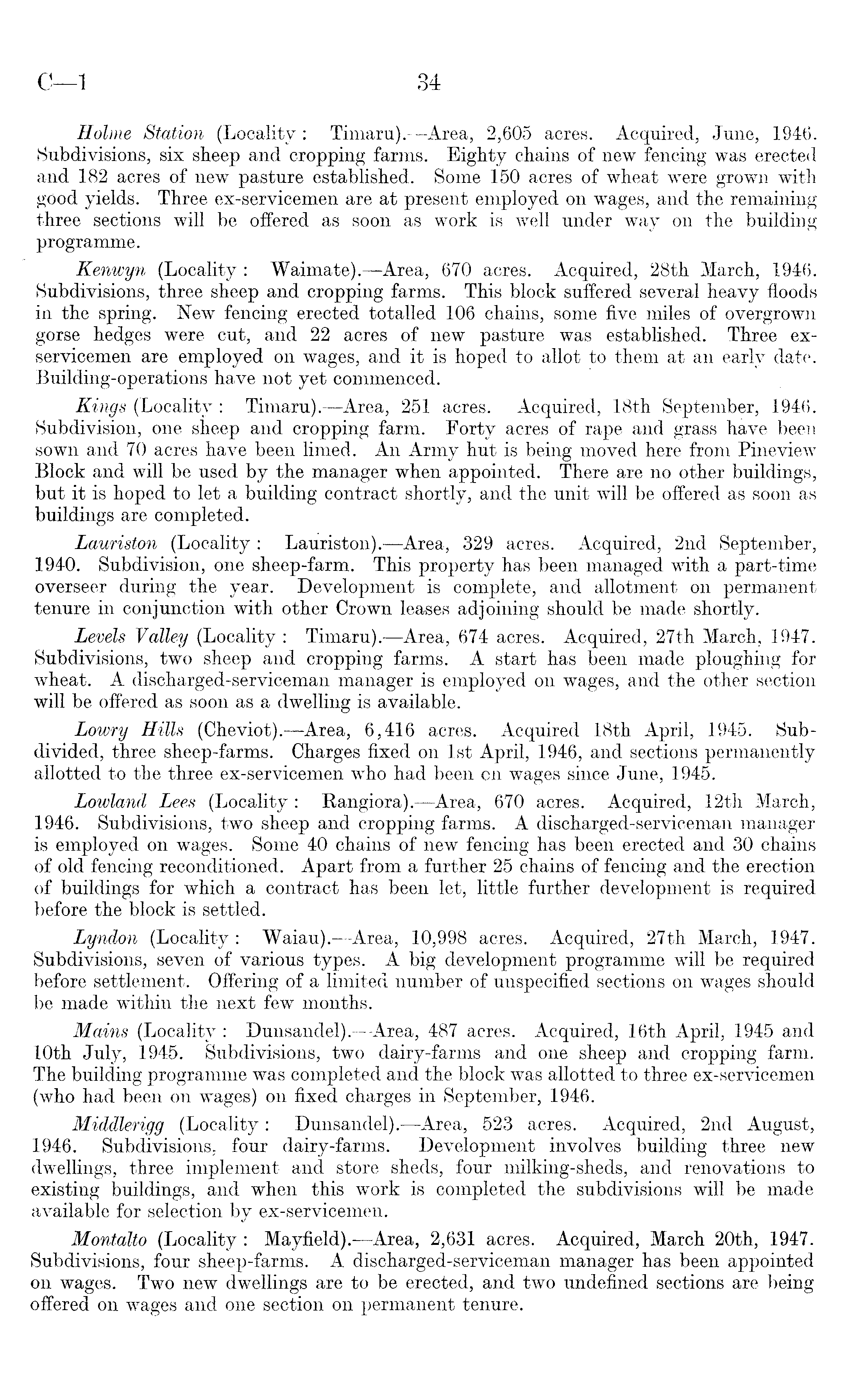 Holme Station (Locality : Timaru). —Area, 2,605 acres. Acquired, June, 1946. Subdivisions, six sheep and cropping farms. Eighty chains of new fencing was erected and 182 acres of new pasture established. Some 150 acres of wheat were grown with good yields. Three ex-servicemen are at present employed on wages, and the remaining three sections will be offered as soon as work is well under way on the building programme. Kenwyn (Locality : Waimate). —Area, 670 acres. Acquired, 28th March, 1946. Subdivisions, three sheep and cropping farms. This block suffered several heavy floods in the spring. New fencing erected totalled 106 chains, some five miles of overgrown gorse hedges were cut, and 22 acres of new pasture was established. Three exservicemen are employed on wages, and it is hoped to allot to them at an early date. Building-operations have not yet commenced. Kings (Locality : Timaru). —Area, 251 acres. Acquired, 18th September, 1946. Subdivision, one sheep and cropping farm. Forty acres of rape and grass have been sown and 70 acres have been limed. An Army hut is being moved here from Pine view Block and will be used by the manager when appointed. There are no other buildings, but it is hoped to let a building contract shortly, and the unit will be offered as soon as buildings are completed. Lauriston (Locality : Lauriston). —Area, 329 acres. Acquired, 2nd September, 1940. Subdivision, one sheep-farm. This property has been managed with a part-time overseer during the year. Development is complete, and allotment on permanent tenure in conjunction with other Crown leases adjoining should be made shortly. Levels Valley (Locality : Timaru). —Area, 674 acres. Acquired, 27th March, 1947. Subdivisions, two sheep and cropping farms. A start has been made ploughing for wheat. A discharged-serviceman manager is employed on wages, and the other section will be offered as soon as a dwelling is available. Lowry Hills (Cheviot). —Area, 6,416 acres. Acquired 18th April, 1945. Subdivided, three sheep-farms. Charges fixed on Ist April, 1946, and sections permanently allotted to the three ex-servicemen who had been on wages since June, 1945. Lowland Lees (Locality : Rangiora). —Area, 670 acres. Acquired, 12th March, 1946. Subdivisions, two sheep and cropping farms. A discharged-serviceman manager is employed on wages. Some 40 chains of new fencing has been erected and 30 chains of old fencing reconditioned. Apart from a further 25 chains of fencing and the erection of buildings for which a contract has been let, little further development is required before the block is settled. Lyndon (Locality : Waiau). —Area, 10,998 acres. Acquired, 27th March, 1947. Subdivisions, seven of various types. A big development programme will be required before settlement. Offering of a limited number of unspecified sections on wages should be made within the next few months. Mains (Locality : Dunsandel). —Area, 487 acres. Acquired, 16th April, 1945 and 10th July, 1945. Subdivisions, two dairy-farms and one sheep and cropping farm. The building programme was completed and the block was allotted to three ex-servicemen (who had been on wages) on fixed charges in September, 1946. Middlerigg (Locality: Dunsandel). —Area, 523 acres. Acquired, 2nd August, 1946. Subdivisions, four dairy-farms. Development involves building three new dwellings, three implement and store sheds, four milking-sheds, and renovations to existing buildings, and when this work is completed the subdivisions will be made available for selection by ex-servicemen. Montalto (Locality : Mayfield). —Area, 2,631 acres. Acquired, March 20th, 1947. Subdivisions, four sheep-farms. A discharged-serviceman manager has been appointed on wages. Two new dwellings are to be erected, and two undefined sections are being offered on wages and one section on permanent tenure.