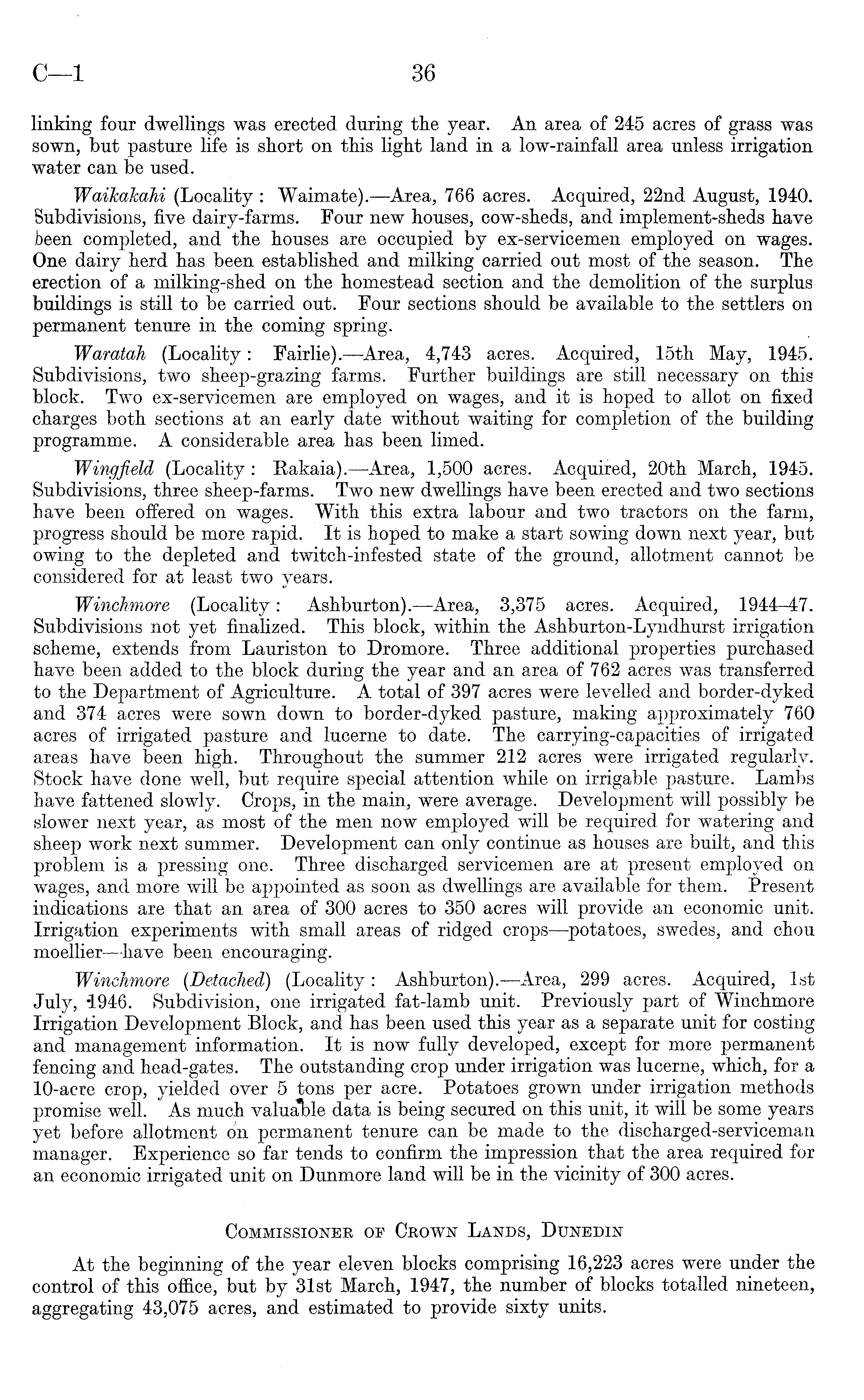 linking four dwellings was erected during the year. An area of 245 acres of grass was sown, but pasture life is short on this light land in a low-rainfall area unless irrigation water can be used. Waikakahi (Locality: Waimate). —Area, 766 acres. Acquired, 22nd August, 1940. Subdivisions, five dairy-farms. Four new houses, cow-sheds, and implement-sheds have been completed, and the houses are occupied by ex-servicemen employed on wages. One dairy herd has been established and milking carried out most of the season. The erection of a milking-shed on the homestead section and the demolition of the surplus buildings is still to be carried out. Four sections should be available to the settlers on permanent tenure in the coming spring. Waratah (Locality: Fairlie). —Area, 4,743 acres. Acquired, 15th May, 1945. Subdivisions, two sheep-grazing farms. Further buildings are still necessary on this block. Two ex-servicemen are employed on wages, and it is hoped to allot on fixed charges both sections at an early date without waiting for completion of the building programme. A considerable area has been limed. Wingfield (Locality : Rakaia). —Area, 1,500 acres. Acquired, 20th March, 1945. Subdivisions, three sheep-farms. Two new dwellings have been erected and two sections have been offered on wages. With this extra labour and two tractors on the farm, progress should be more rapid. It is hoped to make a start sowing down next year, but owing to the depleted and twitch-infested state of the ground, allotment cannot be considered for at least two years. Winchmore (Locality: Ashburton). —Area, 3,375 acres. Acquired, 1944-47. Subdivisions not yet finalized. This block, within the Ashburton-Lyndhurst irrigation scheme, extends from Lauriston to Dromore. Three additional properties purchased have been added to the block during the year and an area of 762 acres was transferred to the Department of Agriculture. A total of 397 acres were levelled and border-dyked and 374 acres were sown down to border-dyked pasture, making approximately 760 acres of irrigated pasture and lucerne to date. The carrying-capacities of irrigated areas have been high. Throughout the summer 212 acres were irrigated regularly. Stock have done well, but require special attention while on irrigable pasture. Lambs have fattened slowly. Crops, in the main, were average. Development will possibly be slower next year, as most of the men now employed will be required for watering and sheep work next summer. Development can only continue as houses are built, and this problem is a pressing one. Three discharged servicemen are at present employed on wages, and more will be appointed as soon as dwellings are available for them. Present indications are that an area of 300 acres to 350 acres will provide an economic unit. Irrigation experiments with small areas of ridged crops —potatoes, swedes, and chou moellier —have been encouraging. Winchmore (Detached) (Locality : Ashburton). —Area, 299 acres. Acquired, Ist July, *1946. Subdivision, one irrigated fat-lamb unit. Previously part of Winchmore Irrigation Development Block, and has been used this year as a separate unit for costing and management information. It is now fully developed, except for more permanent fencing and head-gates. The outstanding crop under irrigation was lucerne, which, for a 10-acre crop, yielded over 5 tons per acre. Potatoes grown under irrigation methods promise well. As much valuable data is being secured on this unit, it will be some years yet before allotment on permanent tenure can be made to the discharged-serviceman manager. Experience so far tends to confirm the impression that the area required for an economic irrigated unit on Dunmore land will be in the vicinity of 300 acres. Commissioner of Crown Lands, Dunedin At the beginning of the year eleven blocks comprising 16,223 acres were under the control of this office, but by 31st March, 1947, the number of blocks totalled nineteen, aggregating 43,075 acres, and estimated to provide sixty units.