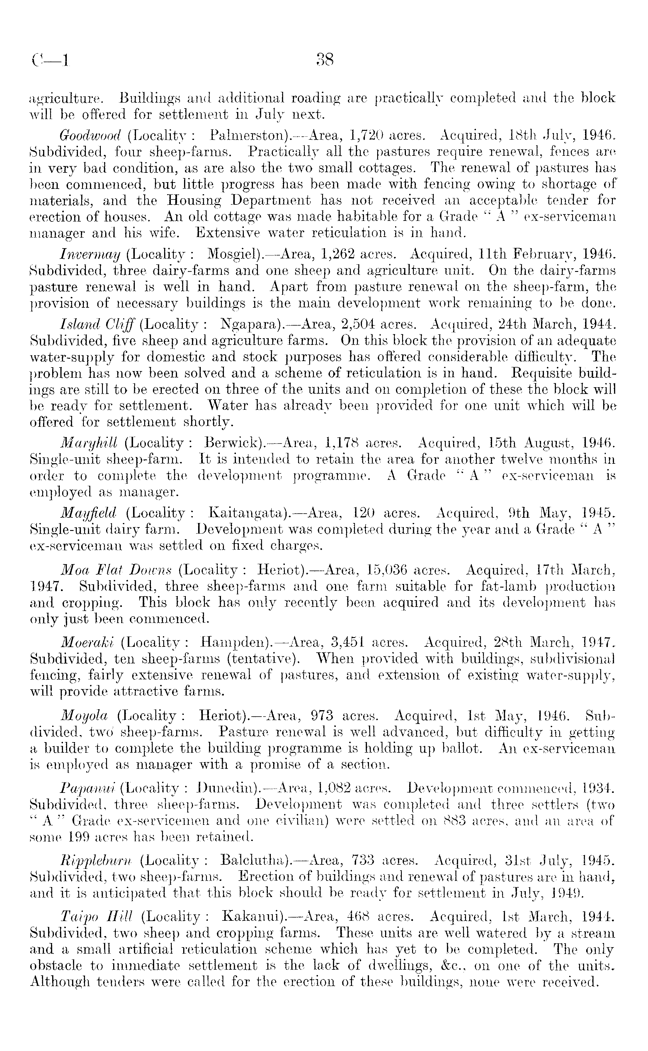 agriculture. Buildings and additional roading are practically completed and the block Avill be offered for settlement in July next. Goodwood (Locality : Palmerston). —Area, 1,720 acres. Acquired, 18th July, 1946. Subdivided, four sheep-farms. Practically all the pastures require renewal, fences are in very bad condition, as are also the two small cottages. The renewal of pastures has been commenced, but little progress has been made with fencing owing to shortage of materials, and the Housing Department has not received an acceptable tender for erection of houses. An old cottage was made habitable for a Grade "A " ex-serviceman manager and his wife. Extensive water reticulation is in hand. Invermay (Locality : Mosgiel). —Area, 1,262 acres. Acquired, 11th February, 1946. Subdivided, three dairy-farms and one sheep and agriculture unit. On the dairy-farms pasture renewal is well in hand. Apart from pasture renewal on the sheep-farm, the provision of necessary buildings is the main development work remaining to be done. Island Cliff (Locality : Ngapara).—Area, 2,504 acres. Acquired, 24th March, 1944. Subdivided, five sheep and agriculture farms. On this block the provision of an adequate water-supply for domestic and stock purposes has offered considerable difficulty. The problem has now been solved and a scheme of reticulation is in hand. Requisite buildings are still to be erected on three of the units and on completion of these the block will be ready for settlement. Water has already been provided for one unit which will be offered for settlement shortly. Maryhill (Locality : Berwick). —Area, 1,178 acres. Acquired, 15th August, 1946. Single-unit sheep-farm. It is intended to retain the area for another twelve months in order to complete the development programme. A Grade "A" ex-serviceman is employed as manager. Mayfield (Locality : Kaitangata).—Area, 120 acres. Acquired, 9th May, 1945. Single-unit dairy farm. Development was completed during the year and a Grade "A " ex-serviceman was settled on fixed charges. Moa Flat Doivns (Locality : Heriot). —Area, 15,036 acres. Acquired, 17th March, 1947. Subdivided, three sheep-farms and one farm suitable for fat-lamb production and cropping. This block has only recently been acquired and its development has only just been commenced. Moeraki (Locality : Hampden).—Area, 3,451 acres. Acquired, 28th March, 1947. Subdivided, ten sheep-farms (tentative). When provided with buildings, subdivisional fencing, fairly extensive renewal of pastures, and extension of existing water-supply, will provide attractive farms. Moyola (Locality : Heriot).—Area, 973 acres. Acquired, Ist May, 1946. Subdivided, twc/ sheep-farms. Pasture renewal is well advanced, but difficulty in getting a builder to complete the building programme is holding up ballot. An ex-serviceman is employed as manager with a promise of a section. Papanui (Locality : Dunedin). —Area, 1,082 acres. Development commenced, 1934. Subdivided, three sheep-farms. Development was completed and three settlers (two " A " Grade ex-servicemen and one civilian) were settled on 883 acres, and an area of some 199 acres has been retained. Rippleburn (Locality : Balclutha). —Area, 733 acres. Acquired, 31st July, 1945. Subdivided, two sheep-farms. Erection of buildings and renewal of pastures are in hand, and it is anticipated that this block should be ready for settlement in July, 1949. Taipo Hill (Locality : Kakanui). —Area, 468 acres. Acquired, Ist March, 1944. Subdivided, two sheep and cropping farms. These units are well watered by a stream and a small artificial reticulation scheme which has yet to be completed. The only obstacle to immediate settlement is the lack of dwellings, &c., on one of the units. Although tenders were called for the erection of these buildings, none were received.