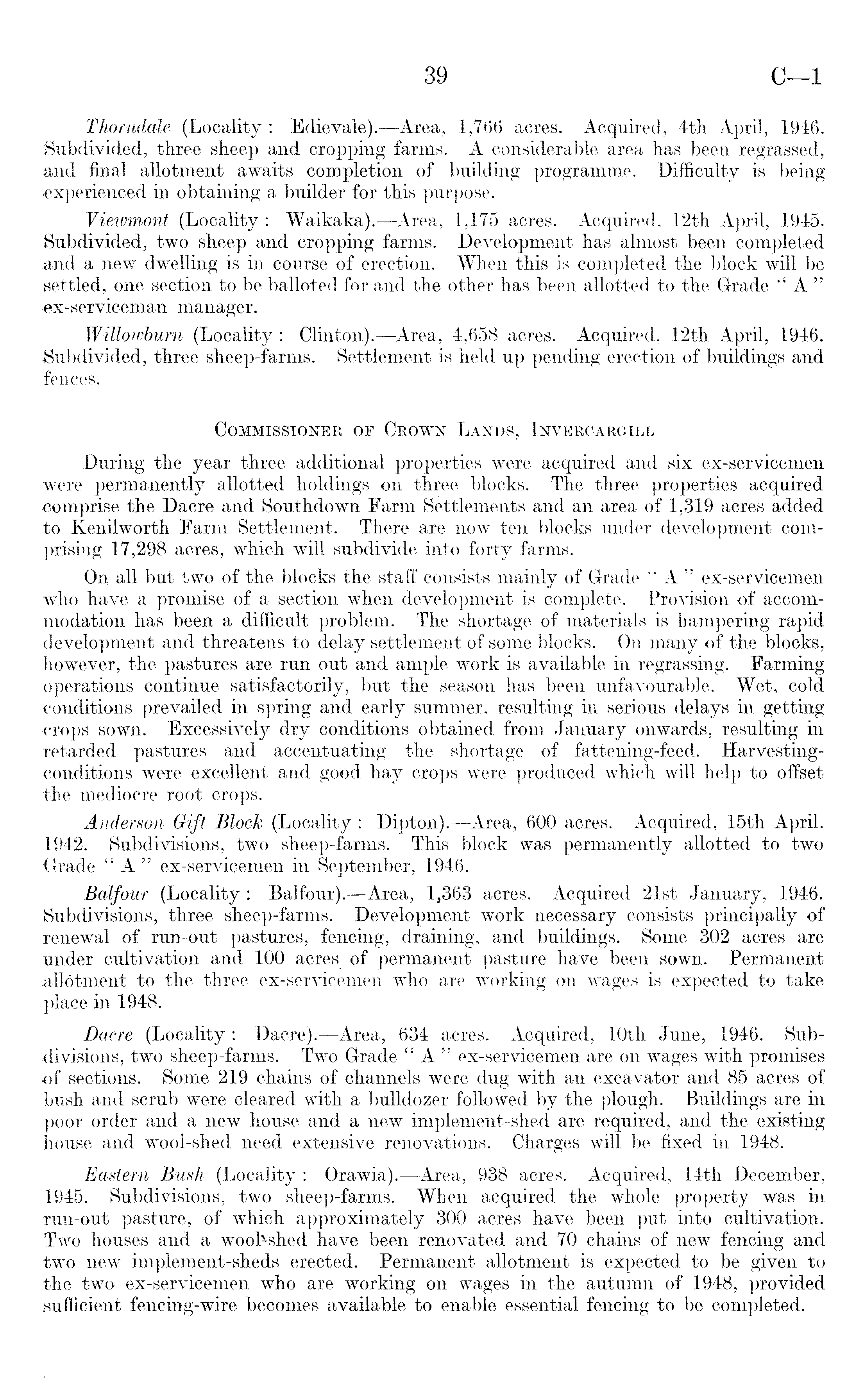 Thorndale (Locality : Edievale). —Area, 1,766 acres. Acquired, 4th April, 1946. Subdivided, three sheep and cropping farms. A considerable area has been regrassed, and final allotment awaits completion of building programme. Difficulty is being experienced in obtaining a builder for this purpose. Viewmont (Locality : Waikaka). —Area, 1,175 acres. Acquired, 12th April, 1945. Subdivided, two sheep and cropping farms. Development has almost been completed and a new dwelling is in course of erection. When this is completed the block will be settled, one section to be balloted for and the other has been allotted to the Grade " A " ex-serviceman manager. Willowburn (Locality : Clinton). —Area, 4,658 acres. Acquired, 12th April, 1946. Subdivided, three sheep-farms. Settlement is held up pending erection of buildings and fences. Commissioner of Crown Lands, Invercargill During the year three additional properties were acquired and six ex-servicemen were permanently allotted holdings on three blocks. The three properties acquired ■comprise the Dacre and Southdown Farm Settlements and an area of 1,319 acres added to Kenilworth Farm Settlement. There are now ten blocks under development comprising 17,298 acres, which will subdivide into forty farms. On all but two of the blocks the staff consists mainly of Grade " A " ex-servicemen who have a promise of a section when development is complete. Provision of accommodation has been a difficult problem. The shortage of materials is hampering rapid development and threatens to delay settlement of some blocks. On many of the blocks, however, the pastures are run out and ample work is available in regrassing. Farming operations continue satisfactorily, but the season has been unfavourable. Wet, cold conditions prevailed in spring and early summer, resulting in serious delays in getting crops sown. Excessively dry conditions obtained from January onwards, resulting in retarded pastures and accentuating the shortage of fattening-feed. Harvestingconditions were excellent and good hay crops were produced which will help to offset the mediocre root crops. Anderson Gift Block (Locality : Dipton).—Area, 600 acres. Acquired, 15th April, 1942. Subdivisions, two sheep-farms. This block was permanently allotted to two Grade " A " ex-servicemen in September, 1946. Balfour (Locality: Balfour). —Area, 1,363 acres. Acquired 21st January, 1946. Subdivisions, three sheep-farms. Development work necessary consists principally of renewal of run-out pastures, fencing, draining, and buildings. Some 302 acres are under cultivation and 100 acres of permanent pasture have been sown. Permanent allotment to the three ex-servicemen who are working on wages is expected to take place in 1948. Dacre (Locality: Dacre). —Area, 634 acres. Acquired, 10th June, 1946. Subdivisions, two sheep-farms. Two Grade "A " ex-servicemen are on wages with promises of sections. Some 219 chains of channels were dug with an excavator and 85 acres of bush and scrub were cleared with a bulldozer followed by the plough. Buildings are in poor order and a new house and a new implement-shed are required, and the existing house and wool-shed need extensive renovations. Charges will be fixed in 1948. Eastern Bush (Locality : Orawia). —Area, 938 acres. Acquired, 14th December, 1945. Subdivisions, two sheep-farms. When acquired the whole property was in run-out pasture, of which approximately 300 acres have been put into cultivation. Two houses and a woodshed have been renovated and 70 chains of new fencing and two new implement-sheds erected. Permanent allotment'' is expected to be given to the two ex-servicemen who are working on wages in the autumn of 1948, provided sufficient fencing-wire becomes available to enable essential fencing to be completed.