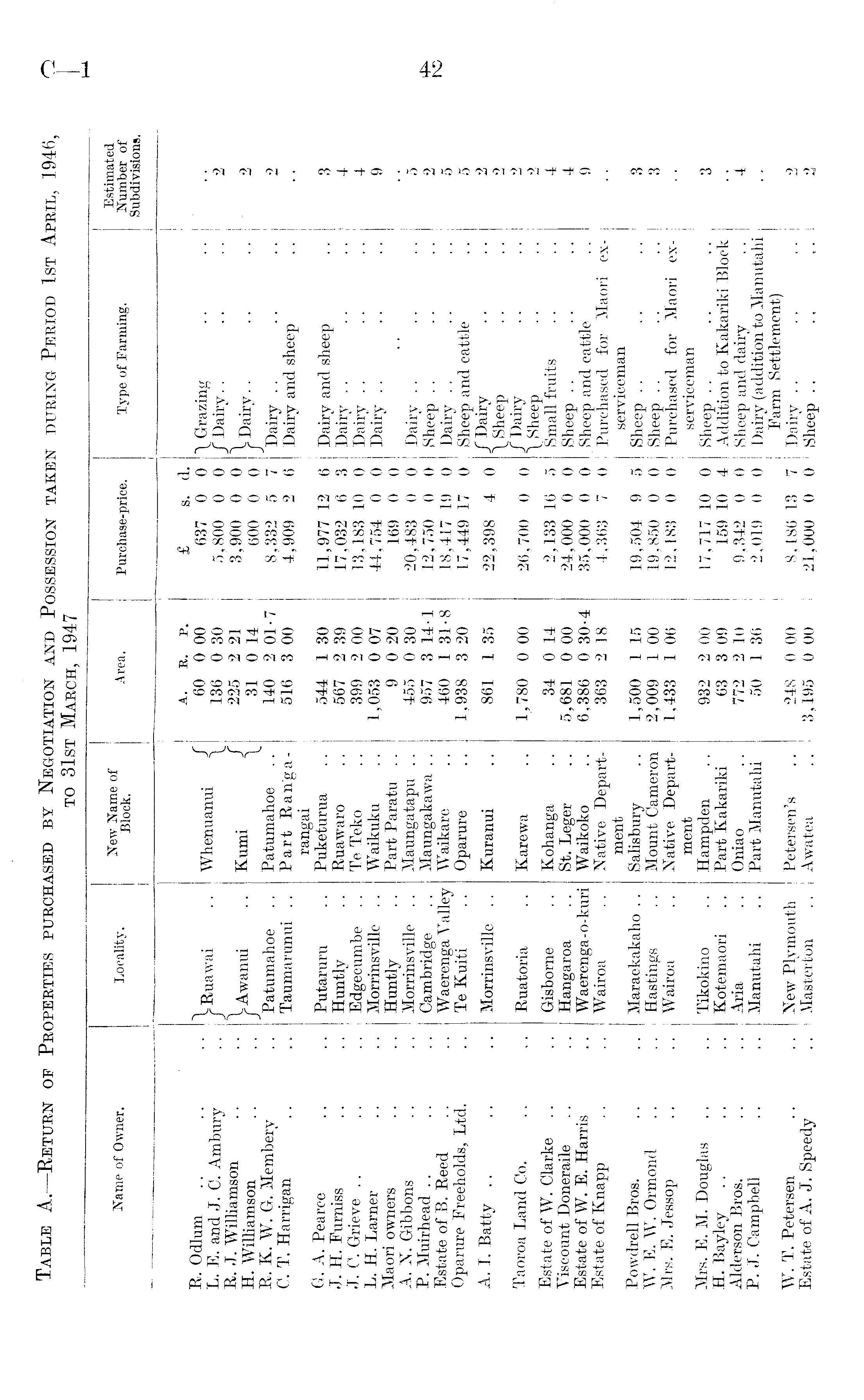 Name of Owner. Locality. New Name of Block. Area. Purchase-price. 1 Type of Farming. I Estimated Number of Subdivisions. R. Odium L. E. and J. C. Ambury A. E. p. £ s. d. Ruawai Whenuanui 60 136 0 0 00 30 . 637 5,800 0 0 0 0 \ Grazing /Dairy. . 2 R. J. Williamson H. Williamson j=Awanui Kumi 225 31 2 0 21 14 3,900 600 0 0 0 0 > Dairy.. J 2 R. K. W. G. Membery Patumahoe Patumahoe 140 2 01-7 8,332 5 7 Dairy 2 C. T. Harrigan Taumarunui .. Part Ran'ga516 3 00 4,909 2 6 Dairy and sheep G. A. Pearce rangai Putaruru Puketurua 544 1 30 11,977 12 6 Dairy and sheep 3 J. H. Furniss Huntly Ruawaro 567 2 39 17,032 6 3 Dairy 4 J. C. Grieve Edgecumbe .. Te Teko 399 2 00 13,183 10 0 Dairy 4 L. H. Larner Morrinsville . . Waikuku 1,053 0 07 44,754 0 0 Dairy 9 Maori owners Huntly Part Paratu .. 9 0 20 169 0 0 A. N. Gibbons Morrinsville .. Maungatapu .. 455 0 30 20,483 0 0 Dairy 5 P. Muirhead Cambridge Maungakawa . . 957 3 14-1 12,750 0 0 Sheep 2 Estate of B. Reed Waerenga Valley Waikare 460 1 31-8 18,417 19 0 Dairy 5 Oparure Freeholds, Ltd. Te Kuiti Oparure .. . 1,938 3 20 17,449 17 0 Sheep and cattle 5 A. I. Batty Morrinsville .. Kuranui 861 1 35 22,398 4 0 /Dairy \ Sheep 2 2 Taoroa Land Co. Ruatoria Karewa 1,780 0 00 26,700 0 0 5 / Dairy 2 Estate of W. Clarke Gisborne Kohanga 34 0 14 2,133 16 \ Sheep Small fruits 2 4 Viscount Doneraile Hangaroa St. Leger 5,681 0 00 24,000 0 0 Sheep 4 Estate of W. E. Harris Waerenga-o-kuri Waikoko 6,386 0 30-4 35,000 0 0 . Sheep and cattle 9 Estate of Knapp Wairoa Native Depart363 2 18 4,363 7 0 Purchased for Maori exPowdrell Bros. ment serviceman Maraekakaho .. Salisbury 1,500 1 15 19,504 9 5 Sheep 3 W. E. W. Ormond Hastings Mount Cameron 2,009 1 00 19,850 0 0 Sheep 3 Mrs. E. Jessop Wairoa Native Depart1,433 1 06 12,183 0 0 Purchased for Maori exMrs. E. M. Douglas ment serviceman Tikokino Hampden 932 2 00 17,717 10 0 Sheep 3 H. Bayley Kotemaori Part Kakariki 63 3 09 159 10 4 Addition to Kakariki Block Alderson Bros. Aria Oniao 772 2 10 9,342 0 0 Sheep and dairy 4 P. J. Campbell Manutahi Part Manutahi 50 1 36 2,019 0 0 Dairy (addition to Manutahi W. T. Petersen Farm Settlement) New Plymouth Petersen's 248 0 00 8,186 13 7 Dairy 2 Estate of A. J. Speedy I Masterton Awatea 3,195 0 00 21,000 0 0 Sheep 1 2