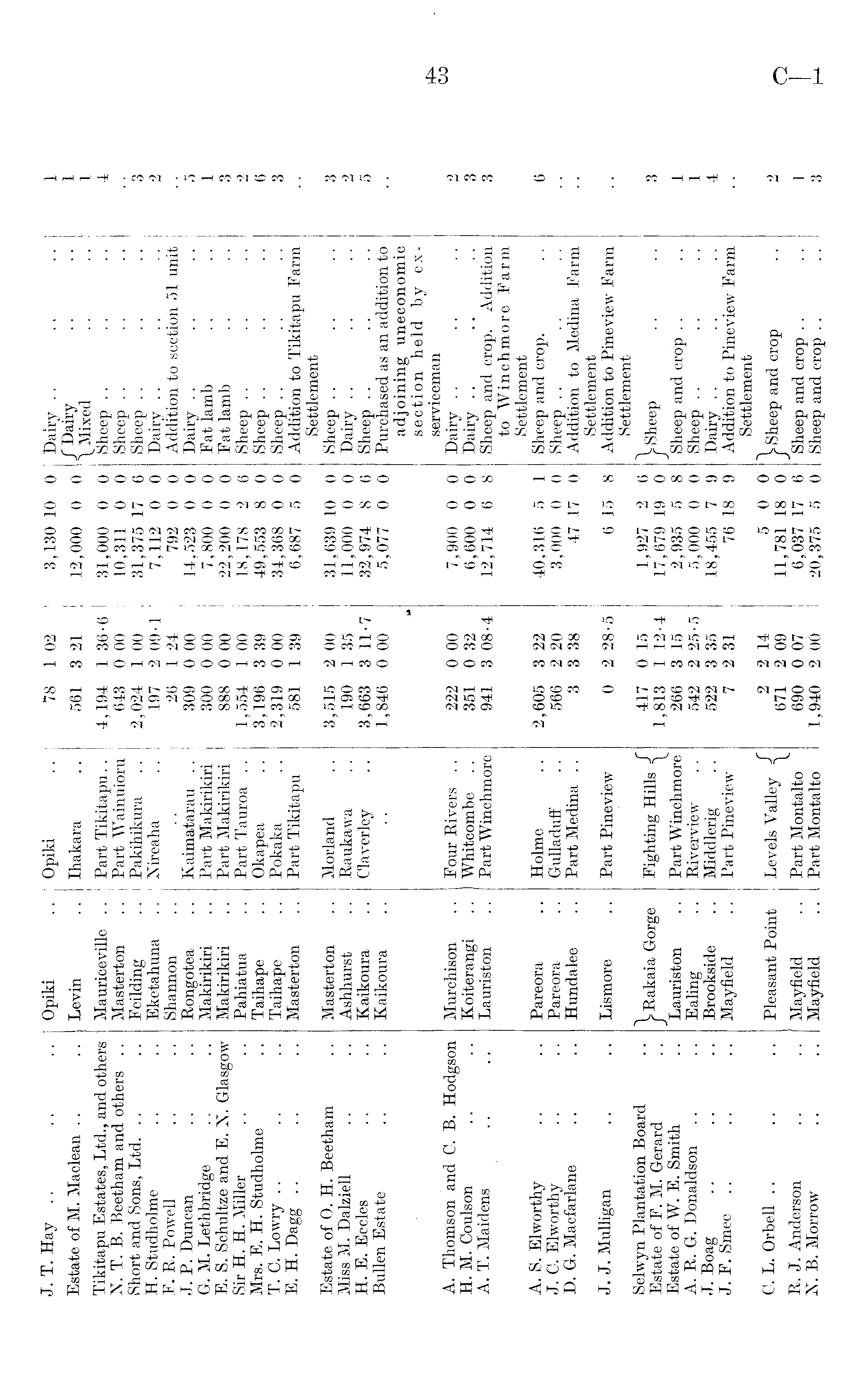 J. T. Hay .. .. .. Opiki .. Opiki .. 78 1 02- 1 3,130 10 0 Dairy .. .. .. 1 Estate of M. Maclean .. .. Levin .. Ihakara .. 561 3 21 , 12,000 0 0 } \ Mixed .. .. 1 Tikitapu Estates, Ltd., and others Mauriceville .. Part Tikitapu.. 4,194 1 36-6 31,000 0 0 Sheep .. .. .. 4 N. T. B. Beetham and others .. Masterton .. Part Wainuioru 643 0 00 10,311 0 0 Sheep .. Short and Sons, Ltd. .. .. Feilding .. j Pakihikura .. 2,024 1 00 31,375 17 6 Sheep.. .. .. 3 H. Studholme .. .. Eketahuna .. Nireaha .. 197 2 09-1 7,112 0 0 Dairy .. .. .. 2 F. R. Powell .. .. Shannon .. .. 26 1 24 ; 792 0 0 Addition to section 51 unit J.P.Duncan .. .. Rongotea .. Kaimatarau .. 309 0 00 j 14,523 0 0 Dairy .. .. .. 5 G. M. Lethbridge .. .. Makirikiri . . Part Makirilciri 300 0 00 7,800 0 0 Eat lamb .. . . 1 E. S. Schultze and E. N. Glasgow Makirikiri .. Part Makirikiri 888 0 00 22,200 0 0 Eat lamb .. .. 3 Sir H. H. Miller .. .. Pahiatua .. Part Tauroa .. 1,554 1 00 18,178 2 6 Sheep .. .. .. 2 Mrs. E. H. Studholme .. Taihape .. Okapea .. 3,196 3 39 49,553 8 0 Sheep .. .. .. 6 T. C. Lowry.. .. .. Taihape .. Pokaka .. 2,319 0 00 34,368 0 0 Sheep.. .. .. 3 E. H. Dagg .. .. .. Masterton .. Part Tikitapu 581 1 39 6,687 5 0 Addition to Tikitapu Earm Settlement Estate of 0. H. Beetham .. Masterton .. Morland .. 3,515 2 00 31,639 10 0 Sheep.. .. .. 3 Miss M. Dalziell .. .. Ashhurst .. Raukawa .. 190 1 35 11,000 0 0 Dairy .. .. .. 2 H. E. Eccles .. .. Kaikoura .. Claverley .. 3,663 3 11-7 32,974 8 6 Sheep .. .. .. 5 Bullen Estate .. .. Kaikoura .. .. 1,846 0 00 5,077 0 0 Purchased as an addition to m adjoining uneconomic section held by exserviceman A. Thomson and C. B. Hodgson Murchison .. Four Rivers .. 222 0 00 7,900 0 0 Dairy .. .. .. 2 H. M. Coulson .. .. Koiterangi .. Whitcombe .. 351 0 32 6,600 0 0 Dairy .. .. .. 3 A. T. Maidens .. . . Lauriston .. Part Winchmore 941 3 08-4 12,714 6 8 Sheep and crop. Addition 3 to Winchmore Farm Settlement A. S. Elworthy .. .. Parebra .. Holme .. 2,605 3 22 40,316 5 1 Sheep and crop. .. 6 J. C. Elworthy .. .. Pareora .. GulladufF .. 566 2 20 3,000 0 0 Sheep .. D. G. Macfarlane .. .. Hundalee .. Part Medina .. 3 3 38 47 17 0 Addition to Medina Farm Settlement J. J. Mulligan .. .. Lismore .. Part Pineview 0 2 28-5 6 15 8 Addition to Pineview Farm Settlement Selwyn Plantation Board • • 1 x» i • n •». ,,,• TT . nl f 417 0 15 1,927 2 6 1 Estate of F.M. Gerard .. Gorge Fighting Hills j 1 12 . 4 17 ; 679 19 0 }Sheep .. .. 3 Estate of W. E. Smith .. Lauriston .. Part Winchmore 266 3 15 2'935 5 8 Sheep and crop .. .. 1 A. R. G. Donaldson .. .. Ealing .. Riverview .. 542 2 25-5 5,000 0 0 Sheep .. .. .. 1 J. Boag .. .. .. Brookside .. Middlerig .. 522 3 35 18,455 7 9 Dairy .. .. .. 4 J. F. Smee .. .. .. Mayfield .. Part Pineview 7231 76189 Addition to Pineview Farm Settlement C. L. Orbell .. .. .. Pleasant Point Levels Valley 2 qq XI 781 18 0 / Sheep and crop .. 2 R.J.Anderson .. .. Mayfield .. Part Montalto 690 0 07 17 6 Sheep and crop .. .. 1 N.B.Morrow .. .. Mayfield .. Part Montalto 1,940 2 00 20,375 5 0 Sheep and crop . . .. 3