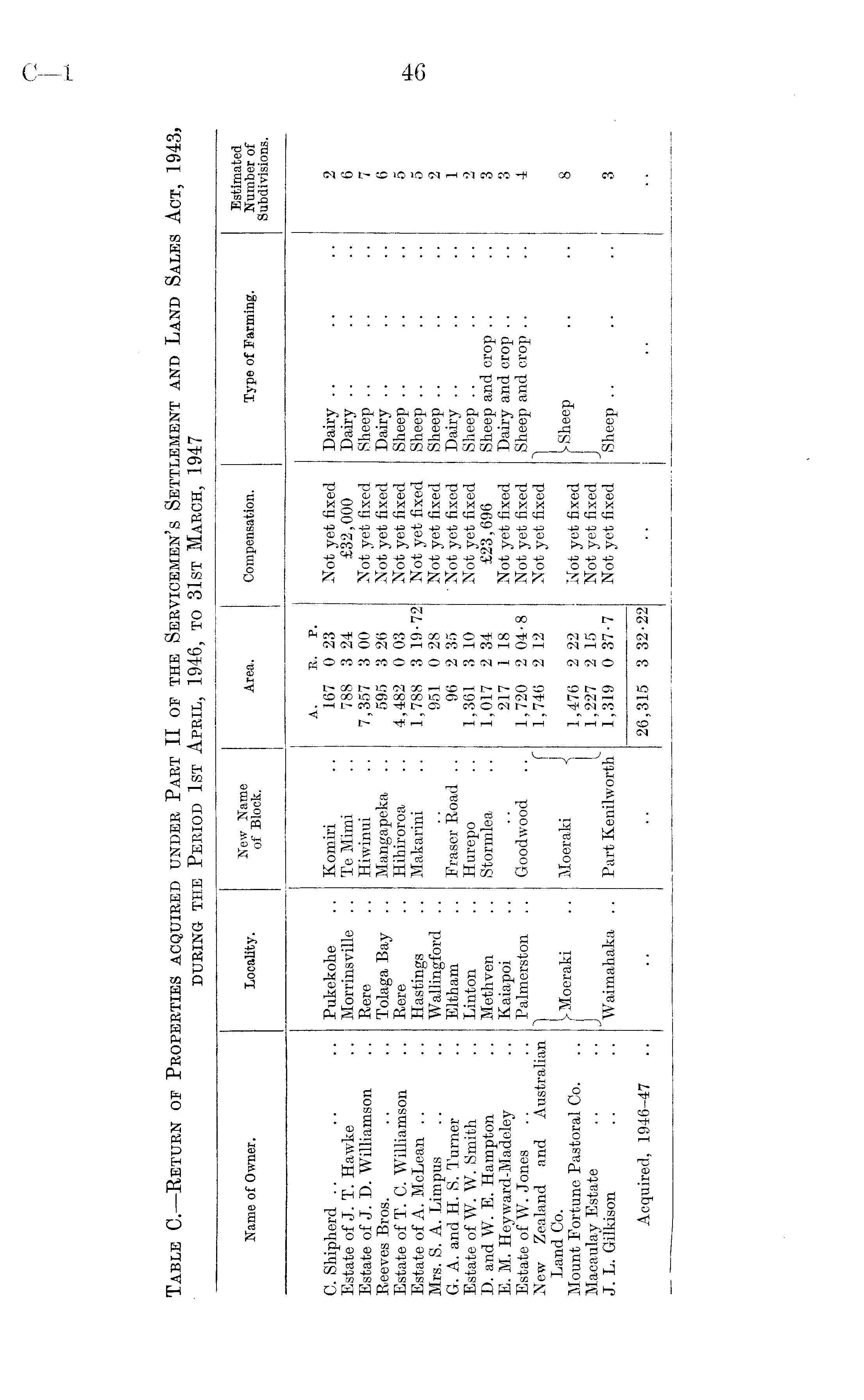 Name of Owner. Locality. New Name of Block. Area. Compensation. Type of Farming. Estimated Number of Subdivisions. 0. Shipherd .. Estate of J. T. Hawke Estate of J. D. Williamson Reeves Bros. Estate of T. C. Williamson Estate of A. McLean Mrs. S. A. Limpus G. A. and H. S. Turner Estate of W. W. Smith D. and W. E. Hampton E. M. Heyward-Madeley Estate of W. Jones New Zealand and Australian Land Co. Mount Fortune Pastoral Co. Macaulay Estate J. L. Gilkison Acquired, 1946-47 Pukekohe Morrinsville .. Rere Tolaga Bay .. Rere Hastings Wallingford . . Eltham Linton Methven Kaiapoi Palmerston Moeraki J Waimahaka .. Komiri Te Mimi Hiwinui Mangapeka .. Hihiroroa Makarini Fraser Road .. Hurepo Stormlea Goodwood r Moeraki Part Kenilworth A. B. P. 167 0 23 788 3 24 7,357 3 00 595 3 26 4,482 0 03 1,788 3 19-72 951 0 28 96 2 35 1,361 3 10 1,017 2 34 217 1 18 1,720 2 04-8 1,746 2 12 1,476 2 22 1,227 2 15 1,319 0 37-7 Not yet fixed £32,000 Not yet fixed Not yet fixed Not yet fixed Not yet fixed Not yet fixed ' Not yet fixed Not yet fixed £23,696 Not yet fixed Not yet fixed Not yet fixed Not yet fixed Not yet fixed Not yet fixed Dairy Dairy Sheep Dairy Sheep Sheep Sheep Dairy Sheep Sheep and crop Dairy and crop Sheep and crop .. |>Sheep Sheep 2 6 7 6 5 5 2 1 2 3 3 4 8 3 26,315 3 32-22