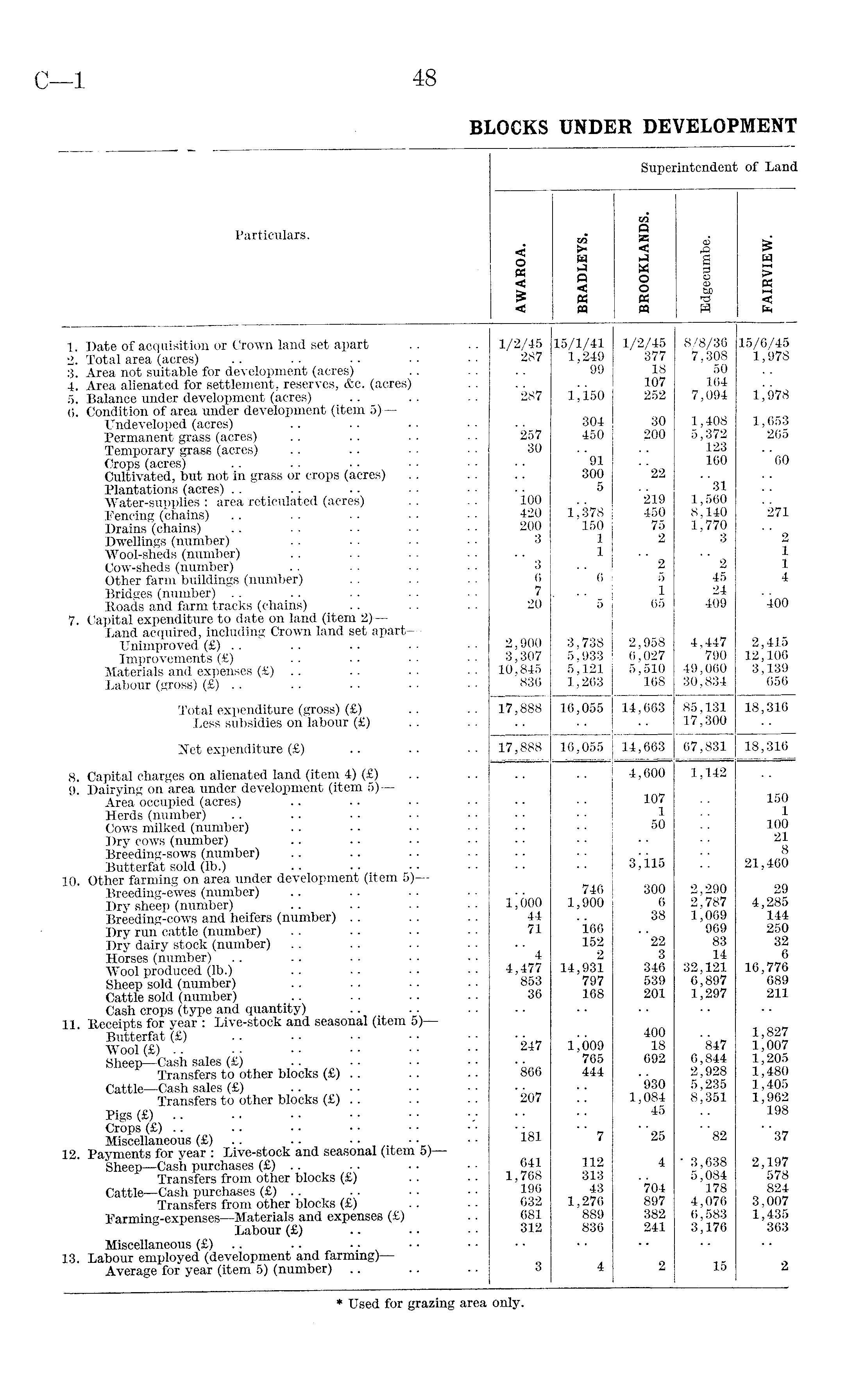 Superintendent of Land Particulars. 5/2 Q S5 ■5 > <1 J o « < & H p-J P < K ►J X O O « 1 0 so T3 s > K < < « pa H 1. Date of acquisition or Crown land set apart 1/2/45 15/1/41 1/2/45 8/8/36 15/6/45 2. Total area (acres) 287 1,249 377 7,308 1,978 3. Area not suitable for development (acres) 99 18 50 4. Area alienated for settlement, reserves, &c. (acres) 107 164 1 j 978 5. Balance under development (acres) '287 1^50 252 7,094 6. Condition of area under development (item 5) — 304 30 1,408 1,653 Undeveloped (acres) Permanent grass (acres) 257 450 200 5,372 265 Temporary grass (acres) 30 "91 123 Crops (acres) ' '22 160 60 Cultivated, but not in grass or crops (acres) 300 ' '31 Plantations (acres) ioo 5 219 Water-supplies : area reticulated (acres) 1 j 378 1,560 *271 Fencing (chains) 420 450 8,140 Drains (chains) 200 150 75 1,770 Dwellings (number) 3 1 2 3 2 Wool-sheds (number) 1 1 Cow-sheds (number) 3 6 2 2 1 Other farm buildings (number) 6 5 45 4 Bridges (number) 7 1 24 '400 Roads and farm tracks (chains) 20 5 65 409 7. Capital expenditure to date on land (item 2) — Land acquired, including Crown land set apart— 3,738 2,958 4,447 2,415 Unimproved (£) .. 2,900 Improvements (£) 3,307 5,933 6,027 790 12,106 Materials and expenses (£) .. 10,845 5,121 5,510 49,060 3,139 Labour (gross) (£) .. 836 1,263 168 30,834 656 Total expenditure (gross) (£) 17,888 16,055 14,663 85,131 18,316 Less subsidies on labour (£) 17,300 Net expenditure (£) 17,888 16,055 14,663 67,831 18,316 8. Capital charges on alienated land (item 4) (£) 4,600 1,142 9. Dairying on area under development (item 5) — 107 150 Area occupied (acres) Herds (number) 1 1 Cows milked (number) 50 100 21 Dry cows (number) Breeding-sows (number) 3 j 115 21,460 Butterfat sold (lb.) 10. Other farming on area under development (item 5) — 746 300 2,290 2,787 29 Breeding-ewes (number) 1^000 Dry sheep (number) 1,900 6 4,285 Breeding-cows and heifers (number) 44 'i66 38 1,069 144 Dry run cattle (number) 71 ' '22 969 250 Dry dairy stock (number) 152 83 32 Horses (number) 4 2 3 14 16,776 Wool produced (lb.) 4,477 14,931 346 32,121 Sheep sold (number) 853 797 539 6,897 689 Cattle sold (number) 36 168 201 1,297 211 Cash crops (type and quantity) .. 11. Receipts for year : Live-stock and seasonal (item 5) — 400 1,827 Butterfat (£) '847 Wool (£) .. Sheep—Cash sales (£) .. Transfers to other blocks (£) .. '247 1 18 1,007 '866 765 444 692 6,844 2,928 1,205 1,480 Cattle—Cash sales (£) '207 930 5,235 1,405 Transfers to other blocks (£) .. 1,084 8,351 1,962 Pigs (£) 45 198 Crops (£) .. Miscellaneous (£) • • • • • ■ 'isi 7 "25 "82 "37 12. Payments for year : Live-stock and seasonal (item 5) — 641 112 2,197 Sheep—Cash purchases (£) .. 4 ' 3,638 Transfers from other blocks (£) 1,768 313 '704 5,084 578 Cattle —Cash purchases (£) .. 196 43 178 824 Transfers from other blocks (£) 632 1,276 897 4,076 3,007 Farming-expenses —Materials and expenses (£) Labour (£) 681 312 889 836 382 241 6,583 3,176 1,435 363 Miscellaneous (£) .. 13. Labour employed (development and farming)— 15 2 Average for year (item 5) (number) 3 4 2 * Used for grazing area only.