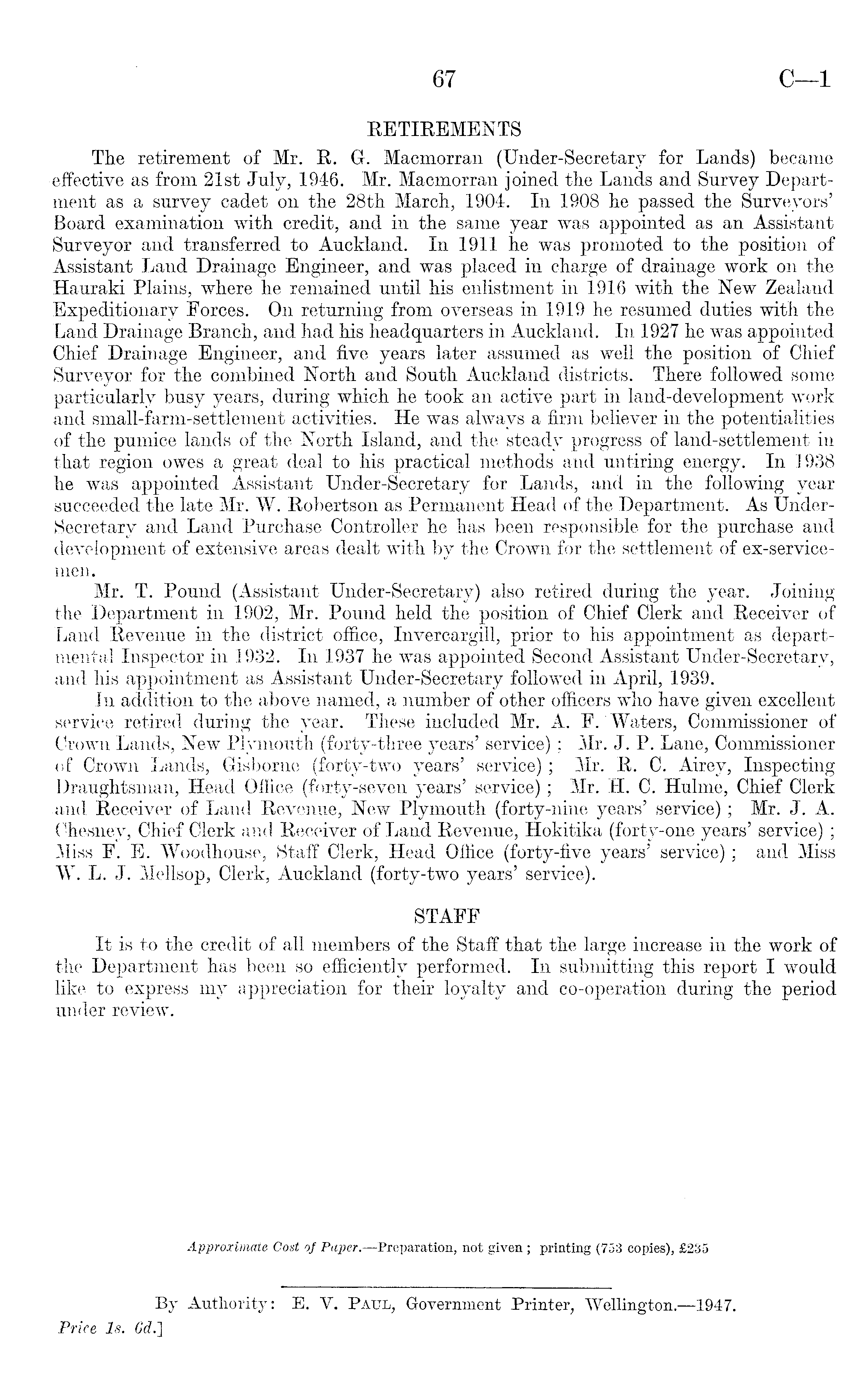 RETIREMENTS The retirement of Mr. R. Gr. Macmorran (Under-Secretary for Lands) became •effective as from 21st July, 1946. Mr. Macmorran joined the Lands and Survey Department as a survey cadet on the 28th March, 1904. In 1908 he passed the Surveyors' Board examination with credit, and in the same year was appointed as an Assistant Surveyor and transferred to Auckland. In 1911 he was promoted to the position of Assistant Land Drainage Engineer, and was placed in charge of drainage work on the Hauraki Plains, where he remained until his enlistment in 1916 with the New Zealand Expeditionary Forces. On returning from overseas in 1919 he resumed duties with the Land Drainage Branch, and had his headquarters in Auckland. In 1927 he was appointed Chief Drainage Engineer, and five years later assumed as well the position of Chief Surveyor for the combined North and South Auckland districts. There followed some particularly busy years, during which he took an active part in land-development work and small-farm-settlement activities. He was always a firm believer in the potentialities of the pumice lands of the North Island, and the steady progress Of land-settlement in that region owes a great deal to his practical methods and untiring energy. In 1938 he was appointed Assistant Under-Secretary for Lands, and in the following year succeeded the late Mr. W. Robertson as Permanent Head of the Department. As UnderSecretary and Land Purchase Controller he has been responsible for the purchase and •development of extensive areas dealt with by the Crown for the settlement of ex-service-men. Mr. T. Pound (Assistant Under-Secretary) also retired during the year. Joining the Department in 1902, Mr. Pound held the position of Chief Clerk and Receiver of Land Revenue in the district office, Invercargill, prior to his appointment as departmental Inspector in 1932. In 1937 he was appointed Second Assistant Under-Secretary, and his appointment as Assistant Under-Secretary followed in April, 1939. In addition to the above named, a number of other officers who have given excellent .service retired during the year. These included Mr. A. F. Waters, Commissioner of Crown Lands, New Plymouth (forty-three years' service); Mr. J. P. Lane, Commissioner of Crown Lands, Gisborne (forty-two years' service); Mr. R. C. Airey, Inspecting Draughtsman, Head Office (forty-seven years' service); Mr. H. C. Hulme, Chief Clerk and Receiver of Land Revenue, New Plymouth (forty-nine years' service) ; Mr. J. A. Chesney, Chief Clerk and Receiver of Land Revenue, Hokitika (forty-one years' service) ; Miss F. E. Woodhouse, Staff Clerk, Head Office (forty-five years' service); and Miss W. L. J. Mellsop, Clerk, Auckland (forty-two years' service). STAFF It is to the credit of all members of the Staff that the large increase in the work of the Department has been so efficiently performed. In submitting this report I would like to express my appreciation for their loyalty and co-operation during the period under review.