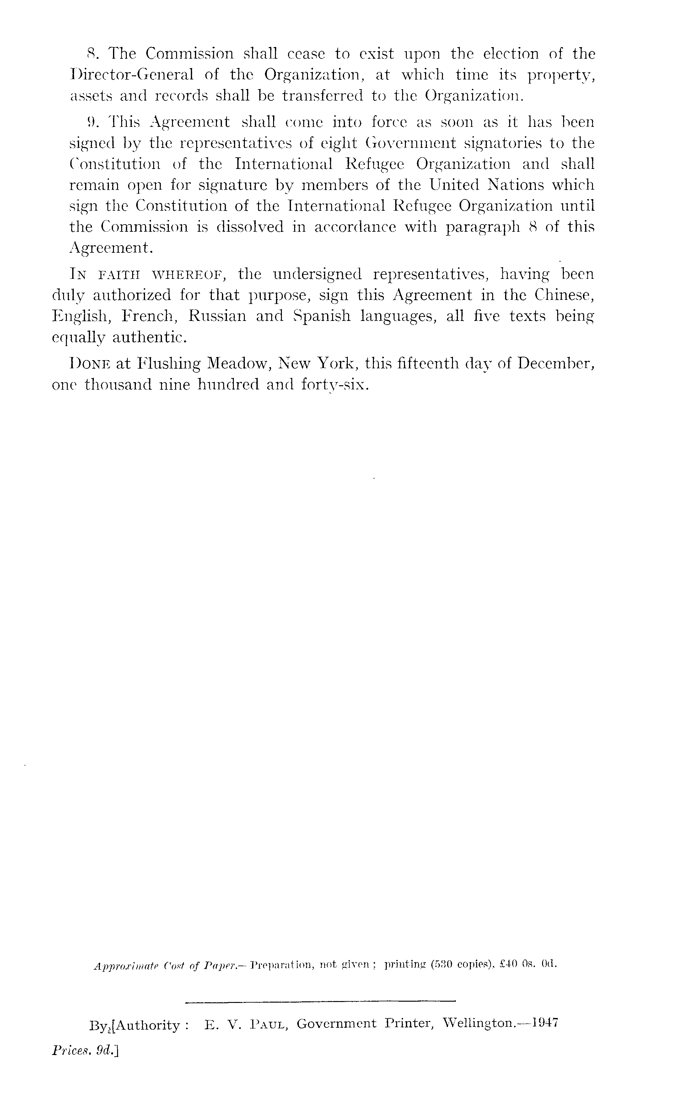 8. The Commission shall cease to exist upon the election of the Director-General of the Organization, at which time its property, assets and records shall be transferred to the Organization. 9. This Agreement shall come into force as soon as it has been signed by the representatives of eight Government signatories to the Constitution of the International Refugee Organization and shall remain open for signature by members of the United Nations which sign the Constitution of the International Refugee Organization until the Commission is dissolved in accordance with paragraph 8 of this Agreement. In faith whereof, the undersigned representatives, having been duly authorized for that purpose, sign this Agreement in the Chinese, English, French, Russian and Spanish languages, all five texts being equally authentic. Done at Flushing Meadow, New York, this fifteenth day of December, one thousand nine hundred and forty-six.