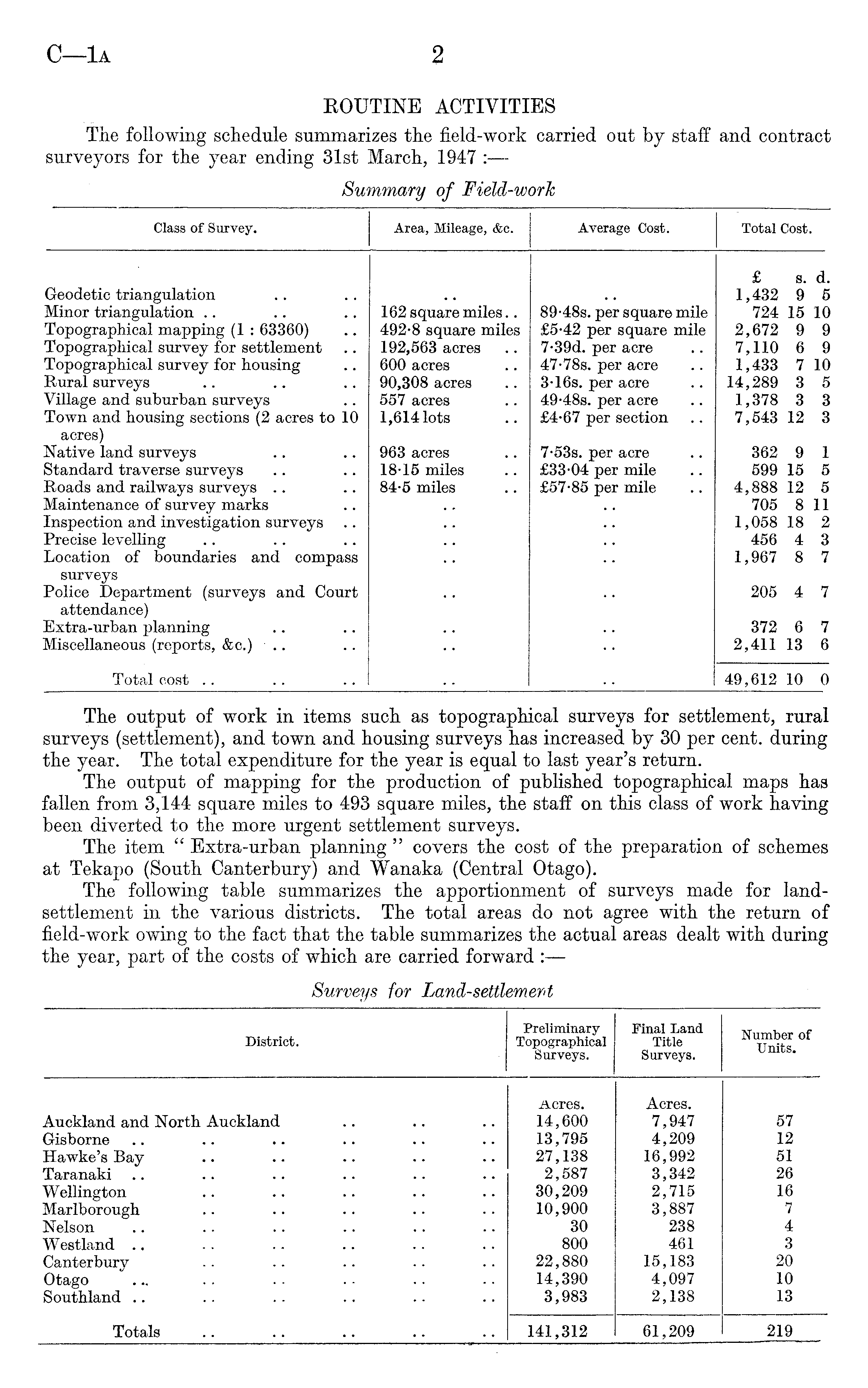 The output of work in items such as topographical surveys for settlement, rural surveys (settlement), and town and housing surveys has increased by 30 per cent, during the year. The total expenditure for the year is equal to last year's return. The output of mapping for the production of published topographical maps has fallen from 3,144 square miles to 493 square miles, the staff on this class of work having been diverted to the more urgent settlement surveys. The item " Extra-urban planning " covers the cost of the preparation of schemes at Tekapo (South Canterbury) and Wanaka (Central Otago). The following table summarizes the apportionment of surveys made for landsettlement in the various districts. The total areas do not agree with the return of field-work owing to the fact that the table summarizes the actual areas dealt with during the year, part of the costs of which are carried forward :