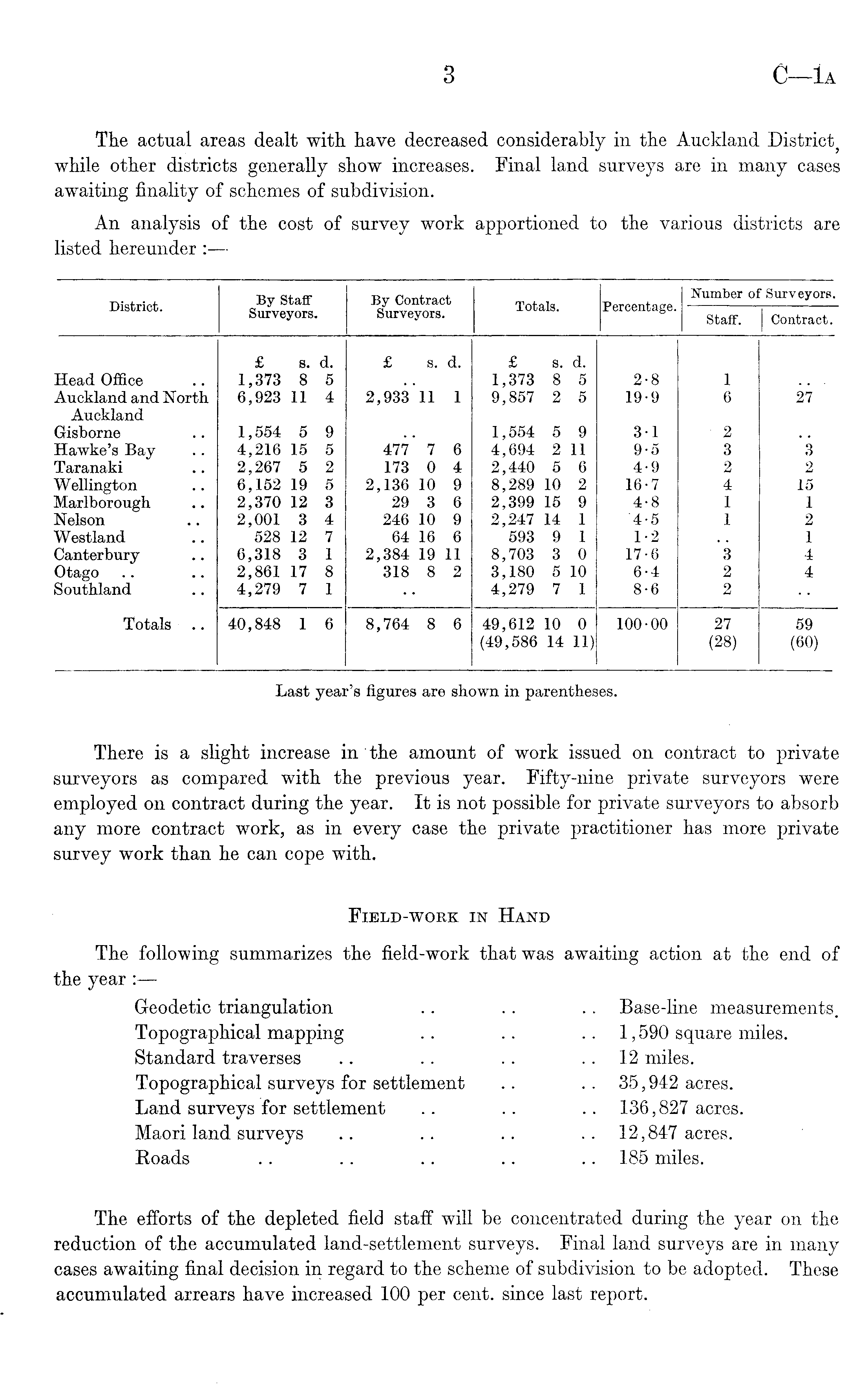 District. By Staff Surveyors. By Contract Surveyors. Totals. Percentage. Number of Surveyors. Staff. [ Contract. £ s. d. £ s. d. £ s. d. Head Office 1,373 8 5 1,373 8 5 2-8 1 Auckland and North 6,923 11 4 2,933 11 1 9,857 2 5 19-9 6 27 Auckland Gisborne 1,554 5 9 1,554 5 9 31 • 2 Hawke's Bay 4,216 15 5 477 7 6 4,694 2 11 9-5 3 3 Taranaki 2,267 5 2 173 0 4 2,440 5 6 4-9 2 2 Wellington 6,152 19 5 2,136 10 9 8,289 10 2 16-7 4 15 Marlborough 2,370 12 3 29 3 6 2,399 15 9 4-8 1 1 Nelson 2,001 3 4 246 10 9 2,247 14 1 "4-5 1 2 Westland 528 12 7 64 16 6 593 9 1 1-2 1 Canterbury 6,318 3 1 2,384 19 11 8,703 3 0 17-6 3 4 Otago 2,861 17 8 318 8 2 3,180 5 10 6-4 2 4 Southland 4,279 7 1 4,279 7 1 8-6 2 Totals 40,848 1 6 8,764 8 6 49,612 10 0 (49,586 14 11) 100-00 27 (28) 59 (60)