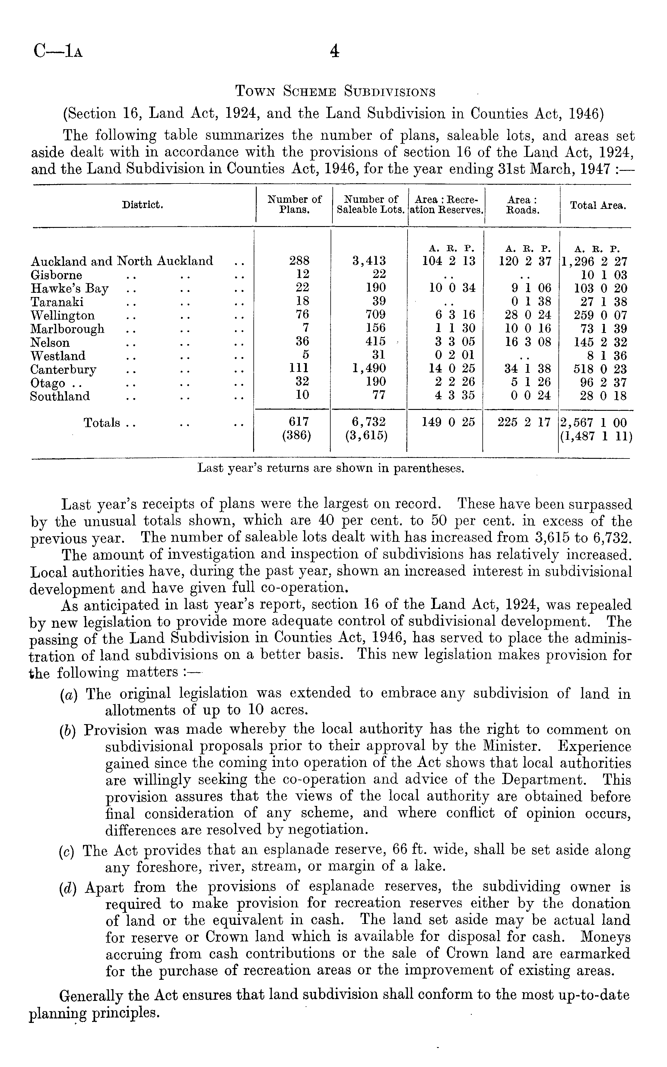 Last year's returns are shown in parentheses. Last year's receipts of plans were the largest on record. These have been surpassed by the unusual totals shown, which are 40 per cent, to 50 per cent, in excess of the previous year. The number of saleable lots dealt with has increased from 3,615 to 6,732. The amount of investigation and inspection of subdivisions has relatively increased. Local authorities have, during the past year, shown an increased interest in subdivisional development and have given full co-operation. As anticipated in last year's report, section 16 of the Land Act, 1924, was repealed by new legislation to provide more adequate control of subdivisional development. The passing of the Land Subdivision in Counties Act, 1946, has served to place the administration of land subdivisions on a better basis. This new legislation makes provision for the following matters - (a) The original legislation was extended to embrace any subdivision of land in allotments of up to 10 acres. (b) Provision was made whereby the local authority has the right to comment on subdivisional proposals prior to their approval by the Minister. Experience gained since the coming into operation of the Act shows that local authorities are willingly seeking the co-operation and advice of the Department. This provision assures that the views of the local authority are obtained before final consideration of any scheme, and where conflict of opinion occurs, differences are resolved by negotiation. (c) The Act provides that an esplanade reserve, 66 ft. wide, shall be set aside along any foreshore, river, stream, or margin of a lake. (d) Apart from the provisions of esplanade reserves, the subdividing owner is required to make provision for recreation reserves either by the donation of land or the equivalent in cash. The land set aside may be actual land for reserve or Crown land which is available for disposal for cash. Moneys accruing from cash contributions or the sale of Crown land are earmarked for the purchase of recreation areas or the improvement of existing areas. Generally the Act ensures that land subdivision shall conform to the most up-to-date planning principles.
