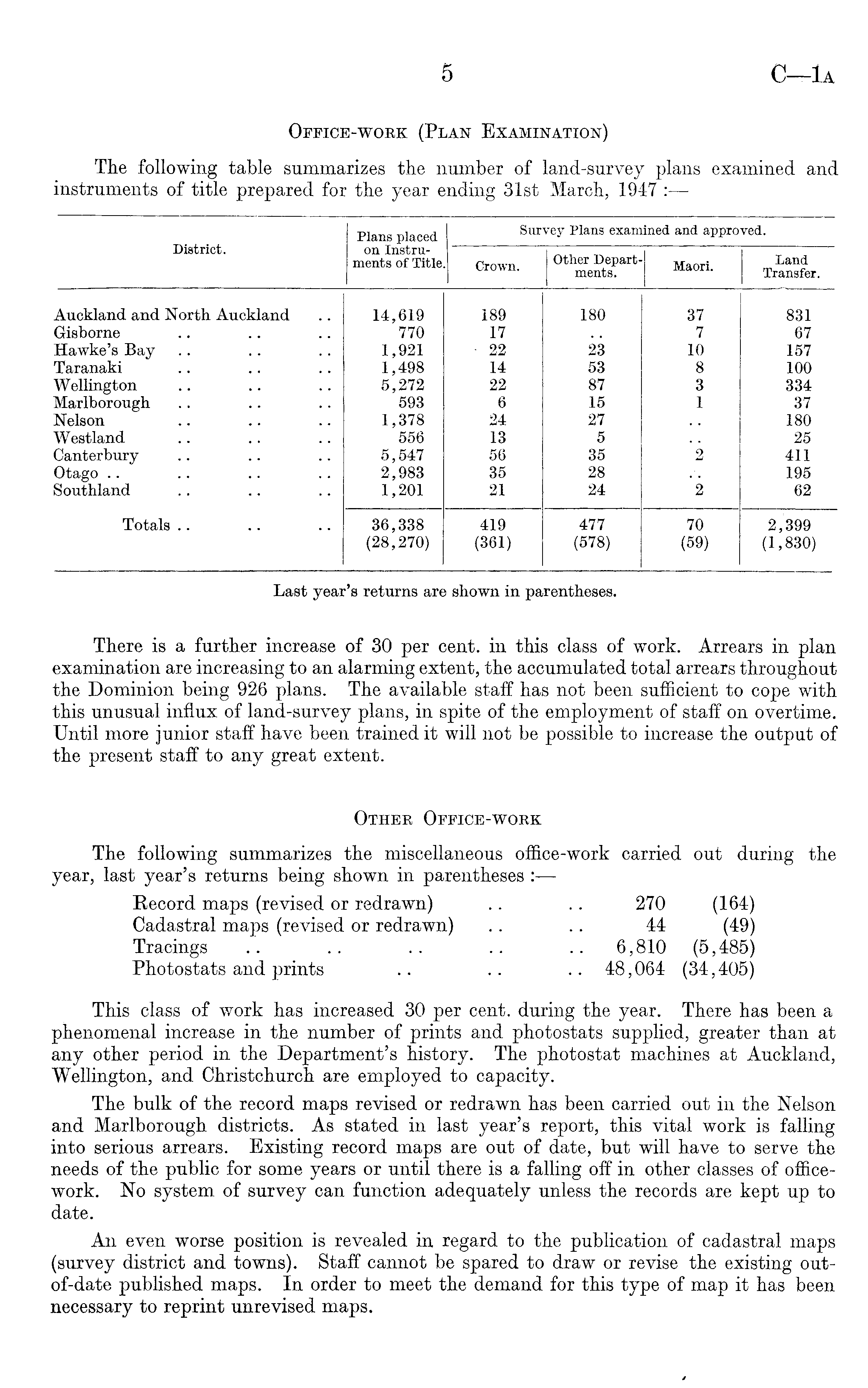 Office-work (Plan Examination) The following table summarizes the number of land-survey plans examined and instruments of title prepared for the year ending 31st March, 1947 :
