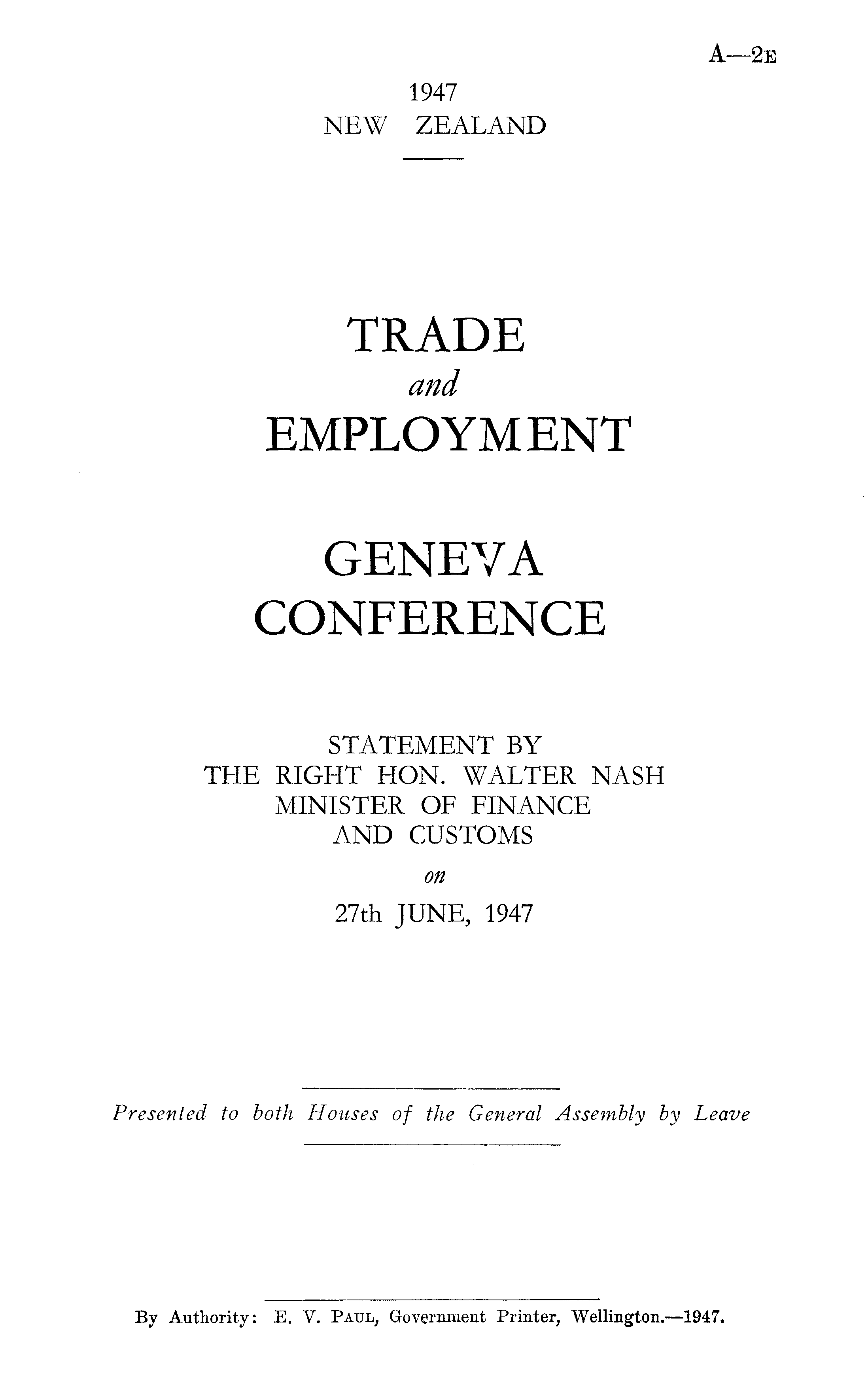 TRADE and EMPLOYMENT GENEVA CONFERENCE STATEMENT BY THE RIGHT HON. WALTER NASH MINISTER OF FINANCE AND CUSTOMS on 27th JUNE, 1947