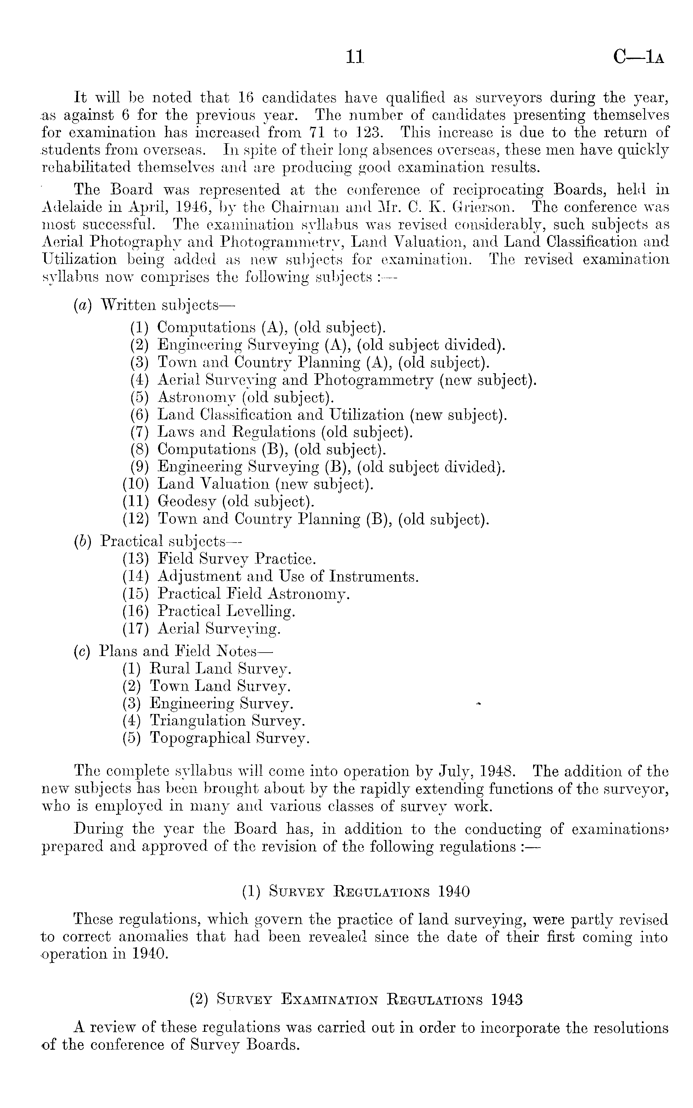 It will be noted that 16 candidates have qualified as surveyors during the year, as against 6 for the previous year. The number of candidates presenting themselves for examination has increased from 71 to -123. This increase is due to the return of students from overseas. In spite of their long absences overseas, these men have quickly rehabilitated themselves and are producing good examination results. The Board was represented at the conference of reciprocating Boards, held in Adelaide in April, 1946, by the Chairman and Mr. C. K. Grierson. The conference was most successful. The examination syllabus was revised considerably, such subjects as Aerial Photography and Photogrammetry, Land Valuation, and Land Classification and Utilization being added as new subjects for examination. The revised examination syllabus now comprises the following subjects : (a) Written subjects—(l) Computations (A), (old subject). (2) Engineering Surveying (A), (old subject divided). (3) Town and Country Planning (A), (old subject). (4) Aerial Surveying and Photogrammetry (new subject). (5) Astronomy (old subject). (6) Land Classification and Utilization (new subject). (7) Laws and Regulations (old subject). (8) Computations (B), (old subject). (9) Engineering Surveying (B), (old subject divided). (10) Land Valuation (new subject). (11) Geodesy (old subject). (12) Town and Country Planning (B), (old subject). (b) Practical subjects—(l3) Eield Survey Practice. (14) Adjustment and Use of Instruments. (15) Practical Field Astronomy. (16) Practical Levelling. (17) Aerial Surveying. (c) Plans and Field Notes — (1) Rural Land Survey. (2) Town Land Survey. (3) Engineering Survey. (4) Triangulation Survey. (5) Topographical Survey. The complete syllabus will come into operation by July, 1948. The addition of the new subjects has been brought about by the rapidly extending functions of the surveyor, who is employed in many and various classes of survey work. During the year the Board has, in addition to the conducting of examinations' prepared and approved of the revision of the following regulations : (1) Survey Regulations 1940 These regulations, which govern the practice of land surveying, were partly revised to correct anomalies that had been revealed since the date of their first coming into operation in 1940. (2) Survey Examination Regulations 1943 A review of these regulations was carried out in order to incorporate the resolutions of the conference of Survey Boards.