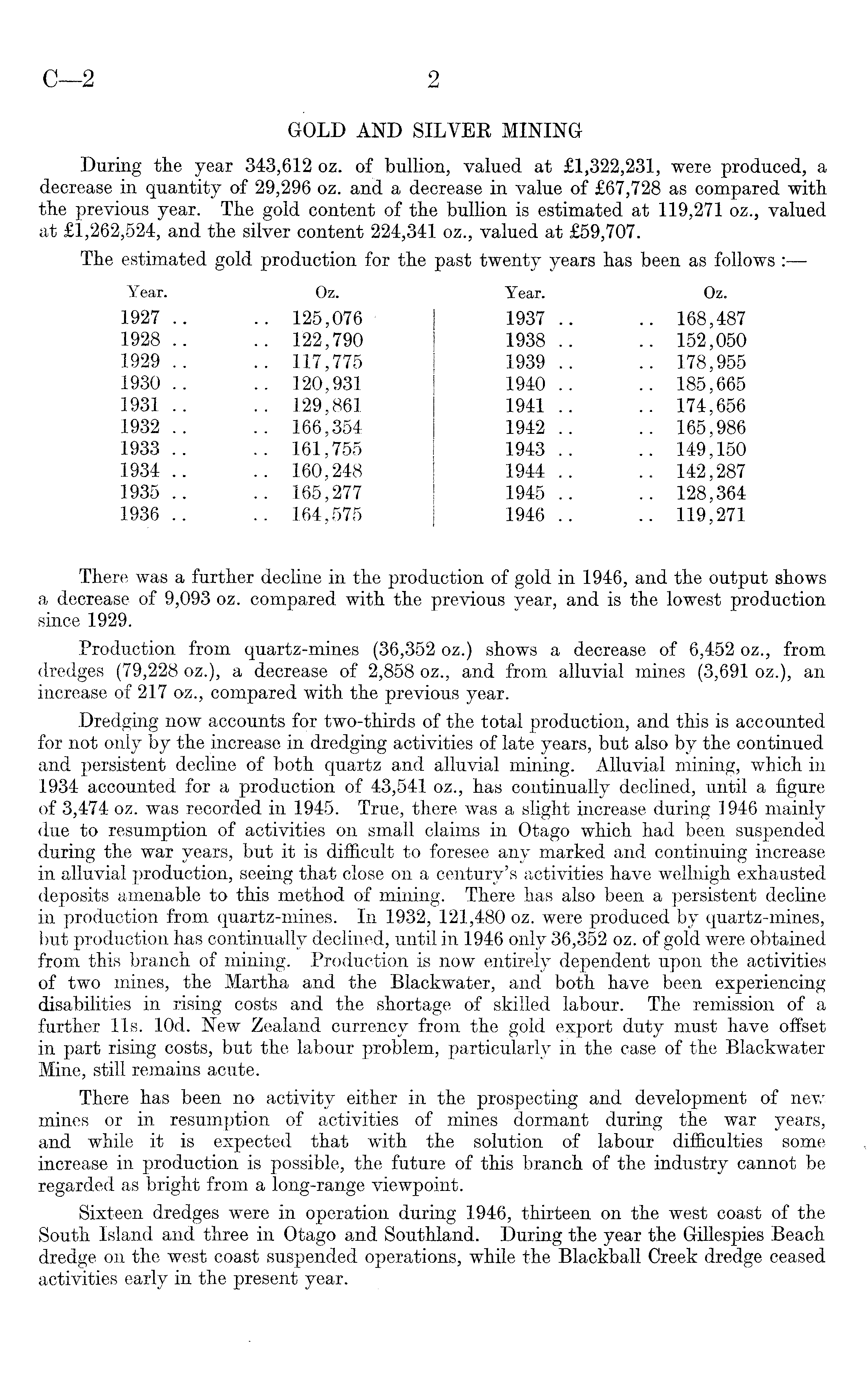 GOLD AND SILVER MINING During the year 343,612 oz. of bullion, valued at £1,322,231, were produced, a decrease in quantity of 29,296 oz. and a decrease in value of £67,728 as compared with the previous year. The gold content of the bullion is estimated at 119,271 oz., valued at £1,262,524, and the silver content 224,341 oz., valued at £59,707. The estimated gold production for the past twenty years has been as follows : Year. Oz. Year. Oz. 1927 .. .. 125,076 1937 .. .. 168,487 1928 .. .. 122,790 1938 .. .. 152,050 1929 .. .. 117,775 1939 .. .. 178,955 1930 .. .. 120,931 1940 .. .. 185,665 1931 .. .. 129,861 1941 .. .. 174,656 1932 .. .. 166,354 1942 .. .. 165,986 1933 .. .. 161,755 1943 .. .. 149,150 1934 .. .. 160,248 1944 .. .. 142,287 1935 .. .. 165,277 1945 .. .. 128,364 1936 .. .. 164,575 1946 .. .. 119,271 There was a further decline in the production of gold in 1946, and the output shows a decrease of 9,093 oz. compared with the previous year, and is the lowest production since 1929. Production from quartz-mines (36,352 oz.) shows a decrease of 6,452 oz., from dredges (79,228 oz.), a decrease of 2,858 oz., and from alluvial mines (3,691 oz.), an increase of 217 oz., compared with the previous year. Dredging now accounts for two-thirds of the total production, and this is accounted for not only by the increase in dredging activities of late years, but also by the continued and persistent decline of both quartz and alluvial mining. Alluvial mining, which in 1934 accounted for a production of 43,541 oz., has continually declined, until a figure of 3,474 oz. was recorded in 1945. True, there was a slight increase during 1946 mainly due to resumption of activities on small claims in Otago which had been suspended during the war years, but it is difficult to foresee any marked and continuing increase in alluvial production, seeing that close on a century's activities have wellnigh exhausted deposits amenable to this method of mining. There has also been a persistent decline in production from quartz-mines. In 1932, 121,480 oz. were produced by quartz-mines, but production has continually declined, until in 1946 only 36,352 oz. of gold were obtained from this branch of mining. Production is now entirely dependent upon the activities of two mines, the Martha and the Blackwater, and both have been experiencing disabilities in rising costs and the shortage of skilled labour. The remission of a further lis. lOd. New Zealand currency from the gold export duty must have offset in part rising costs, but the labour problem, particularly in the case of the Blackwater Mine, still remains acute. There has been no activity either in the prospecting and development of new mines or in resumption of activities of mines dormant during the war years, and while it is expected that with the solution of labour difficulties some increase in production is possible, the future of this branch of the industry cannot be regarded as bright from a long-range viewpoint. Sixteen dredges were in operation during 1946, thirteen on the west coast of the South Island and three in Otago and Southland. During the year the Gillespies Beach dredge on the west coast suspended operations, while the Blackball Creek dredge ceased activities early in the present year.
