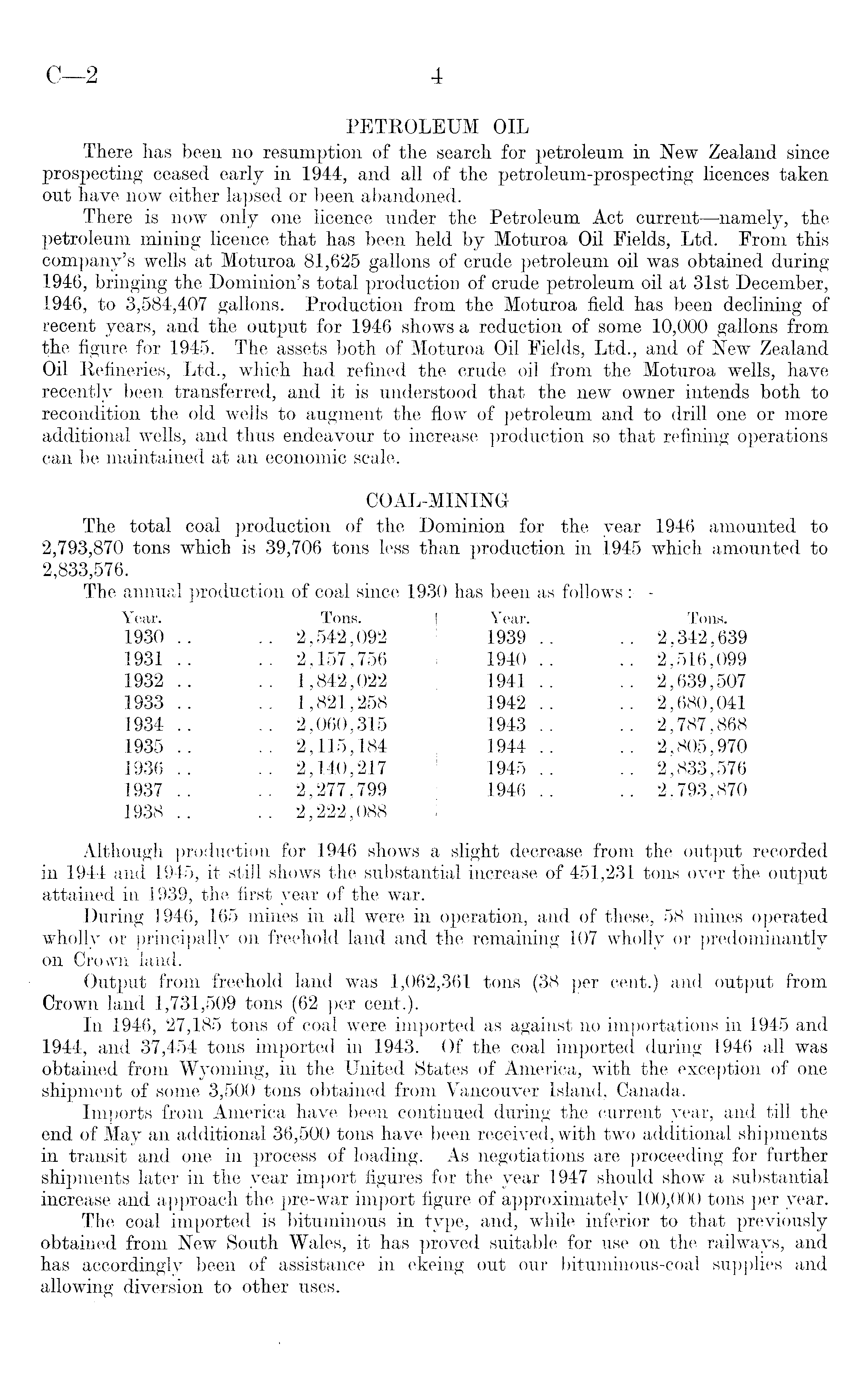PETROLEUM OIL There has been no resumption of the search for petroleum in New Zealand since prospecting ceased early in 1944, and all of the petroleum-prospecting licences taken out have now either lapsed or been abandoned. There is now only one licence under the Petroleum Act current —-namely, the petroleum mining licence that-has been held by Moturoa Oil Fields, Ltd. From this company's wells at Moturoa 81,625 gallons of crude petroleum oil was obtained during 1946, bringing the Dominion's total production of crude petroleum oil at 31st December, 1946, to 3,584,407 gallons. Production from the Moturoa field has been declining of recent years, and the output for 1946 shows a reduction of some 10,000 gallons from the figure for 1945. The assets both of Moturoa Oil Fields, Ltd., and of New Zealand Oil Refineries, Ltd., which had refined the crude oil from the Moturoa wells, have recently been transferred, and it is understood that the new owner intends both to recondition the old wells to augment the flow of petroleum and to drill one or more additional wells, and thus endeavour to increase production so that refining operations can be maintained at an economic scale. COAL-MINING The total coal production of the Dominion for the year 1946 amounted to 2,793,870 tons which is 39,706 tons less than production in 1945 which amounted to 2,833,576. The annual production of coal since 1930 has been as follows : Year. Tons. I Year. Tons. 1930 .. .. 2,542,092 S 1939 .. .. 2,342,639 1931 .. .. 2,157,756 i 1940 .. .. 2,516,099 1932 .. .. 1,842,022 1941 .. .. 2,639,507 1933 .. .. 1,821,258 | 1942 .. .. 2,680,041 1934 .. .. 2,060,315 1 1943 .. .. 2,787,868 1935.. .. 2,115,184 1944.. .. 2,805,970 1936 .. .. 2,140,217 ! 1945 .. .. 2,833,576 .1937 .. .. 2,277,799 1 1946 .. .. 2,793,870 1938 .. .. 2,222,088 I Although production for 1946 shows a slight decrease from the output recorded in 1944 and 1945, it still shows the substantial increase of 451,231 tons over the output attained in 1939, the first year of the war. During 1946, 165 mines in all were in operation, and of these, 58 mines operated wholly or principally on freehold land and the remaining 107 wholly or predominantly on Crown land. Output from freehold land was 1,062,361 tons (38 per cent.) and output from Crown land 1,731,509 tons (62 per cent.). In 1946, 27,185 tons of coal were imported as against no importations in 1945 and 1944, and 37,454 tons imported in 1943. Of the coal imported during 1946 all was obtained from Wyoming, in the United States of America, with the exception of one shipment of some 3,500 tons obtained from Vancouver Island, Canada. Imports from America have been continued during the current year, and till the end of May an additional 36,500 tons have been received, with two additional shipments in transit and one in process of loading. As negotiations are proceeding for further shipments later in the year import figures for the year 1947 should show a substantial increase and approach the pre-war import figure of approximately 100,000 tons per year. The coal imported is bituminous in type, and, while inferior to that previously obtained from New South Wales, it has proved suitable for use on the railways, and has accordingly been of assistance in ekeing out our bituminous-coal supplies and allowing diversion to other uses.