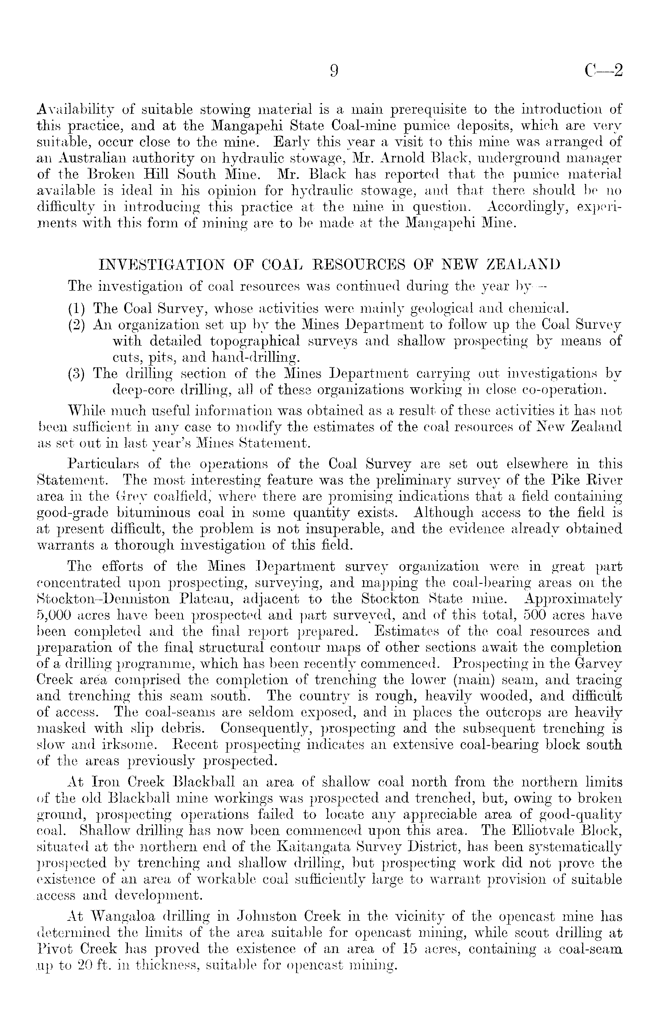 Availability of suitable stowing material is a main prerequisite to the introduction of this practice, and at the Mangapehi State Coal-mine pumice deposits, which are very suitable, occur close to the mine. Early this year a visit to this mine was arranged of an Australian authority on hydraulic stowage, Mr. Arnold Black, underground manager of the Broken Hill South Mine. Mr. Black has reported that the pumice material available is ideal in his opinion for hydraulic stowage, and that there should be no difficulty in introducing this practice at the mine in question. Accordingly, experiments with this form of mining are to be made at the Mangapehi Mine. INVESTIGATION OF COAL RESOURCES OF NEW ZEALAND The investigation of coal resources was continued during the year by—(1) The Coal Survey, whose activities were mainly geological and chemical. (2) An organization set up by the Mines Department to follow up the Coal Survey with detailed topographical surveys and shallow prospecting by means of cuts, pits, and hand-drilling. (3) The drilling section of the Mines Department carrying out investigations by deep-core drilling, all of these organizations working in close co-operation. While much useful information was obtained as a result of these activities it has not Tbeen sufficient in any case to modify the estimates of the coal resources of New Zealand as set out in last year's Mines Statement. Particulars of the operations of the Coal Survey are set out elsewhere in this Statement. The most interesting feature was the preliminary survey of the Pike River area in the Grey coalfield," where there are promising indications that a field containing good-grade bituminous coal in some quantity exists. Although access to the field is at present difficult, the problem is not insuperable, and the evidence already obtained warrants a thorough investigation of this field. The efforts of the Mines Department survey organization were in great part -concentrated upon prospecting, surveying, and mapping the coal-bearing areas on the Stockton-Denniston Plateau, adjacent to the Stockton State mine. Approximately 5,000 acres have been prospected and part surveyed, and of this total, 500 acres have been completed and the final report prepared. Estimates of the coal resources and preparation of the final structural contour maps of other sections await the completion of a drilling programme, which has been recently commenced. Prospecting in the Garvey Creek area comprised the completion of trenching the lower (main) seam, and tracing and trenching this seam south. The country is rough, heavily wooded, and difficult of access. The coal-seams are seldom exposed, and in places the outcrops are heavily masked with slip debris. Consequently, prospecting and the subsequent trenching is slow and irksome. Recent prospecting indicates an extensive coal-bearing block south of the areas previously prospected. At Iron Creek Blackball an area of shallow coal north from the northern limits of the old Blackball mine workings was prospected and trenched, but, owing to broken ground, prospecting operations failed to locate any appreciable area of good-quality coal. Shallow drilling has now been commenced upon this area. The Elliotvale Block, situated at the northern end of the Kaitangata Survey District, has been systematically prospected by trenching and shallow drilling, but prospecting work did not prove the existence of an area of workable coal sufficiently large to warrant provision of suitable .access and development. At Wangaloa drilling in Johnston Creek in the vicinity of the opencast mine has determined the limits of the area suitable for opencast mining, while scout drilling at Pivot Creek has proved the existence of an area of 15 acres, containing a coal-seam up to 20 ft. in thickness, suitable for opencast mining.