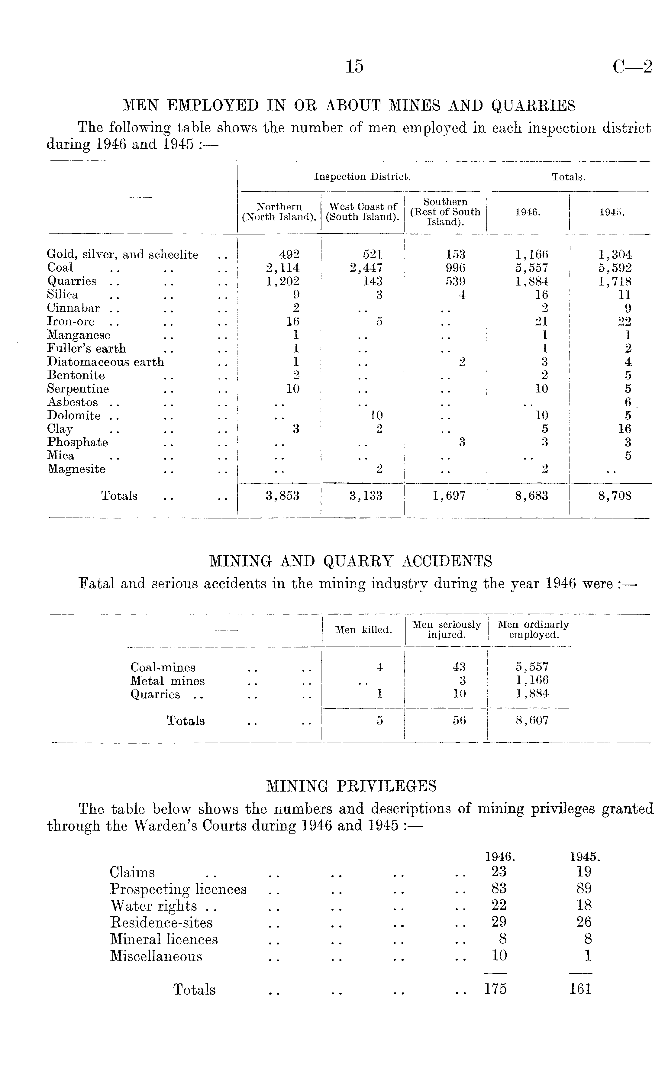 Inspection District. Totals. Northern (North Island). West Coast of (South Island). Southern (Rest of South Island). 1946. 1945. Gold, silver, and scheelite Coal Quarries Silica Cinnabar Iron-ore Manganese Fuller's earth Diatomaceous earth Bentonite Serpentine Asbestos Dolomite Clay Phosphate Mica Magnesite 492 2,114 1,202 9 2 16 1 1 1 2 10 3 521 2,447 143 3 5 10 2 2 153 996 539 4 2 3 1,166 5,557 1,884 16 2 21 1 1 3 2 10 10 5 3 2 1,304 5,592 1,718 11 9 22 1 2 4 5 5 6 . 5 16 3 5 Totals 3,853 3,133 1,697 8,683 8,708
