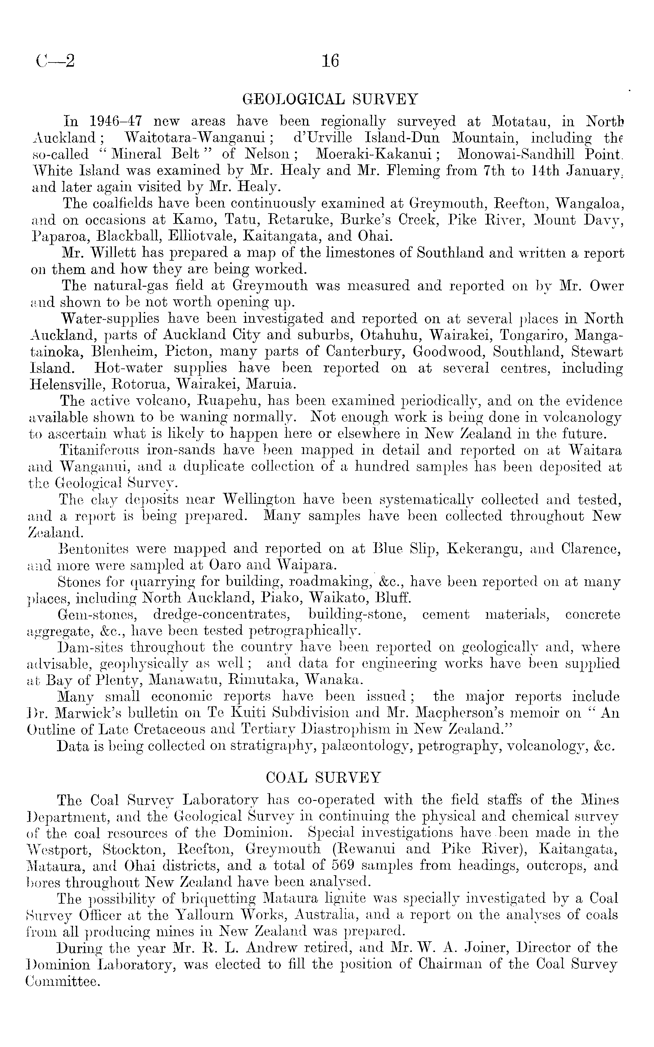 GEOLOGICAL SURVEY In 1946-47 new areas have been regionally surveyed at Motatau, in North Auckland; Waitotara-Wanganui; d'Urville Island-Dun Mountain, including the so-called " Mineral Belt "of Nelson ; Moeraki-Kakanui; Monowai-Sandhill Point. White Island was examined by Mr. Healy and Mr. Fleming from 7th to 14th January, and later again visited by Mr. Healy. The coalfields have been continuously examined at Greymouth, Reefton, Wangaloa, and on occasions at Kamo, Tatu, Retaruke, Burke's Creek, Pike River, Mount Davy, Paparoa, Blackball, Elliotvale, Kaitangata, and Ohai. Mr. Willett has prepared a map of the limestones of Southland and written a report on them and how they are being worked. The natural-gas field at Greymouth was measured and reported on by Mr. Ower and shown to be not worth opening up. Water-supplies have been investigated and reported on at several places in North Auckland, parts of Auckland City and suburbs, Otahuhu, Wairakei, Tongariro, Mangatainoka, Blenheim, Picton, many parts of Canterbury, Goodwood, Southland, Stewart Island. Hot-water supplies have been reported on at several centres, including Helensville, Rotorua ? Wairakei, Maruia. The active volcano, Ruapehu, has been examined periodically, and on the evidence available shown to be waning normally. Not enough work is being done in volcanology to ascertain what is likely to happen here or elsewhere in New Zealand in the future. Titaniferous iron-sands have been mapped in detail and reported on at Waitara and Wanganui, and a duplicate collection of a hundred samples has been deposited at the Geological Survey. The clay deposits near Wellington have been systematically collected and tested, and a report is being prepared. Many samples have been collected throughout New Zealand. Bentonites were mapped and reported on at Blue Slip, Kekerangu, and Clarence, and more were sampled at Oaro and Waipara. Stones for quarrying for building, roadmaking, &c., have been reported on at many places, including North Auckland, Piako, Waikato, Bluff. Gem-stones, dredge-concentrates, building-stone, cement materials, concrete aggregate, &c., have been tested petrographically. Dam-sites throughout the country have been reported on geologically and, where advisable, geophysically as well; and data for engineering works have been supplied at Bay of Plenty, Manawatu, Rimutaka, Wanaka. Many small economic reports have been issued; the major reports include Dr. Marwick's bulletin on Te Kuiti Subdivision and Mr. Macpherson's memoir on " An Outline of Late Cretaceous and Tertiary Diastrophism in New Zealand." Data is being collected on stratigraphy, palaeontology, petrography, volcanology, &c. COAL SURVEY The Coal Survey Laboratory has co-operated with the field staffs of the Mines Department, and the Geological Survey in continuing the physical and chemical survey of the coal resources of the Dominion. Special investigations have been made in the Westport, Stockton, Reefton, Greymouth (Rewanui and Pike River), Kaitangata, Mataura, and Ohai districts, and a total of 569 samples from headings, outcrops, and bores throughout New Zealand have been analysed. The possibility of briquetting Mataura lignite was specially investigated by a Coal Survey Officer at the Yallourn Works, Australia, and a report on the analyses of coals from all producing mines in New Zealand was prepared. During the year Mr. R. L. Andrew retired, and Mr. W. A. Joiner, Director of the Dominion Laboratory, was elected to fill the position of Chairman of the Coal Survey Committee.