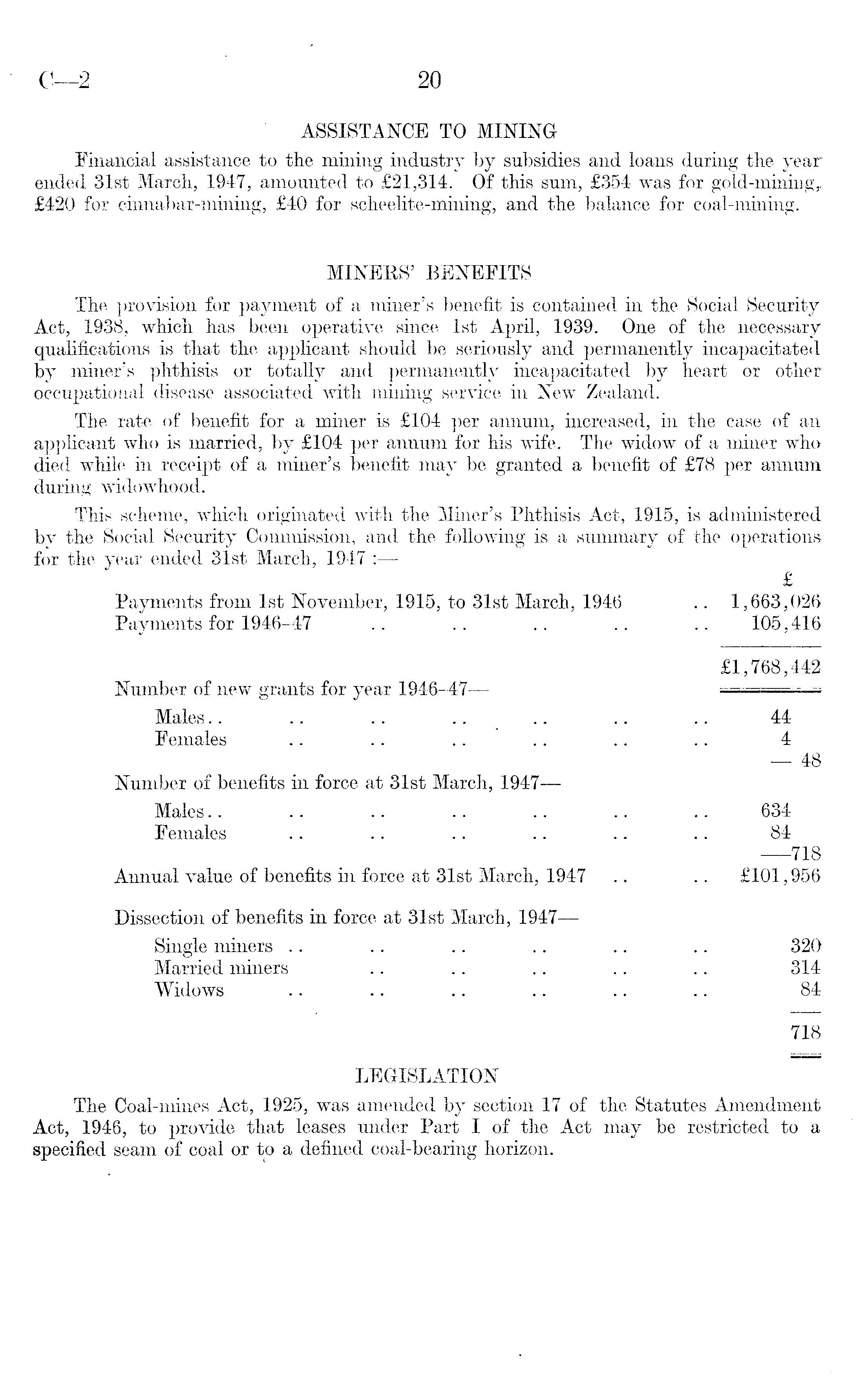 ASSISTANCE TO MINING Financial assistance to the mining industry by subsidies and loans during the year ended 31st March, 1947, amounted to £21,314. Of this sum, £3-54 was for gold-mining,. £420 for cinnabar-mining, £4O for scheelite-mining, and the balance for coal-mining. MINERS' BENEFITS The provision for payment of a miner's benefit is contained in the Social Security Act, 1938, which has been operative since Ist April, 1939. One of the necessary qualifications is that the applicant should be seriously and permanently incapacitated by miner's phthisis or totally and permanently incapacitated by heart or other occupational disease associated with mining service in New Zealand. The rate of benefit for a miner is £lO4 per annum, increased, in the case of an applicant who is married, by £lO4 per annum for his wife. The widow of a miner who died while in receipt of a miner's benefit may be granted a benefit of £7B per annum during widowhood. This scheme, which originated with the Miner's Phthisis Act, 1915, is administered by the Social Security Commission, and the following is a summary of the operations for the year ended 31st March, 1947 : £ Payments from Ist November, 1915, to 31st March, 1946 .. 1,663,026 Payments for 1946-47 .. .. .. .. .. 105,416 £1,768,442 Number of new grants for year 1946-47 ============== Males.. .. .. .... .. .. 44 Females .. .. .. .. ... .. 4 48 Number of benefits in force, at 31st March, 1947 Males.. .. .. .. .. .. .. 634 Females .. .. .. .. .. .. 84 7lB Annual value of benefits in force at 31st March, 1947 .. .. £101,956 Dissection of benefits in force at 31st March, 1947 Single miners .. .. .. .. .. .. 320 Married miners .. .. .. .. .. 314 Widows .. .. .. .. .. .. 84 718 LEGISLATION The Coal-mines Act, 1925, was amended by section 17 of the Statutes Amendment Act, 1946, to provide that leases under Part I of the Act may be restricted to a specified seam of coal or to a defined coal-bearing horizon.