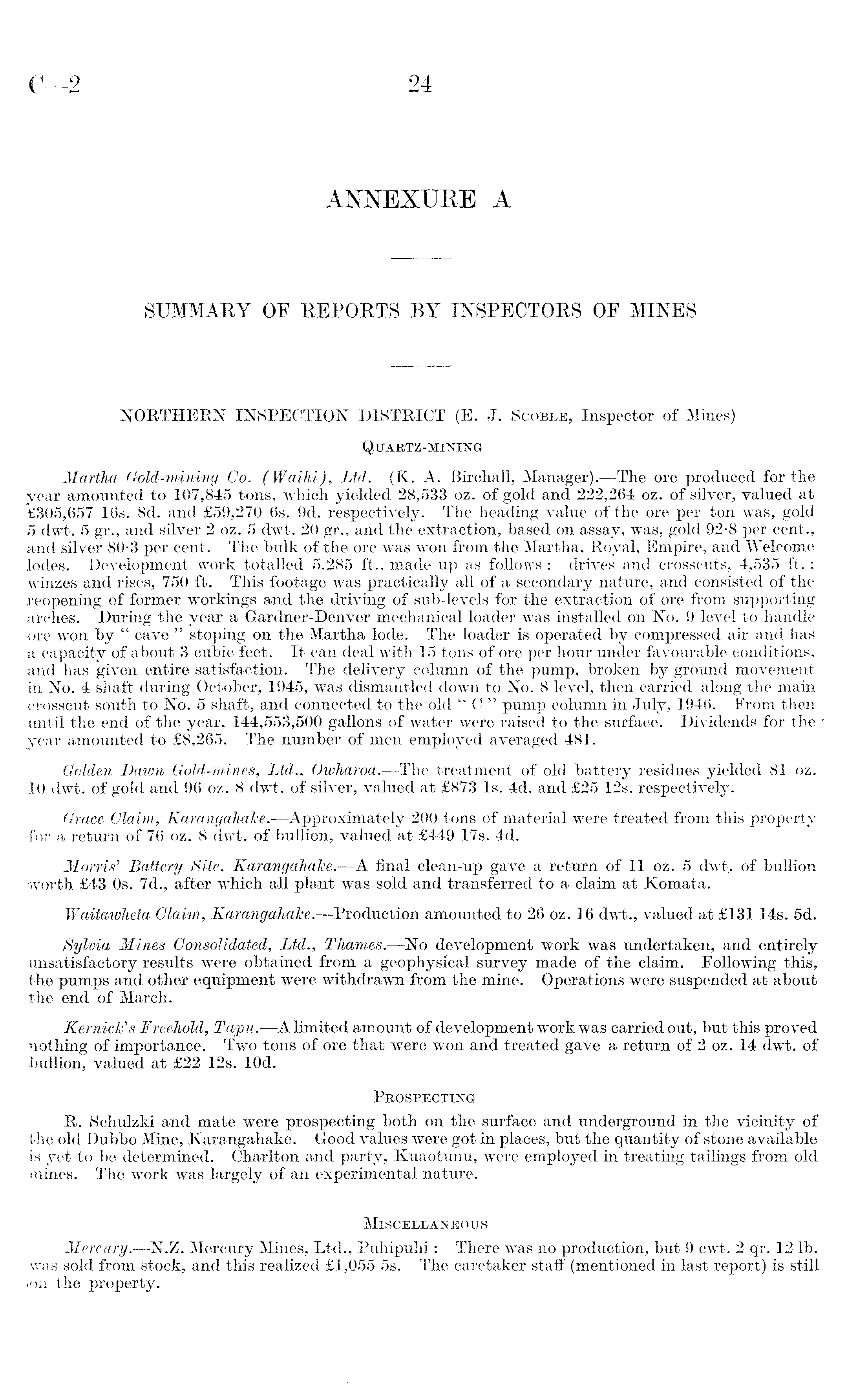 ANNEXURE A SUMMARY OF REPORTS BY INSPECTORS OF MINES NORTHERN INSPECTION DISTRICT (E. J. Scoble, Inspector of Mines) Quartz-mining Martha Gold-mining Co. (Waihi), Ltd. (K. A. Birchall, Manager).—The ore produced for the year amounted to 107,845 tons, which yielded 28,533 oz. of gold and 222,264 oz. of silver, valued at £305,657 16s. Bd. and £59,270 6s. 9d. respectively. The heading value of the ore per ton was, gold 5 dwt. 5 gr., and silver 2 oz. 5 dwt. 20 gr., and the extraction, based on assay, was, gold 92-8 per cent., and silver 80-3 per cent. The bulk of the ore was won from the Martha, Royal, Empire, and Welcome lodes. Development work totalled 5,285 ft., made up as follows : drives and crosscuts, 4,535 ft.; winzes and rises, 750 ft. This footage was practically all of a secondary nature, and consisted of the reopening of former workings and the driving of sub-levels for the extraction of ore from supporting arches. During the year a Gardner-Denver mechanical loader was installed on No. 9 level to handle ■ore won by " cave " stoping on the Martha lode. The loader is operated by compressed air and has a capacity of about 3 cubic feet. It can deal with 15 tons of ore per hour under favourable conditions, and has given entire satisfaction. The delivery column of the pump, broken by ground movement in No. 4 shaft during October, 1945, was dismantled down to No. 8 level, then carried along the main crosscut south to No. 5 shaft, and connected to the old "C " pump column in July, 1946. Erom then until the end of the year, 144,553,500 gallons of water were raised to the surface. Dividends for the year amounted to £8,265. The number of men employed averaged 481. Golden Dawn Gold-mines, Ltd., Owharoa.—The treatment of old battery residues yielded 81 oz. ,10 dwt. of gold and 96 oz. 8 dwt. of silver, valued at £873 Is. 4d. and £25 12s. respectively. Grace Claim, Karangahake.—Approximately 200 tons of material were treated from this property for a return of 76 oz. 8 dwt. of bullion, valued at £449 17s. 4d. Morris'' Battery Site, Karangahake.—A final clean-up gave a return of 11 oz. 5 dwt.. of bullion worth £43 os. 7d., after which all plant was sold and transferred to a claim at Komata. Waitawheta Claim, Karangahake.—Production amounted to 26 oz. 16 dwt., valued at £l3l 14s. sd. Sylvia Mines Consolidated, Ltd., Thames.—No development work was undertaken, and entirely unsatisfactory results were obtained from a geophysical survey made of the claim. Following this, the pumps and other equipment were withdrawn from the mine. Operations were suspended at about the end of March. KernicFs Freehold, Tapu.—A limited amount of development work was carried out, but this proved nothing of importance. Two tons of ore that were won and treated gave a return of 2 oz. 14 dwt. of .bullion, valued at £22 12s. lOd. Prospecting R. Schulzki and mate were prospecting both on the surface and underground in the vicinity of "the old Dubbo Mine, Karangahake. Good values were got in places, but the quantity of stone available is yet to be determined. Charlton and party, Kuaotunu, were employed in treating tailings from old mines. The work was largely of an experimental nature. Miscellaneous Mercury.—N.Z. Mercury Mines, Ltd., Puhipuhi: There was no production, but 9 cwt. 2 qr. 12 lb. was sold from stock, and this realized £1,055 ss. The caretaker staff (mentioned in last report) is still uon the property.