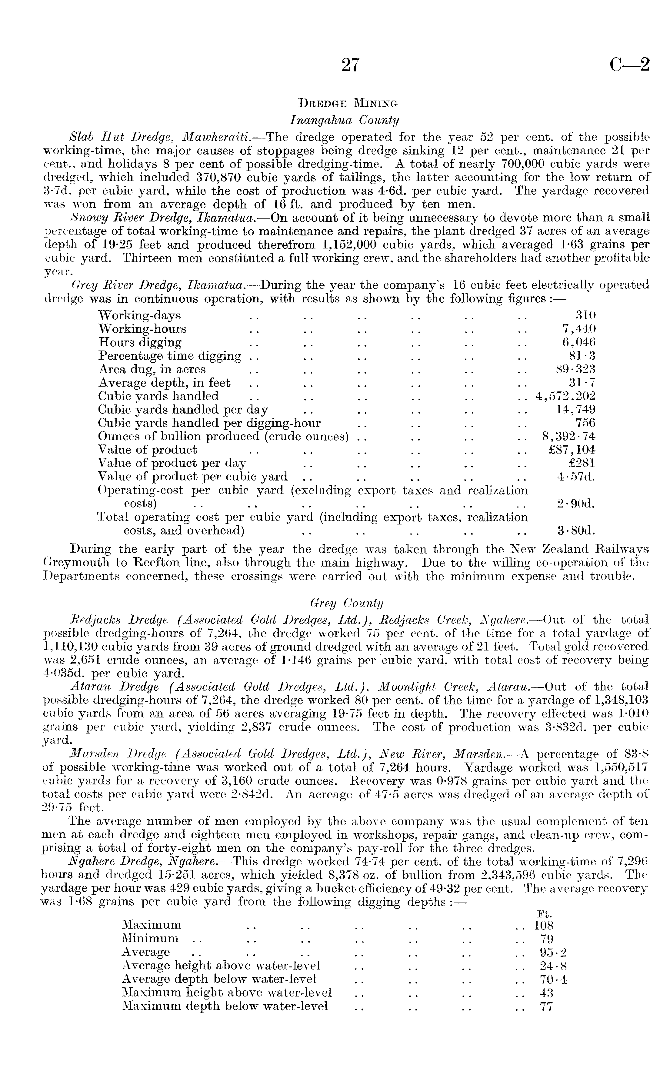 Dredge Mining Inangahua County Slab Hut Dredge, Mawheraiti. —The dredge operated for the year 52 per cent, of the possible working-time, the major causes of stoppages being dredge sinking 12 per cent., maintenance 21 per cent., and holidays 8 per cent of possible dredging-time. A total of nearly 700,000 cubic yards were dredged, which included 370,870 cubic yards of tailings, the latter accounting for the low return of 3-7 d. per cubic yard, while the cost of production was 4-6 d. per cubic yard. The yardage recovered was won from an average depth of 16 ft. and produced by ten men. Snowy River Dredge, Ilcamatua. —On account of it being unnecessary to devote more than a small percentage of total working-time to maintenance and repairs, the plant dredged 37 acres of an average depth of 19-25 feet and produced therefrom 1,152,000 cubic yards, which averaged 1-63 grains per cubic yard. Thirteen men constituted a full working crew, and the shareholders had another profitable year. Grey River Dredge, Ilcamatua. —During the year the company's 16 cubic feet electrically operated dredge was in continuous operation, with results as shown by the following figures:— Working-days .. .. .. .. .. .. 310 Working-hours .. .. .. .. .. .. 7,440 Hours digging .. .. .. .. .. .. 6,046 Percentage time digging .. .. .. .. .. .. 81-3 Area dug, in acres .. .. .. .. .. .. 89 • 323 Average depth, in feet .. .. .. .. .. .. 31-7 Cubic yards handled .. .. .. .. .. .. 4,572,202 Cubic yards handled per day .. .. .. .. .. 14,749 Cubic yards handled per digging-hour .. .. .. .. 756 Ounces of bullion produced (crude ounces) .. .. .. .. 8,392-74 Value of product .. .. .. .. .. .. £87,104 Value of product per day .. .. .. .. .. £2Bl Value of product per cubic yard .. .. .. .. .. 4-57 d. Operating-cost per cubic yard (excluding export taxes and realization costs) . . .. .. .. .. .. .. 2 • 90d. Total operating cost per cubic yard (including export taxes, realization costs, and overhead) .. .. .. .. .. 3 • 80d. During the early part of the year the dredge was taken through the New Zealand Railways Greymouth to Reefton line, also through the main highway. Due to the willing co-operation of the Departments concerned, these crossings were carried out with the minimum expense and trouble. Grey County RedjacJcs Dredge (Associated Gold Dredges, Ltd.), Redjacks Creek, Ngahere.—Out of the total possible dredging-hours of 7,264, the dredge worked 75 per cent, of the time for a total yardage of 1,110,130 cubic yards from 39 acres of ground dredged with an average of 21 feet. Total gold recovered was 2,651 crude ounces, an average of 1-146 grains per cubic yard, with total cost of recovery being 4-035 d. per cubic yard. Atarau Dredge (Associated Gold Dredges, Ltd.), Moonlight Creek, Atarau. —Out of the total possible dredging-hours of 7,264, the dredge worked 80 per cent, of the time for a yardage of 1,348,103 cubic yards from an area of 56 acres averaging 19-75 feet in depth. The recovery effected was 1-010 grains per cubic yard, yielding 2,837 crude ounces. The cost of production was 3-832 d. per cubic yard. Marsden Dredge (Associated Gold Dredges, Ltd.), New River, Marsden. —A percentage of 83-8 of possible working-time was worked out of a total of 7,264 hours. Yardage worked was 1,550,517 cubic yards for a recovery of 3,160 crude ounces. Recovery was 0-978 grains per cubic yard and the total costs per cubic yard were 2-842 d. An acreage of 47-5 acres was dredged of an average depth of 29-75 feet. The average number of men employed by the above company was the usual complement of ten men at each dredge and eighteen men employed in workshops, repair gangs, and clean-up crew, comprising a total of forty-eight men on the company's pay-roll for the three dredges. Ngahere Dredge, Ngahere.—This dredge worked 74-74 per cent, of the total working-time of 7,296 hours and dredged 15-251 acres, which yielded 8,378 oz. of bulhon from 2,343,596 cubic yards. The yardage per hour was 429 cubic yards, giving a bucket efficiency of 49-32 per cent. The average recovery was 1-68 grains per cubic yard from the following digging depths : Ft. Maximum .. .. .. .. .. .. 108 Minimum .. .. .. .. .. .. 79 Average .. .. .. .. .. .. .. 95 • 2 Average height above water-level .. .. .. ..24-8 Average depth below water-level .. .. .. ..70-4 Maximum height above water-level .. .. .. .. 43 Maximum depth below water-level .. .. .. 77