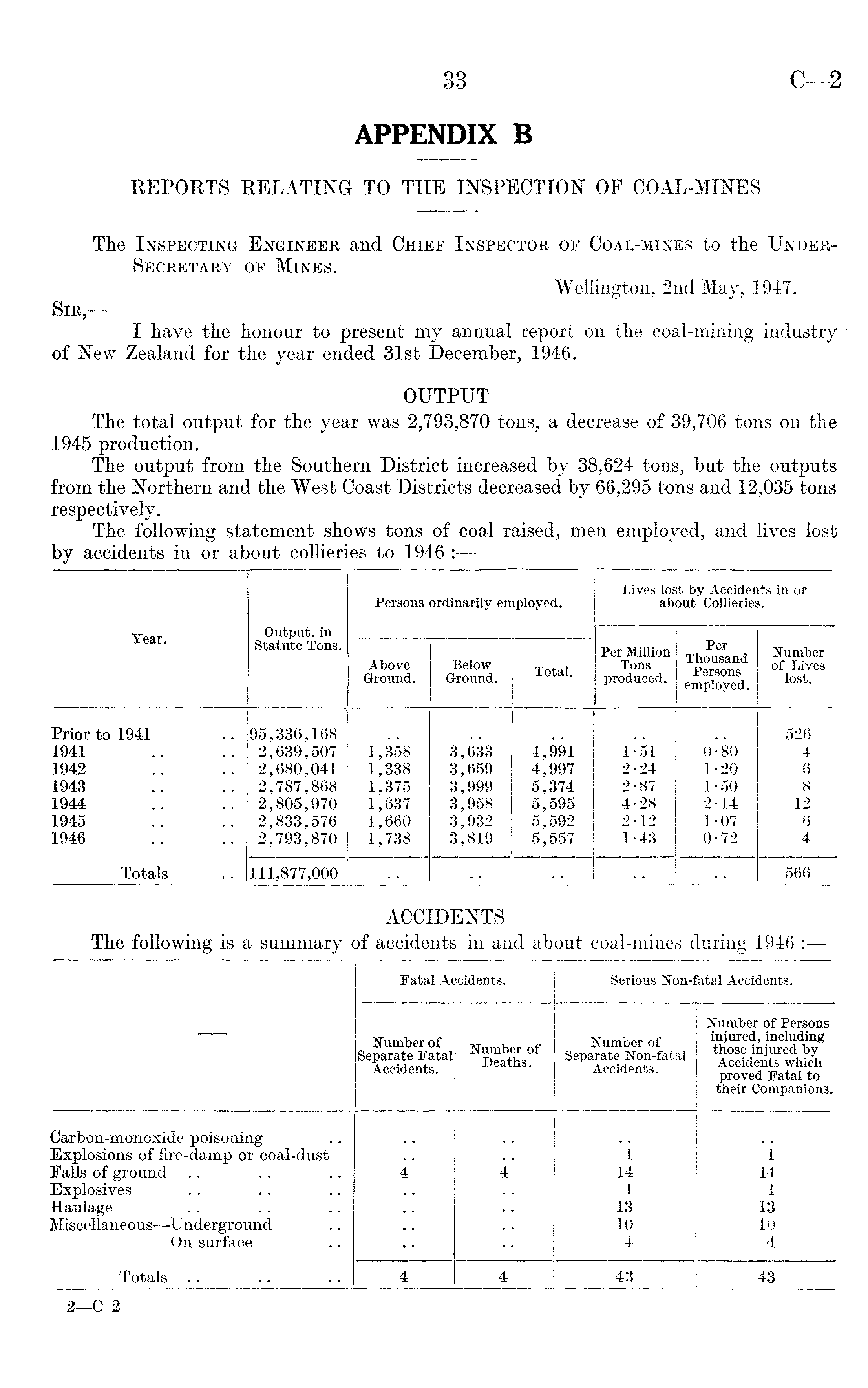 APPENDIX B REPORTS RELATING TO THE INSPECTION OF COAL-MINES The Inspecting Engineer and Chief Inspector of Coal-mines to the UnderSecretary of Mines. Wellington, 2nd May, 1947. -Sir, — I have the honour to present my annual report on the coal-mining industry of New Zealand for the year ended 31st December, 1946. OUTPUT The total output for the year was 2,793,870 tons, a decrease of 39,706 tons on the 1945 production. The output from the Southern District increased by 38,624 tons, but the outputs from the Northern and the West Coast Districts decreased by 66,295 tons and 12,035 tons respectively.