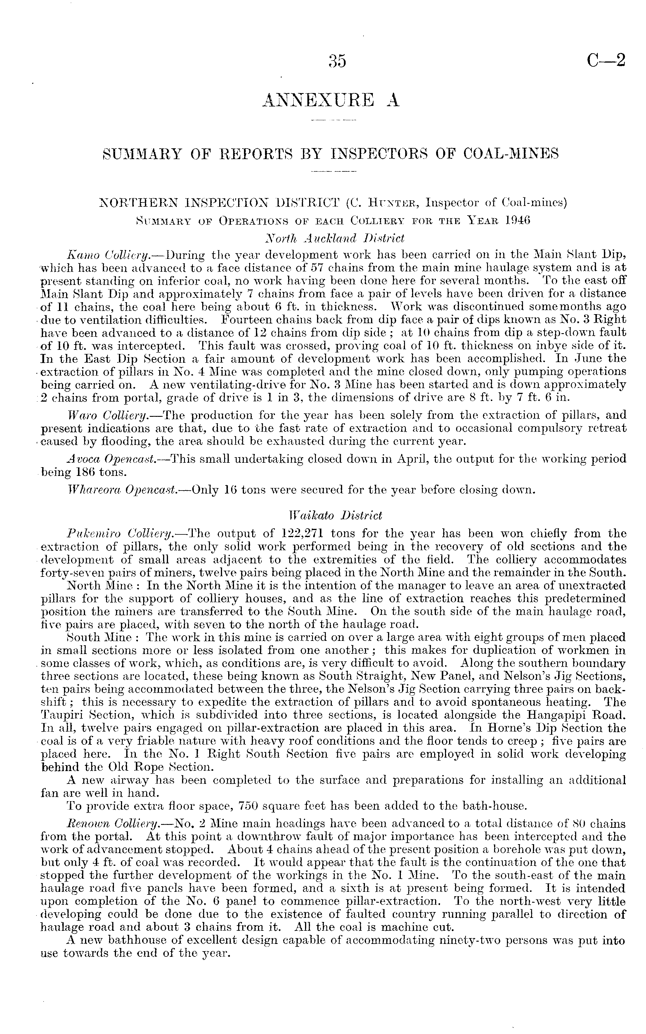 ANNEXURE A SUMMARY OF REPORTS BY INSPECTORS OF COAL-MINES NORTHERN INSPECTION DISTRICT (C. Hunter, Inspector of Coal-mines) Summary of Operations of each Colliery for the Year 1946 North Auckland District Kama Colliery.—During the year development work has been carried on in the Main Slant Dip, ■which has been advanced to a face distance of 57 chains from the main mine haulage system and is at present standing on inferior coal, no work having been done here for several months. To the east off Main Slant Dip and approximately 7 chains from face a pair of levels have been driven for a distance of II chains, the coal here being about 6 ft. in thickness. Work was discontinued some months ago ■ due to ventilation difficulties. Fourteen chains back from dip face a pair of dips known as No. 3 Right have been advanced to a distance of 12 chains from dip side ; at 10 chains from dip a step-down fault •of 10 ft. was intercepted. This fault was crossed, proving coal of 10 ft. thickness on inbye side of it. In the East Dip Section a fair amount of development work has been accomplished. In June the • extraction of pillars in No. 4 Mine was completed and the mine closed down, only pumping operations being carried on. A new ventilating-drive for No. 3 Mine has been started and is down approximately :2 chains from portal, grade of drive is 1 in 3, the dimensions of drive are 8 ft. by 7 ft. 6 in. Waro Colliery.—The production for the year has been solely from the extraction of pillars, and present indications are that, due to the fast rate of extraction and to occasional compulsory retreat • caused by flooding, the area should be exhausted during the current year. Avoca Opencast.—This small undertaking closed down in April, the output for the working period being 186 tons. Whareora Opencast.—Only 16 tons were secured for the year before closing down. Waikato District Pukemiro Colliery.—The output of 122,271 tons for the year has been won chiefly from the • extraction of pillars, the only solid work performed being in the recovery of old sections and the -development of small areas adjacent to the extremities of the field. The colliery accommodates forty-seven pairs of miners, twelve pairs being placed in the North Mine and the remainder in the South. North Mine : In the North Mine it is the intention of the manager to leave an area of unextracted pillars for the support of colliery houses, and as the line of extraction reaches this predetermined position the miners are transferred to the South Mine. On the south side of the main haulage road, five pairs are placed, with seven to the north of the haulage road. South Mine : The work in this mine is carried on over a large area with eight groups of men placed in small sections more or less isolated from one another; this makes for duplication of workmen in . some classes of work, which, as conditions are, is very difficult to avoid. Along the southern boundary three sections are located, these being known as South Straight, New Panel, and Nelson's Jig Sections, ten pairs being accommodated between the three, the Nelson's Jig Section carrying three pairs on back- , shift; this is necessary to expedite the extraction of pillars and to avoid spontaneous heating. The Taupiri Section, which is subdivided into three sections, is located alongside the Hangapipi Road. In all, twelve pairs engaged on pillar-extraction are placed in this area. In Home's Dip Section the • coal is of a very friable nature with heavy roof conditions and the floor tends to creep ; five pairs are placed here. In the No. 1 Right South Section five pairs are employed in solid work developing behind the Old Rope Section. A new airway has been completed to the surface and preparations for installing an additional fan are well in hand. To provide extra floor space, 750 square feet has been added to the bath-house. Renown Colliery.—No. 2 Mine main headings have been advanced to a total distance of 80 chains from the portal. At this point a downthrow fault of major importance has been intercepted and the work of advancement stopped. About 4 chains ahead of the present position a borehole was put down, but only 4 ft. of coal was recorded. It would appear that the fault is the continuation of the one that stopped the further development of the workings in the No. 1 Mine. To the south-east of the main haulage road five panels have been formed, and a sixth is at present being formed. It is intended upon completion of the No. 6 panel to commence pillar-extraction. To the north-west very little developing could be done due to the existence of faulted country running parallel to direction of haulage road and about 3 chains from it. All the coal is machine cut. A new bathhouse of excellent design capable of accommodating ninety-two persons was put into use towards the end of the year.