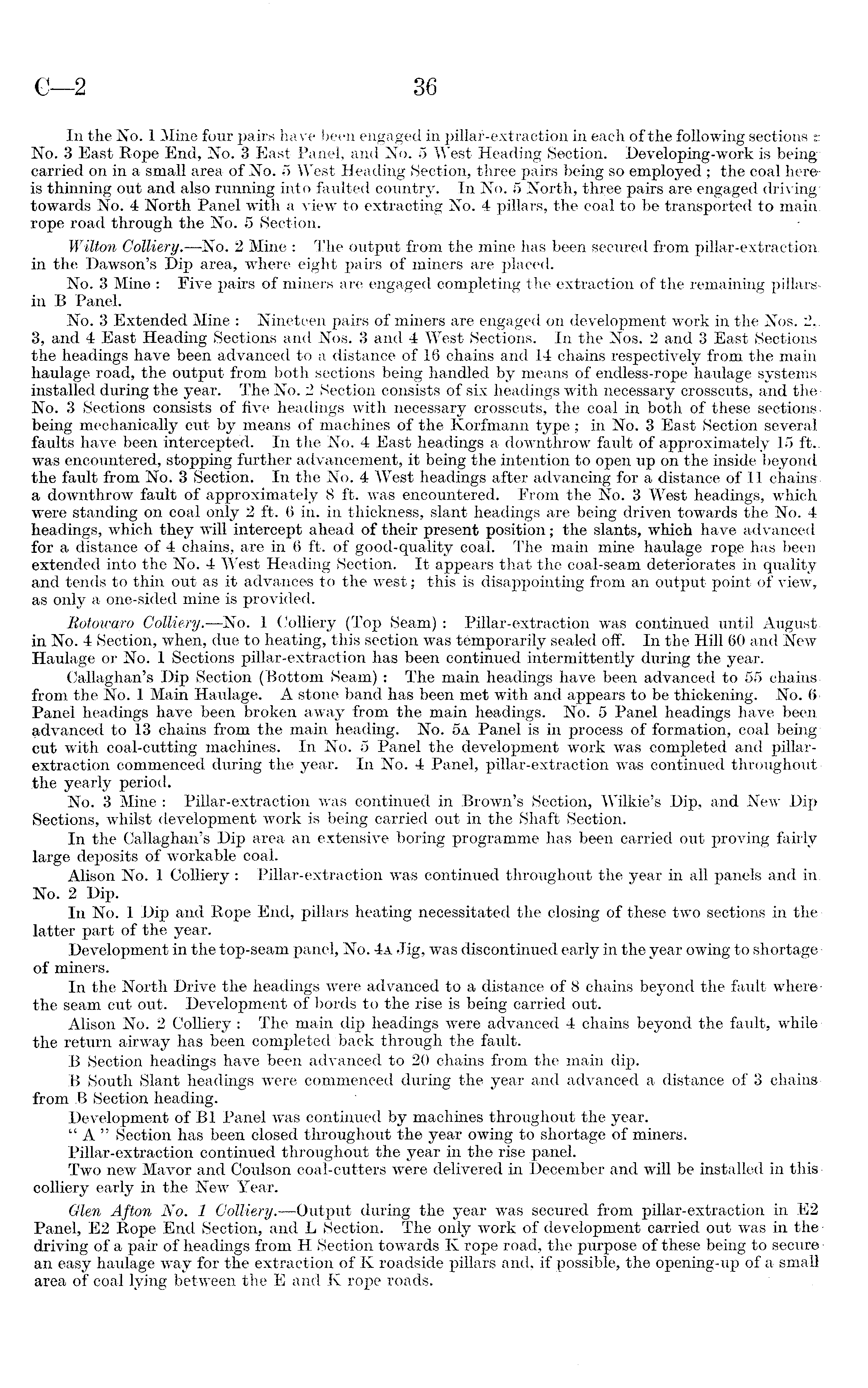 In the No. 1 Mine four pairs have been engaged in pillar-extraction in each of the following sections t No. 3 East Rope End, No. 3 East Panel, and No. 5 West Heading Section. Developing-work is beingcarried on in a small area of No. 5 West Heading Section, three pairs being so employed ; the coal hereis thinning out and also running into faulted country. In No. 5 North, three pairs are engaged driving' towards No. 4 North Panel with a view to extracting No. 4 pillars, the coal to be transported to main, rope road through the No. 5 Section. Wilton Colliery.—No. 2 Mine : The output from the mine has been secured from pillar-extraction, in the Dawson's Dip area, where eight pairs of miners are placed. No. 3 Mine : Five pairs of miners are engaged completing the extraction of the remaining pillarsin B Panel. No. 3 Extended Mine : Nineteen pairs of miners are engaged on development work in the Nos. 2,. 3, and 4 East Heading Sections and Nos. 3 and 4 West Sections. In the Nos. 2 and 3 East Sections the headings have been advanced to a distance of 16 chains and 14 chains respectively from the main haulage road, the output from both sections being handled by means of endless-rope haulage systemsinstalled during the year. The No. 2 Section consists of six headings with necessary crosscuts, and theNo. 3 Sections consists of five headings with necessary crosscuts, the coal in both of these sectionsbeing mechanically cut by means of machines of the Korfmann type ; in No. 3 East Section several faults have been intercepted. In the No. 4 East headings a downthrow fault of approximately 15 ft., was encountered, stopping further advancement, it being the intention to open up on the inside beyond the fault from No. 3 Section. In the No. 4 West headings after advancing for a distance of 11 chains a downthrow fault of approximately 8 ft. was encountered. From the No. 3 West headings, which were standing on coal only 2 ft. 6 in. in thickness, slant headings are being driven towards the No. 4 headings, which they will intercept ahead of their present position; the slants, which have advanced for a distance of 4 chains, are in 6 ft. of good-quality coal. The main mine haulage rope has been, extended into the No. 4 West Heading Section. It appears that the coal-seam deteriorates in quality and tends to thin out as it advances to the west; this is disappointing from an output point of view,, as only a one-sided mine is provided. Rotowaro Colliery.—No. 1 Colliery (Top Seam) : Pillar-extraction was continued until August, in No. 4 Section, when, due to heating, this section was temporarily sealed off. In the Hill 60 and New Haulage or No. 1 Sections pillar-extraction has been continued intermittently during the year. Callaghan's Dip Section (Bottom Seam) : The main headings have been advanced to 55 chains, from the No. 1 Main Haulage. A stone band has been met with and appears to be thickening. No. 6Panel headings have been broken away from the main headings. No. 5 Panel headings have been advanced to 13 chains from the main heading. No. 5a Panel is in process of formation, coal being cut with coal-cutting machines. In No. 5 Panel the development work was completed and pillarextraction commenced during the year. In No. 4 Panel, pillar-extraction was continued throughout - the yearly period. No. 3 Mine : Pillar-extraction was continued in Brown's Section, Wilkie's Dip, and New Dip Sections, whilst development work is being carried out in the Shaft Section. In the Callaghan's Dip area an extensive boring programme has been carried out proving fairly large deposits of workable coal. Alison No. 1 Colliery : Pillar-extraction was continued throughout the year in all panels and in. No. 2 Dip. In No. 1 Dip and Rope End, pillars heating necessitated the closing of these two sections in the latter part of the year. Development in the top-seam panel, No. 4a Jig, was discontinued early in the year owing to shortageof miners. In the North Drive the headings were advanced to a distance of 8 chains beyond the fault wherethe seam cut out. Development of bords to the rise is being carried out. Alison No. 2 Colliery : The main dip headings were advanced 4 chains beyond the fault, while the return airway has been completed'back through the fault. B Section headings have been advanced to 20 chains from the main dip. B South Slant headings were commenced during the year and advanced a distance of 3 chainsfrom B Section heading. Development of B1 Panel was continued by machines throughout the year. " A " Section has been closed throughout the year owing to shortage of miners. Pillar-extraction continued throughout the year in the rise panel. Two new Mavor and Coulson coal-cutters were delivered in December and will be installed in this colliery early in the New Year. Glen Afton No. 1 Colliery.—Output during the year was secured from pillar-extraction in E2 Panel, E2 Rope End Section, and L Section. The only work of development carried out was in the driving of a pair of headings from H Section towards K rope road, the purpose of these being to secure an easy haulage way for the extraction of K roadside pillars and, if possible, the opening-up of a small area of coal lying between the E and K rope roads.