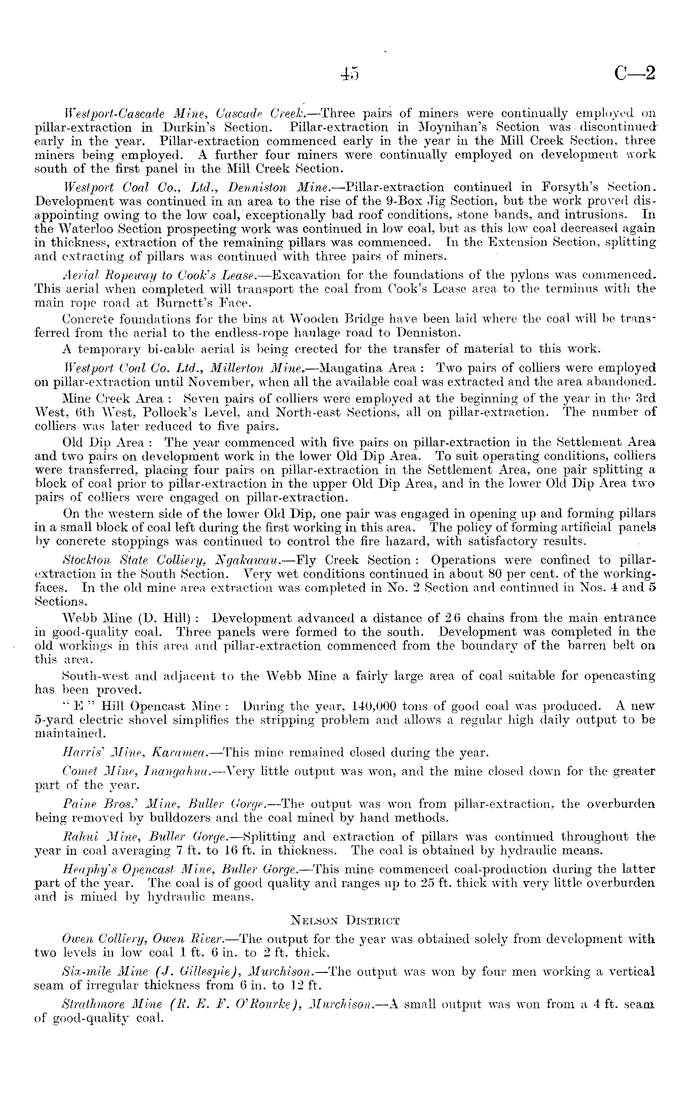 Westport-Cascade Mine, Cascade Greek.—Three pairs of miners were continually employed on pillar-extraction in Durkin's Section. Pillar-extraction in Moynihan's Section was • discontinued early in the year. Pillar-extraction commenced early in the year in the Mill Greek Section, three miners being employed. A further four miners were continually employed on development work south of the first panel in the Mill Creek Section. Westport Goal Co., Ltd., Denniston Mine.—Pillar-extraction continued in Forsyth's Section. Development was continued in an area to the rise of the 9-Box Jig Section, but the work proved disappointing owing to the low coal, exceptionally bad roof conditions, stone bands, and intrusions. In the Waterloo Section prospecting work was continued in low coal, but as this low coal decreased again in thickness, extraction of the remaining pillars was commenced. In the Extension Section, splitting and extracting of pillars was continued with three pairs of miners. Aerial Ropeway to Cook's Lease.—Excavation for the foundations of the pylons was commenced. This aerial when completed will transport the coal from Cook's Lease area to the terminus with the main rope road at Burnett's Pace. Concrete foundations for the bins at Wooden Bridge have been laid where the coal will be transferred from the aerial to the endless-rope haulage road to Denniston. A temporary bi-cable aerial is being erected for the transfer of material to this work. Westport Coal Co. Ltd., Millerton Mine. —Mangatina Area : Two pairs of colliers were employed on pillar-extraction until November, when all the available coal was extracted and the area abandoned. Mine Creek Area : Seven pairs of colliers were employed at the beginning of the year in the 3rd West, 6th West, Pollock's Level, and North-east Sections, all on pillar-extraction. The number of colliers was later reduced to five pairs. Old Dip Area : The year commenced with five pairs on pillar-extraction in the Settlement Area and two pairs on development work in the lower Old Dip Area. To suit operating conditions, colliers were transferred, placing four pairs on pillar-extraction in the Settlement Area, one pair splitting a block of coal prior to pillar-extraction in the upper Old Dip Area, and in the lower Old Dip Area two pairs of colliers were engaged on pillar-extraction. On the western side of the lower Old Dip, one pair was engaged in opening up and forming pillars in a small block of coal left during the first working in this area. The policy of forming artificial panels by concrete stoppings was continued to control the fire hazard, with satisfactory results. Stockton State Colliery, Ngakawau.—Fly Creek Section : Operations were confined to pillarextraction in the South Section. Very wet conditions continued in about 80 per cent, of the workingfaces. In the old mine area extraction was completed in No. 2 Section and continued in Nos. 4 and 5 Sections. Webb Mine (D. Hill) : Development advanced a distance of 26 chains from the main entrance in good-quality coal. Three panels were formed to the south. Development was completed in the old workings in this area and pillar-extraction commenced from the boundary of the barren belt on this area. South-west and adjacent to the Webb Mine a fairly large area of coal suitable for opencasting has been proved. "E " Hill Opencast Mine : During the year, 140,000 tons of good coal was produced. A new 5-yard electric shovel simplifies the stripping problem and allows a regular high daily output to be maintained. Harris' Mine, Karamea. —This mine remained closed during the year. Comet Mine, Inangahua.—Very little output was won, and the mine closed down for the greater part of the year. Paine Bros.'' Mine, Butter Gorge.—The output was won from pillar-extraction, the overburden being removed by bulldozers and the coal mined by hand methods. Rahui Mine, Butter Gorge.—Splitting and extraction of pillars was continued throughout the year in coal averaging 7 ft. to 16 ft. in thickness. The coal is obtained by hydraulic means. Heaphy's Opencast Mine, Butter Gorge.—This mine commenced coal-production during the latter part of the year. The coal is of good quality and ranges up to 25 ft. thick with very little overburden and is mined' by hydraulic means. Nelson District Owen Colliery, Owen River. —The output for the year was obtained solely from development with two levels in low coal 1 ft. 6 in. to 2 ft. thick. Six-mile Mine (J. Gillespie), Murchison. —The output was won by four men working a vertical seam of irregular thickness from 6 in. to 12 ft. Strathmore Mine (R. E. F. O'Rourke), Murchison.—A small output was won from a 4 ft. seam of good-quality coal.